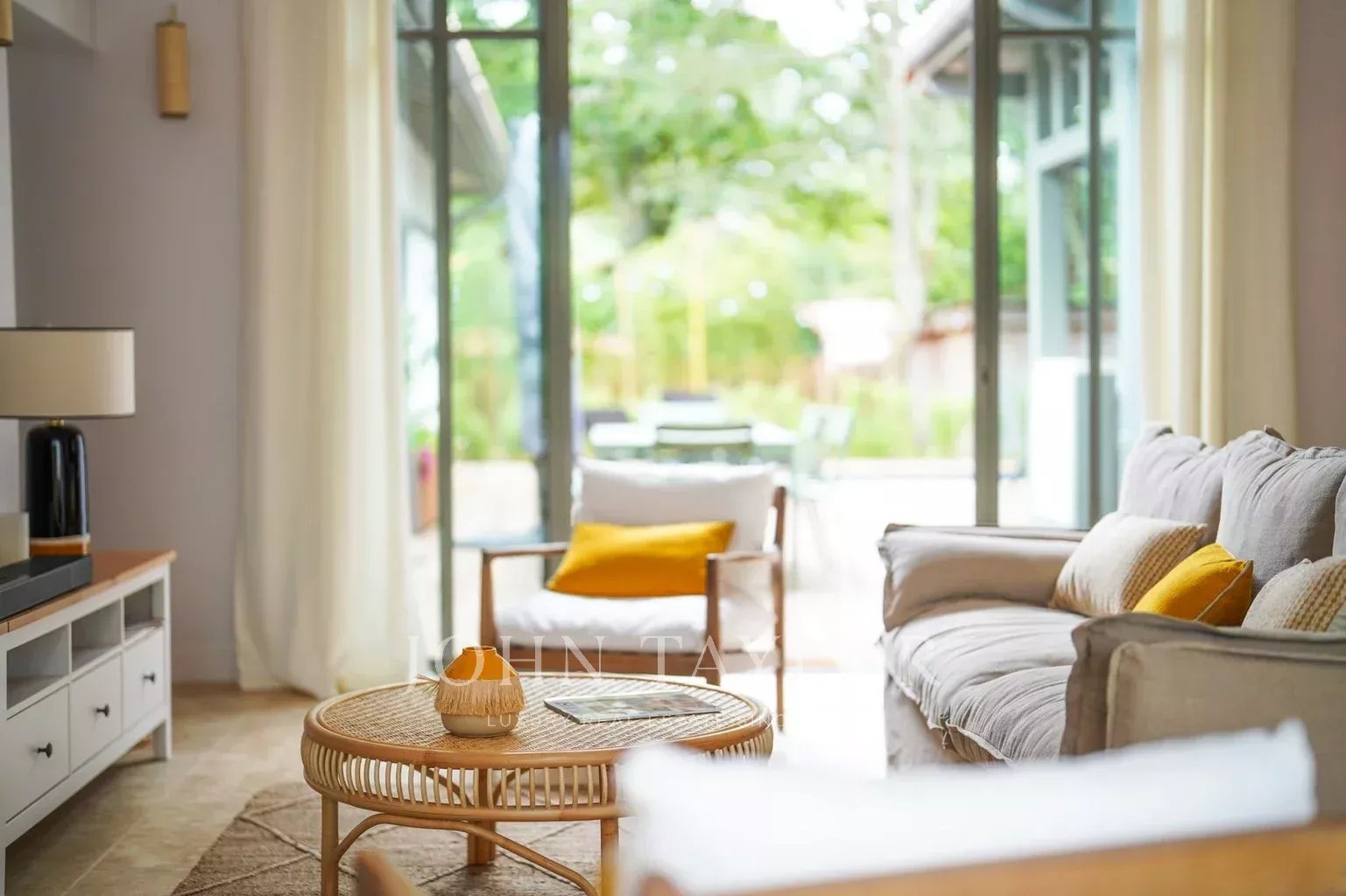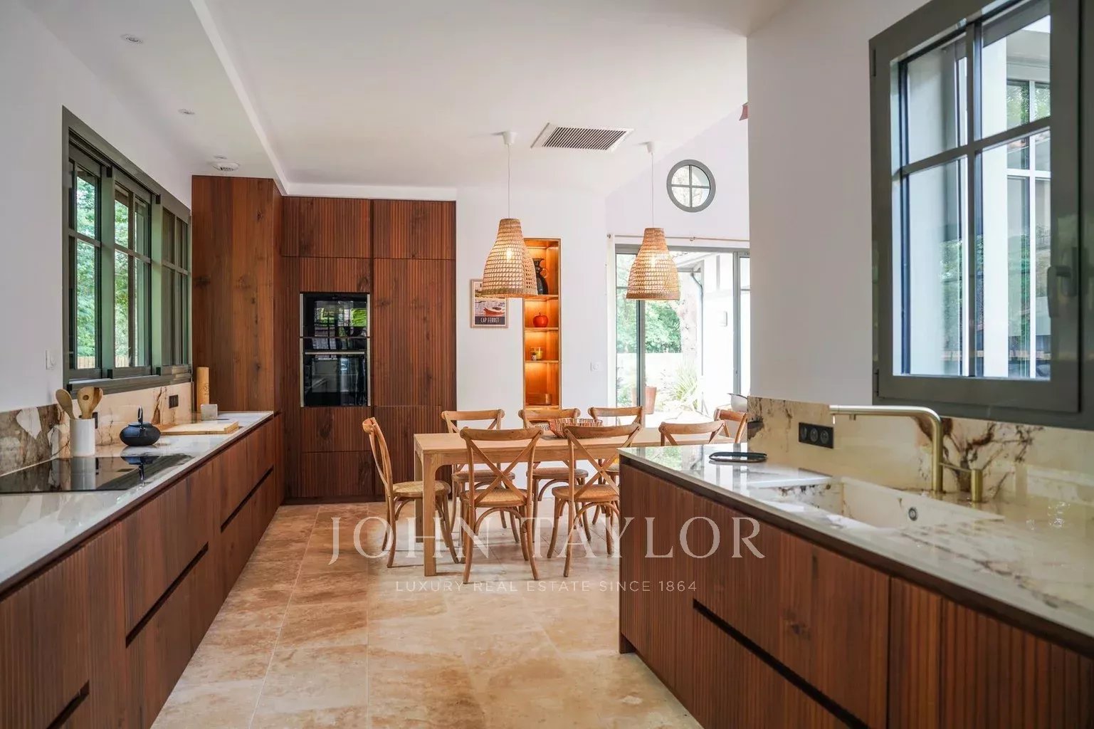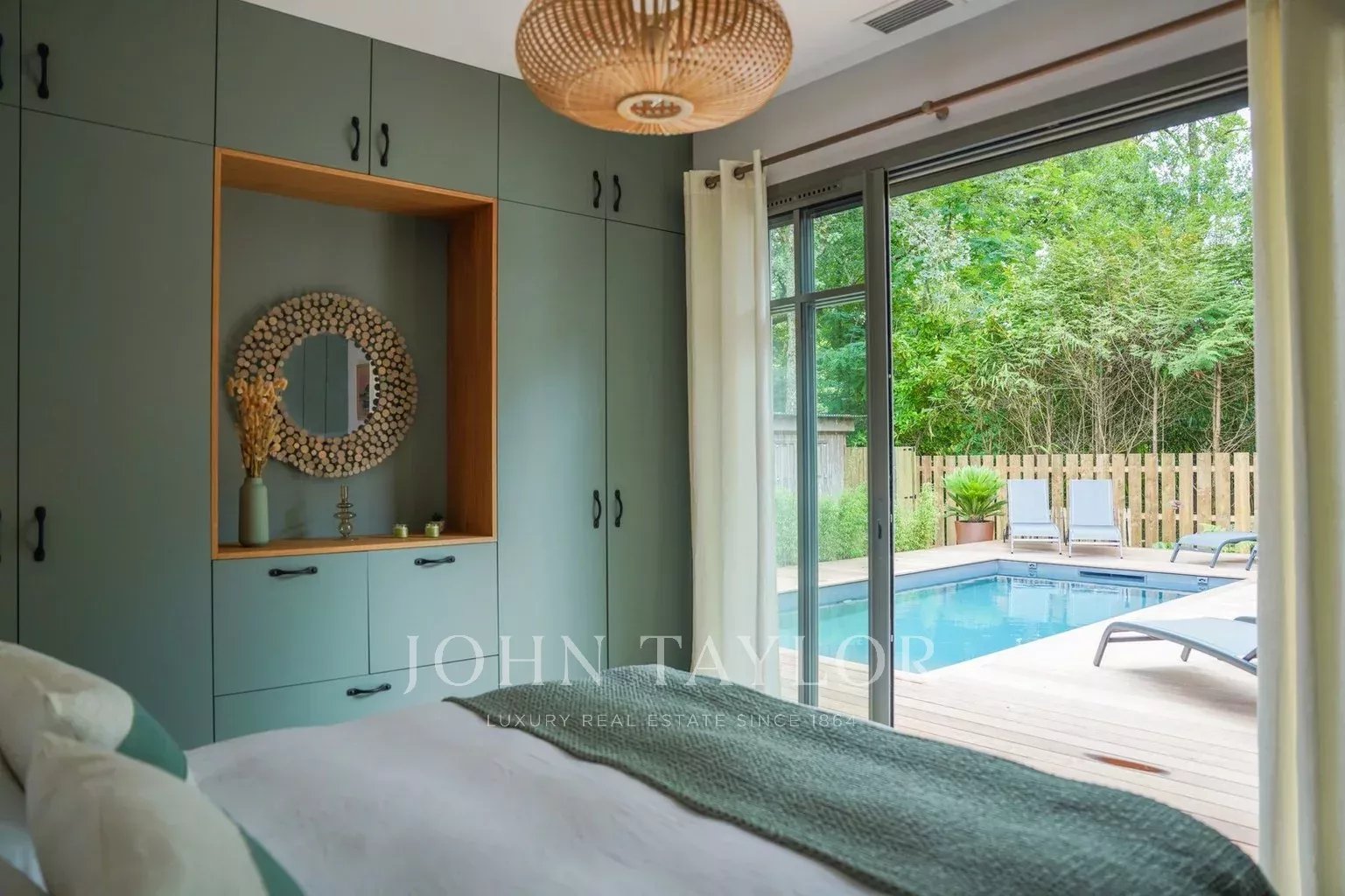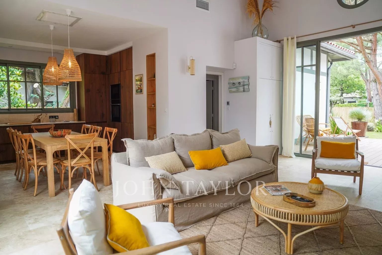 Deux terrasses exposées est et ouest permettent de profiter du soleil à toute heure de la journée. Les extérieurs proposent une piscine chauffée de 6 x 2,5 m sécurisée par volet roulant immergé, une cuisine d’été avec plancha et évier, un WC extérieur ainsi qu’un terrain de pétanque éclairé par des lumières guinguette. Le mobilier de jardin FERMOB comprend une grande table pour 10 à 12 personnes, des bains de soleil et un salon de jardin.