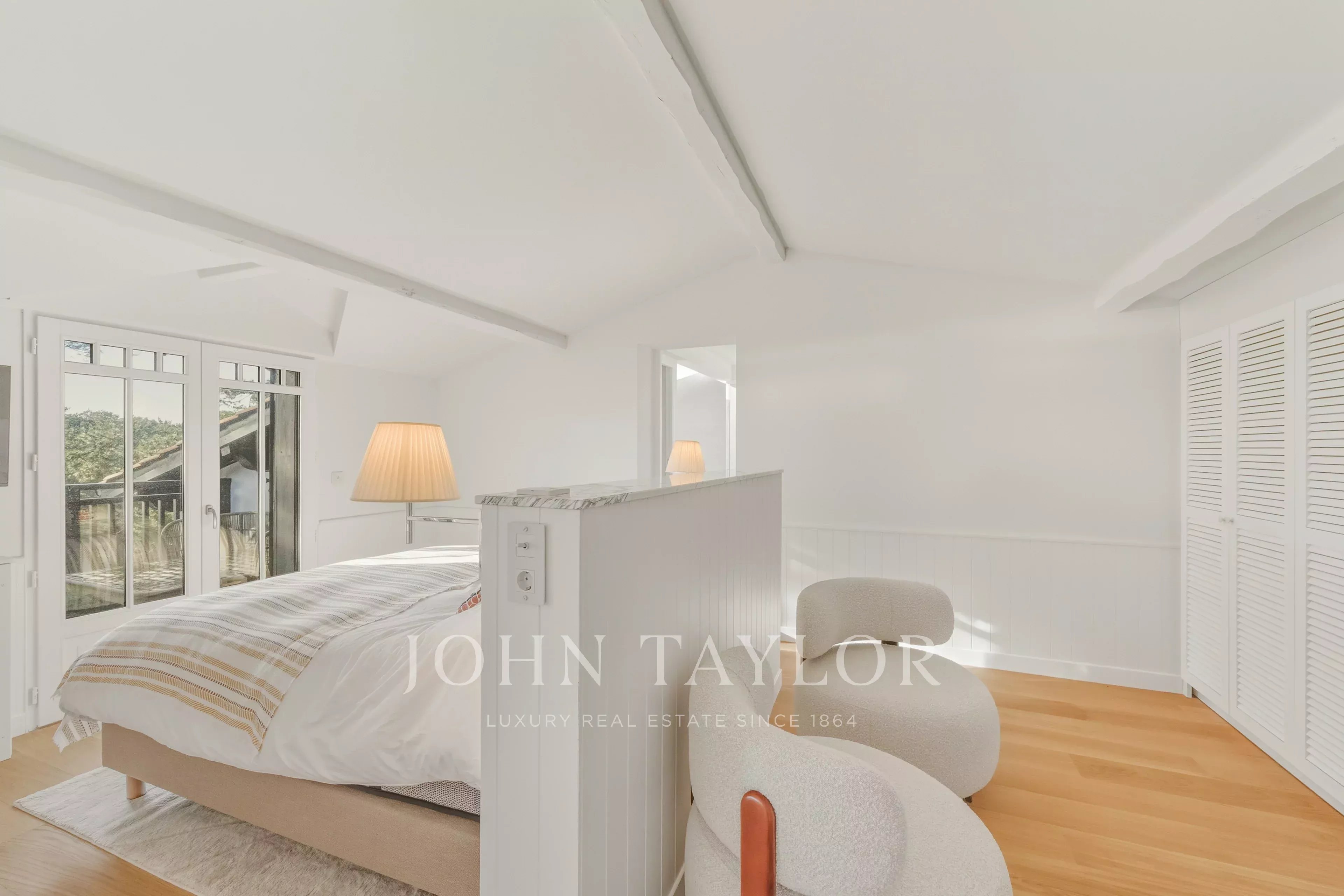 Dès l’arrivée, le regard est immédiatement capté par la vue dégagée sur le bassin, véritable tableau vivant qui évolue au fil des marées. La villa, parfaitement intégrée à son environnement, séduit par la qualité de ses prestations et l’atmosphère apaisante qui s’en dégage. Les espaces intérieurs, baignés de lumière naturelle, s’ouvrent généreusement sur l’extérieur, créant une continuité harmonieuse entre dedans et dehors.
