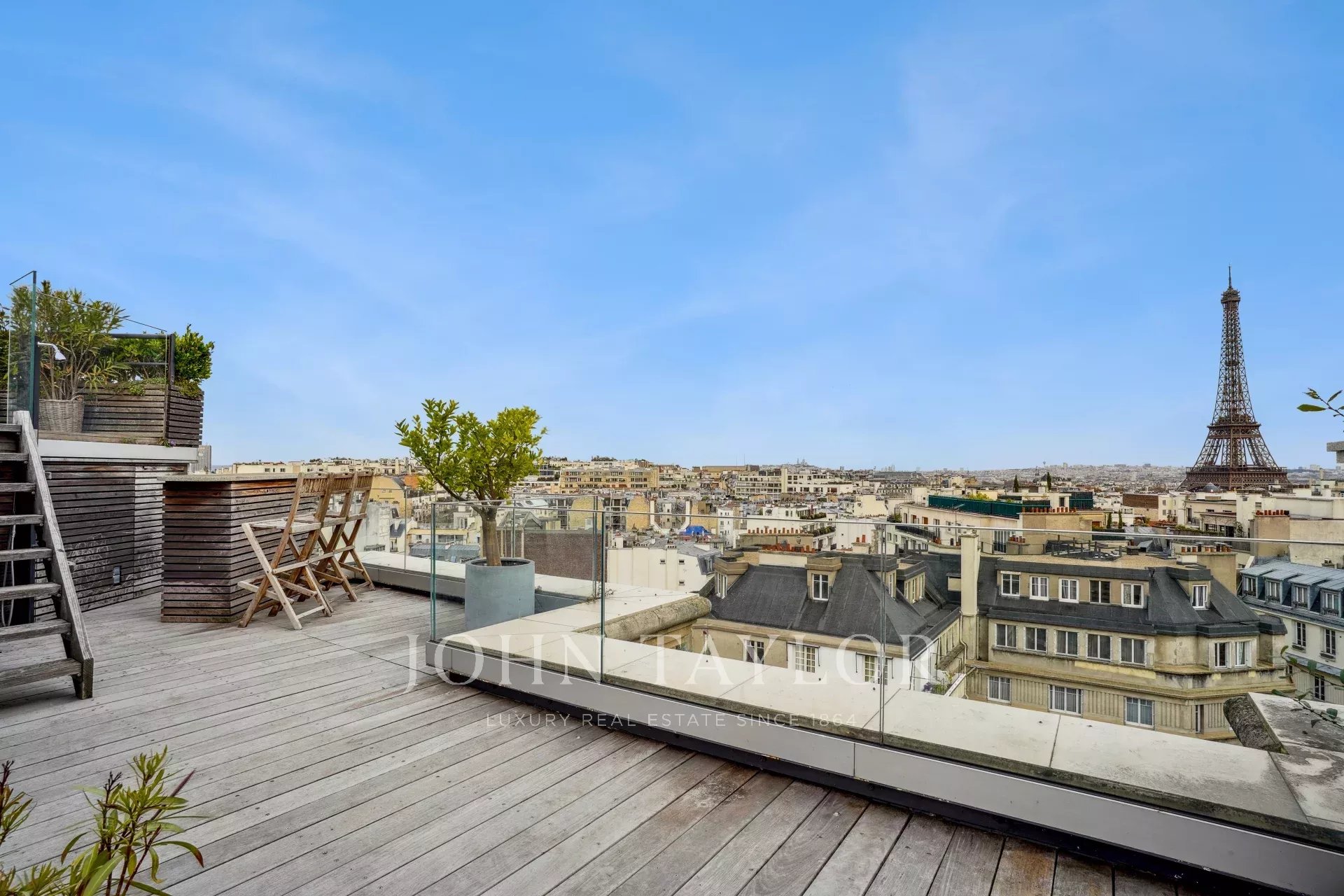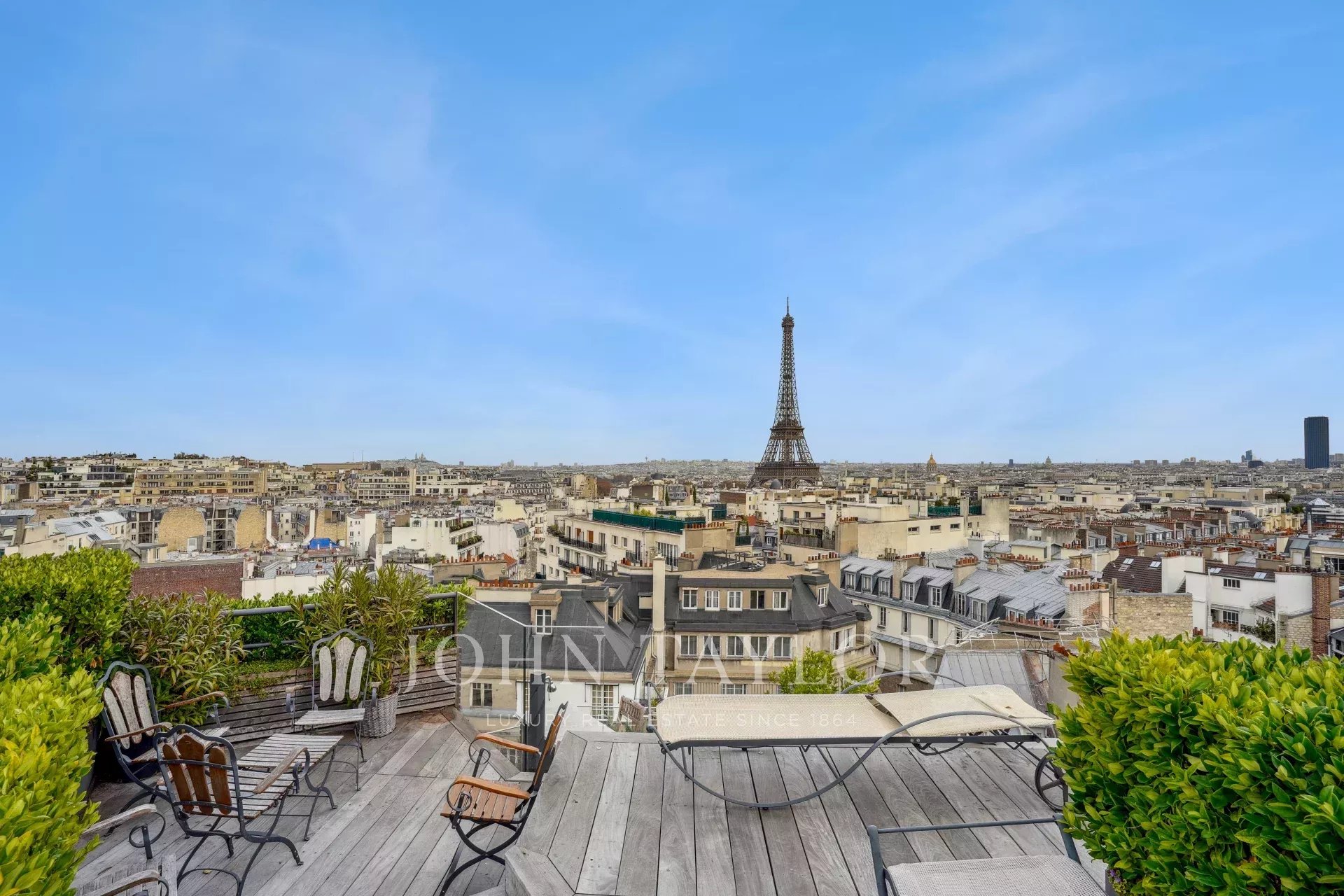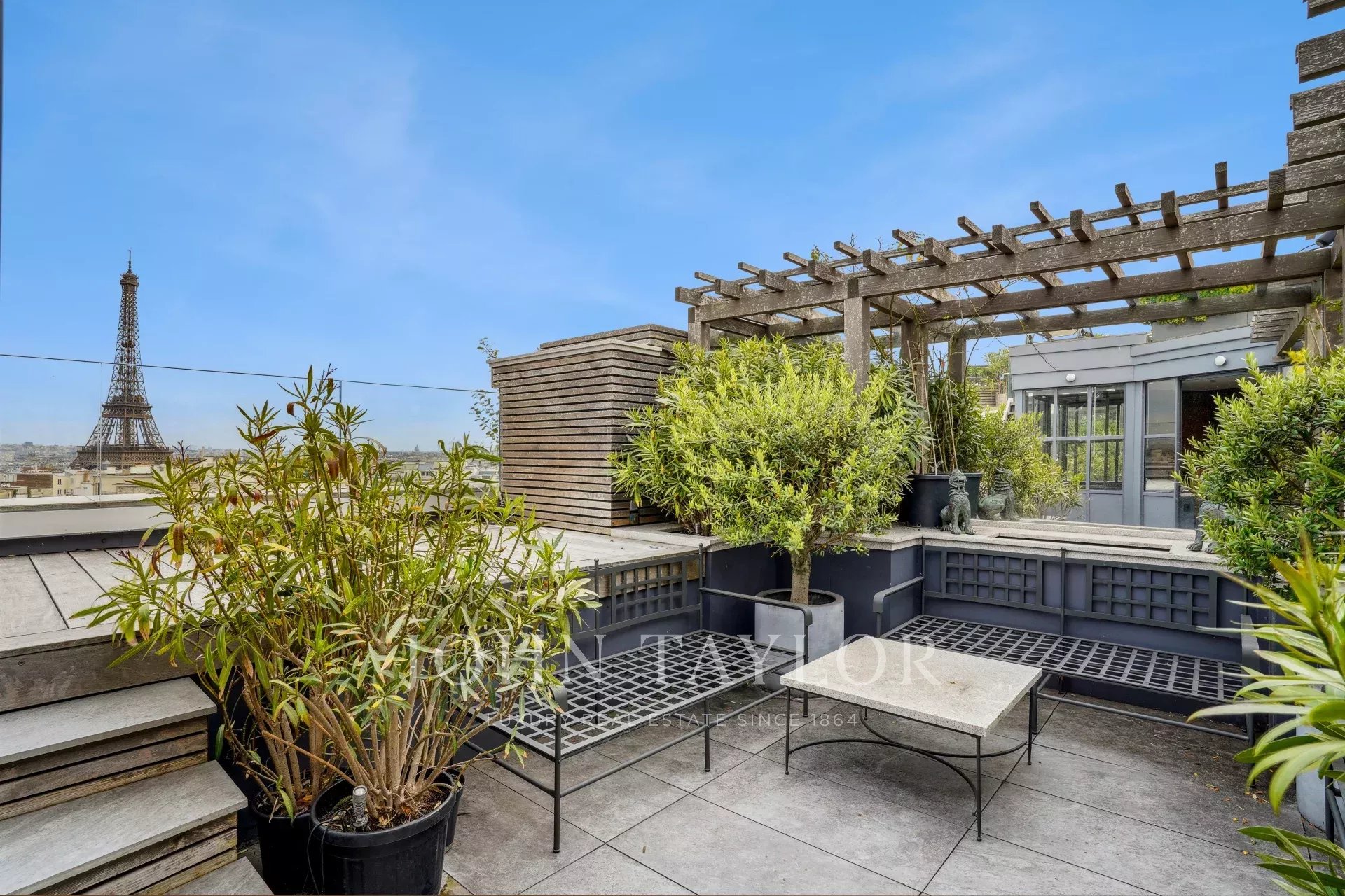 - une pièce comportant une cuisine d’été entièrement équipée s’ouvrant sur un magnifique roof top végétalisé avec bar, bain de soleil et salon de jardin, le tout avec une vue imprenable sur Paris et la Tour Eiffel.
