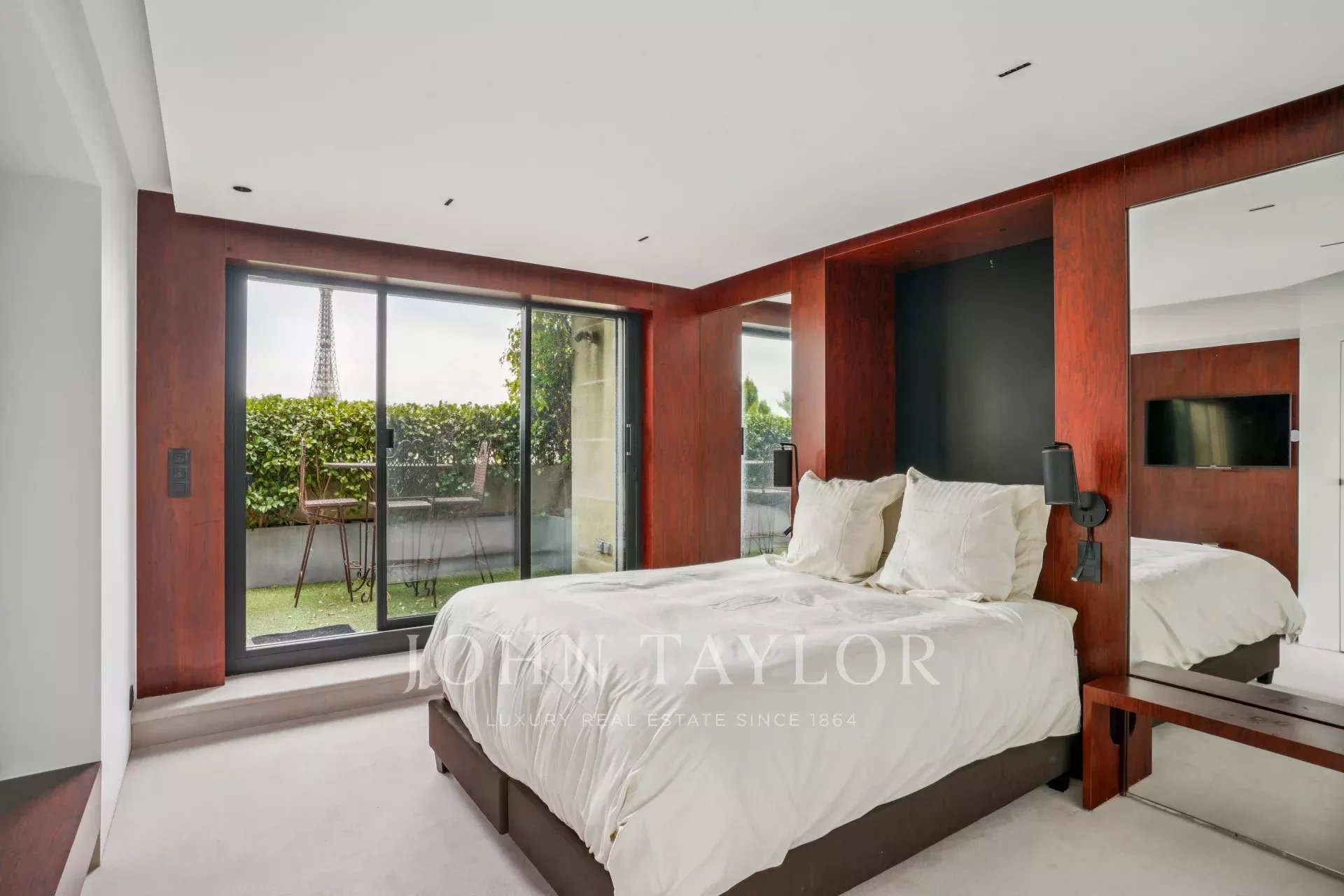 -la chambre principale avec son dressing intégré, une terrasse et une vue exceptionnel sur la Tour Eiffel,