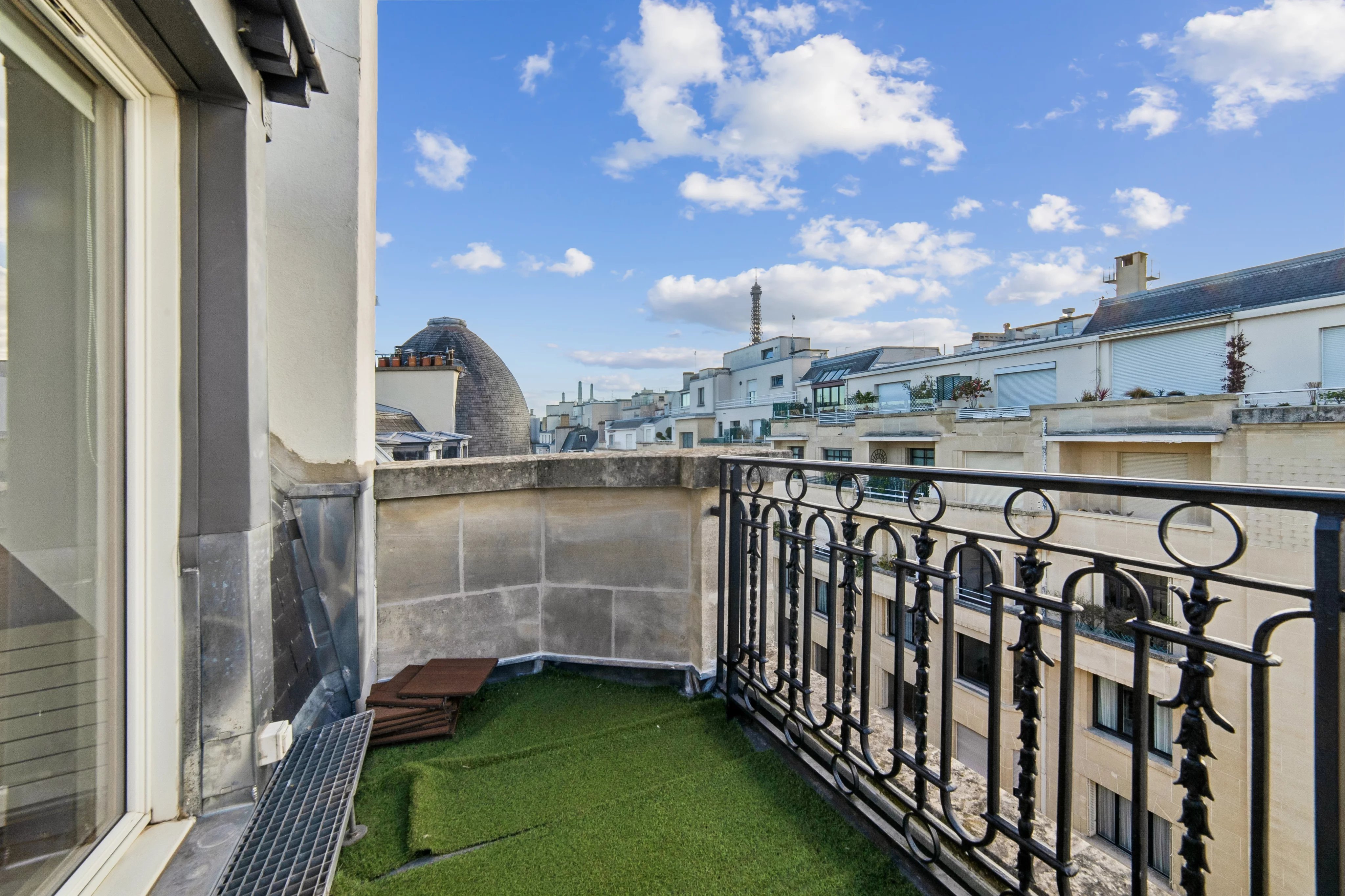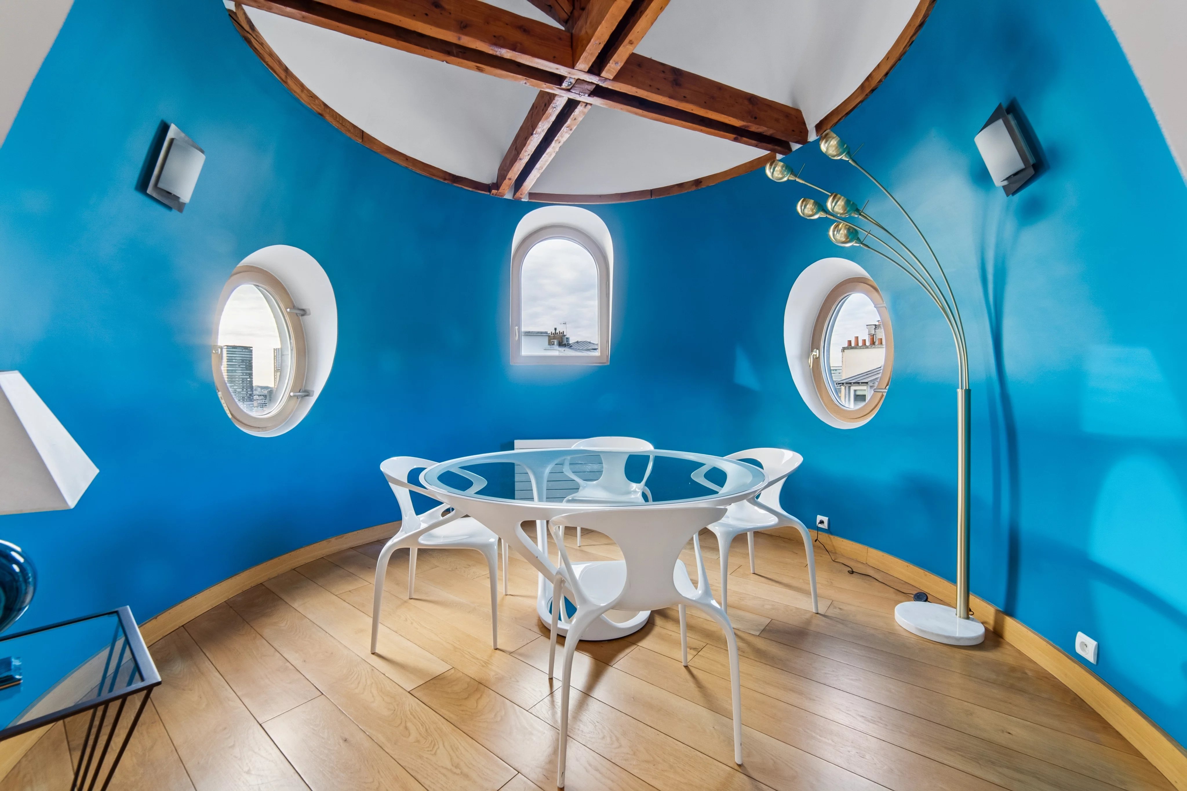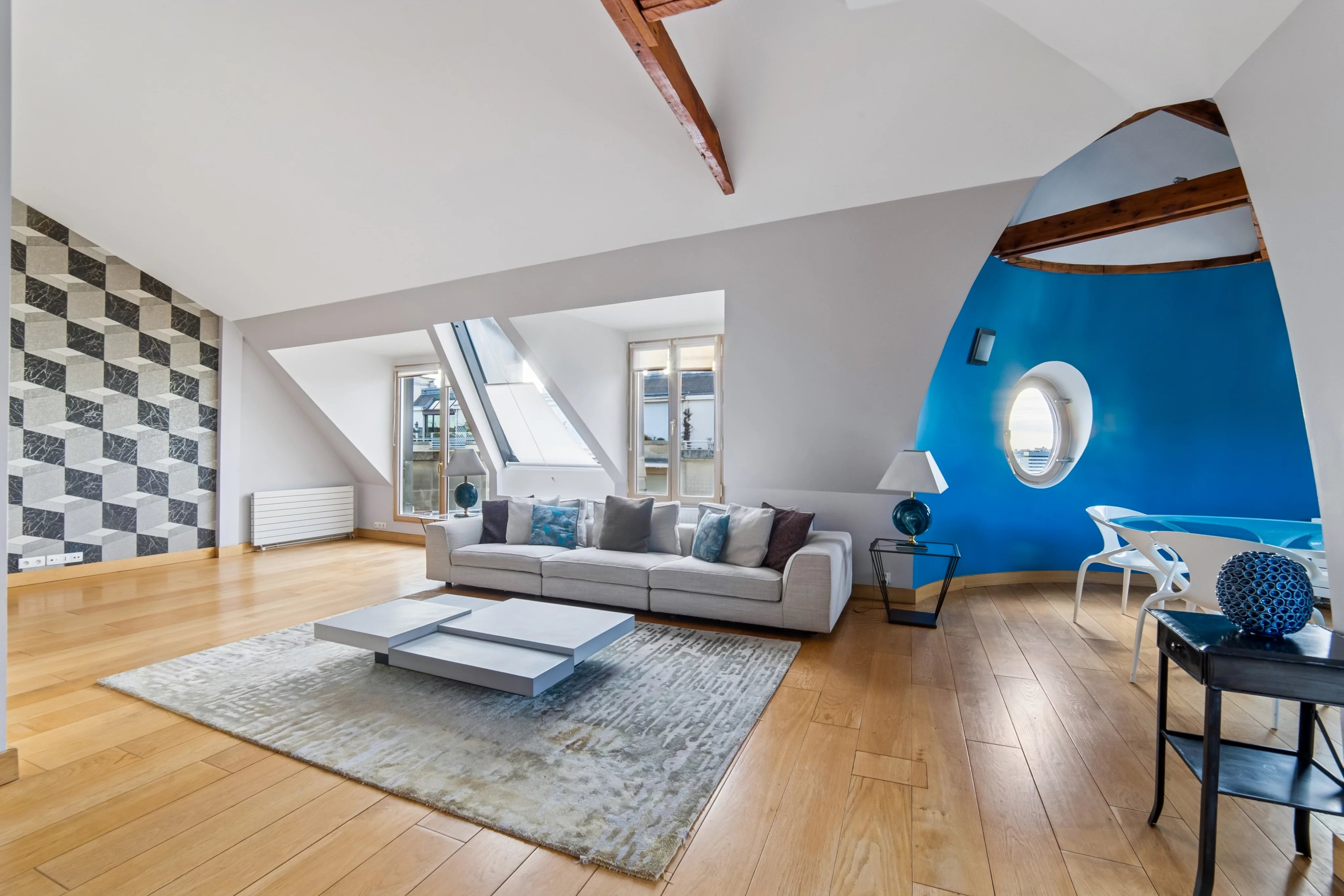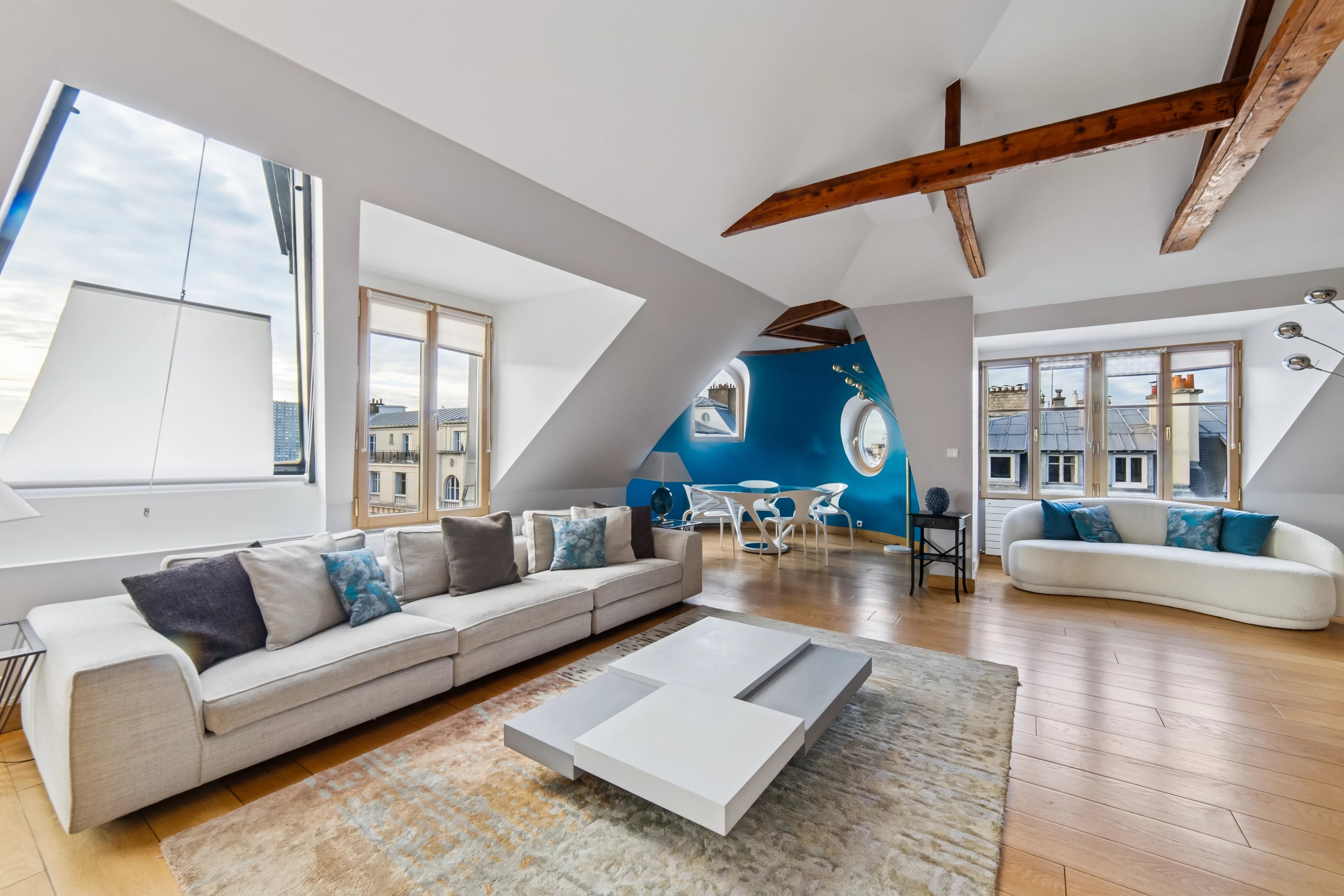 - une grande pièce de vie avec une salle à manger en rotonde bénéficiant de 2 terrasses de plain pied sans vis-à-vis, avec une vue Tour Eiffel et la Seine.