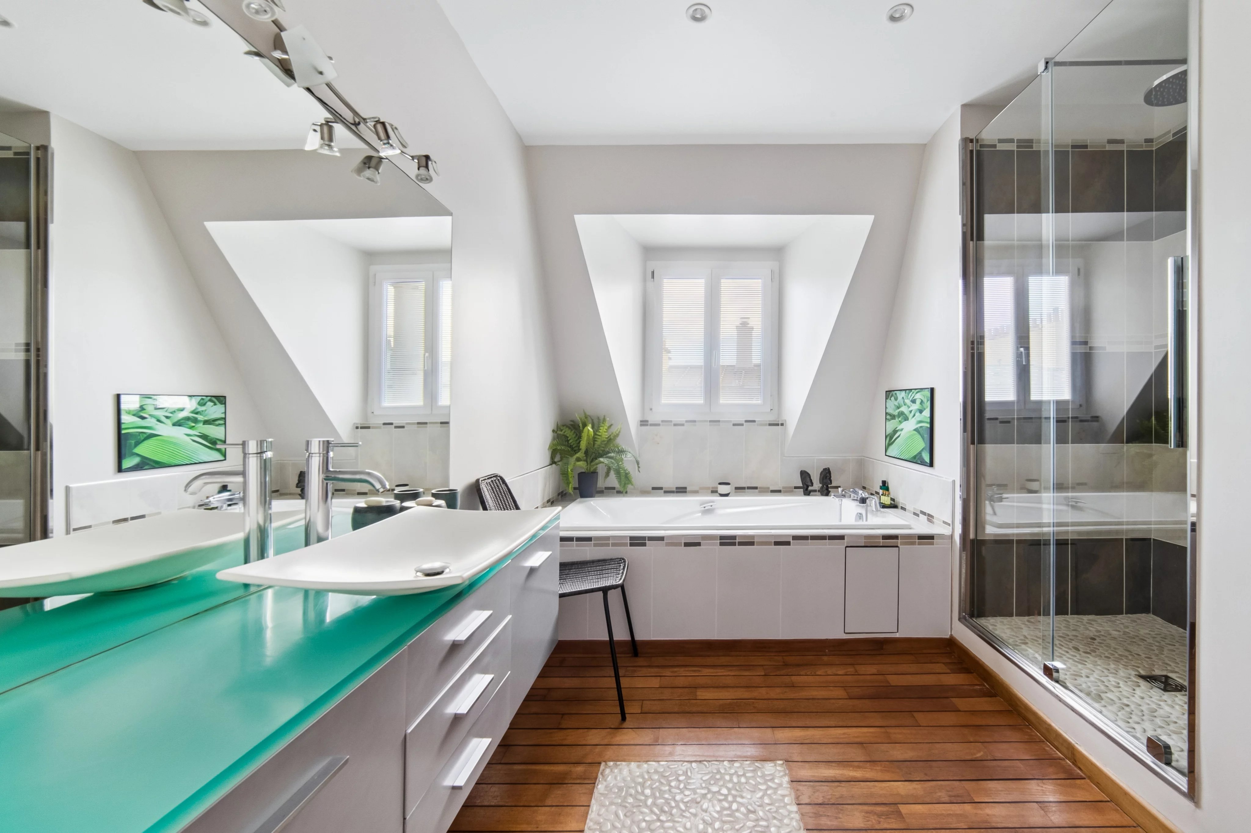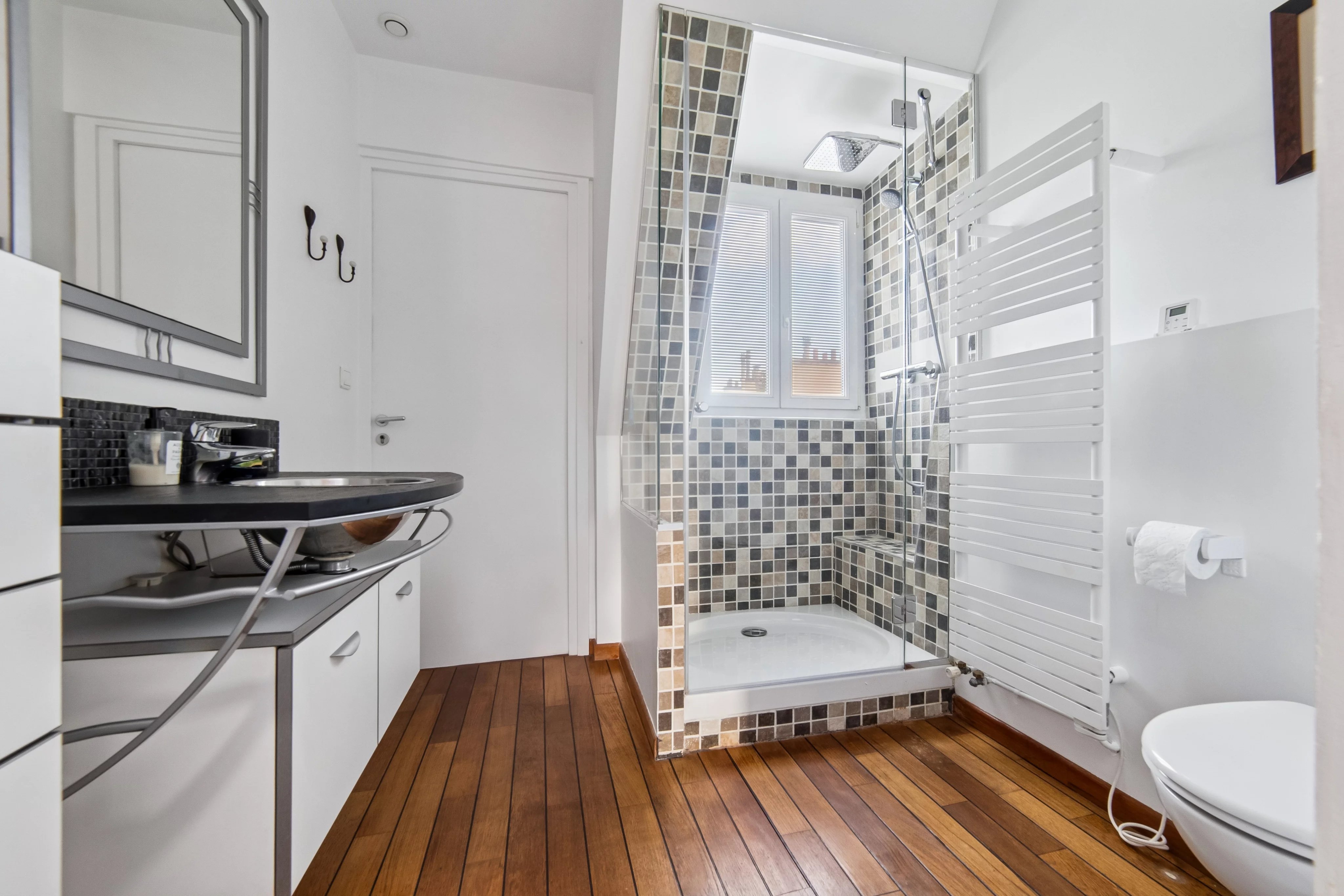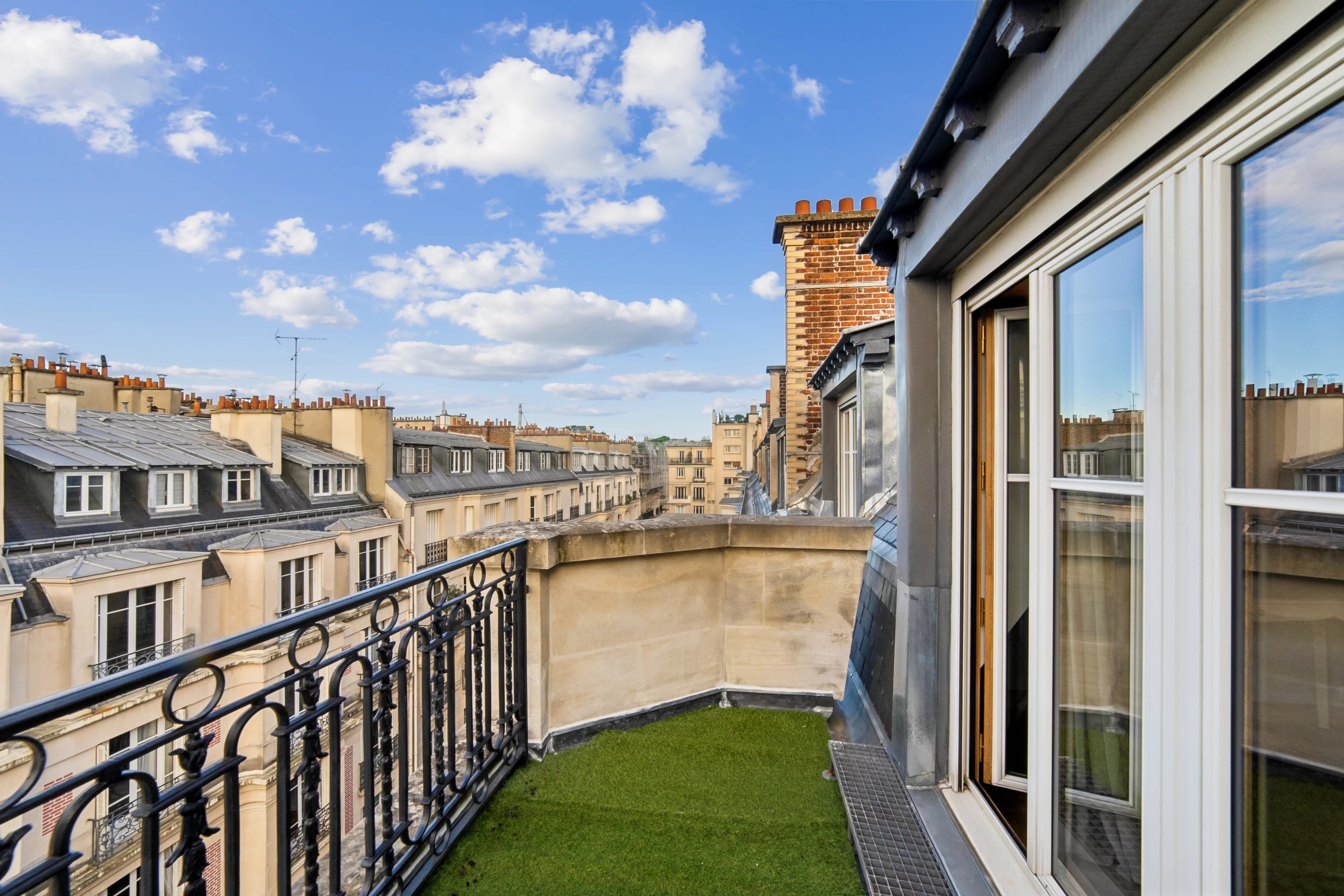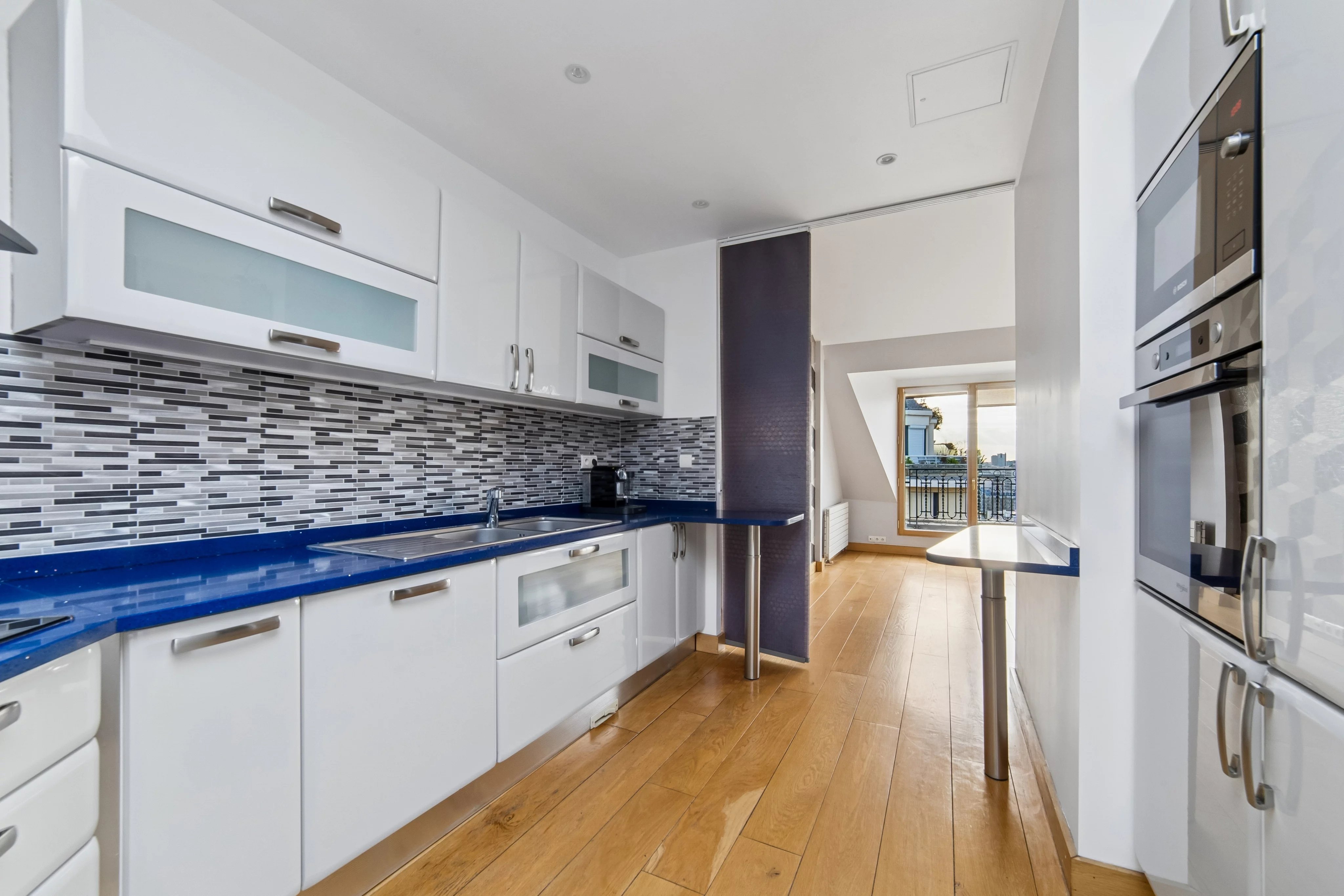 - une grande pièce de vie avec une salle à manger en rotonde bénéficiant de 2 terrasses de plain pied sans vis-à-vis, avec une vue Tour Eiffel et la Seine.