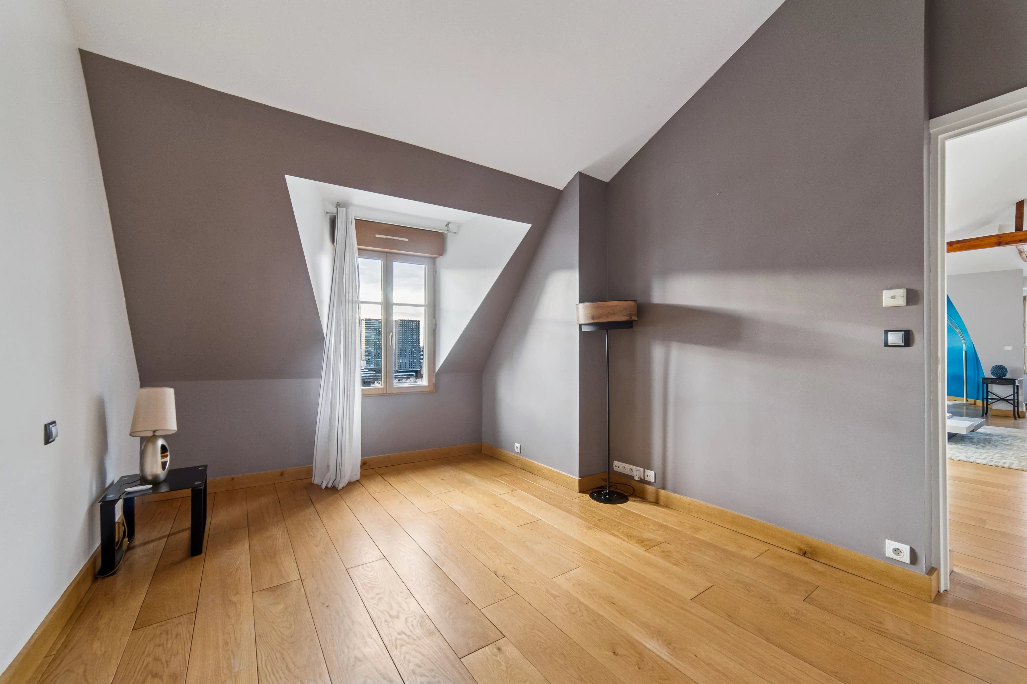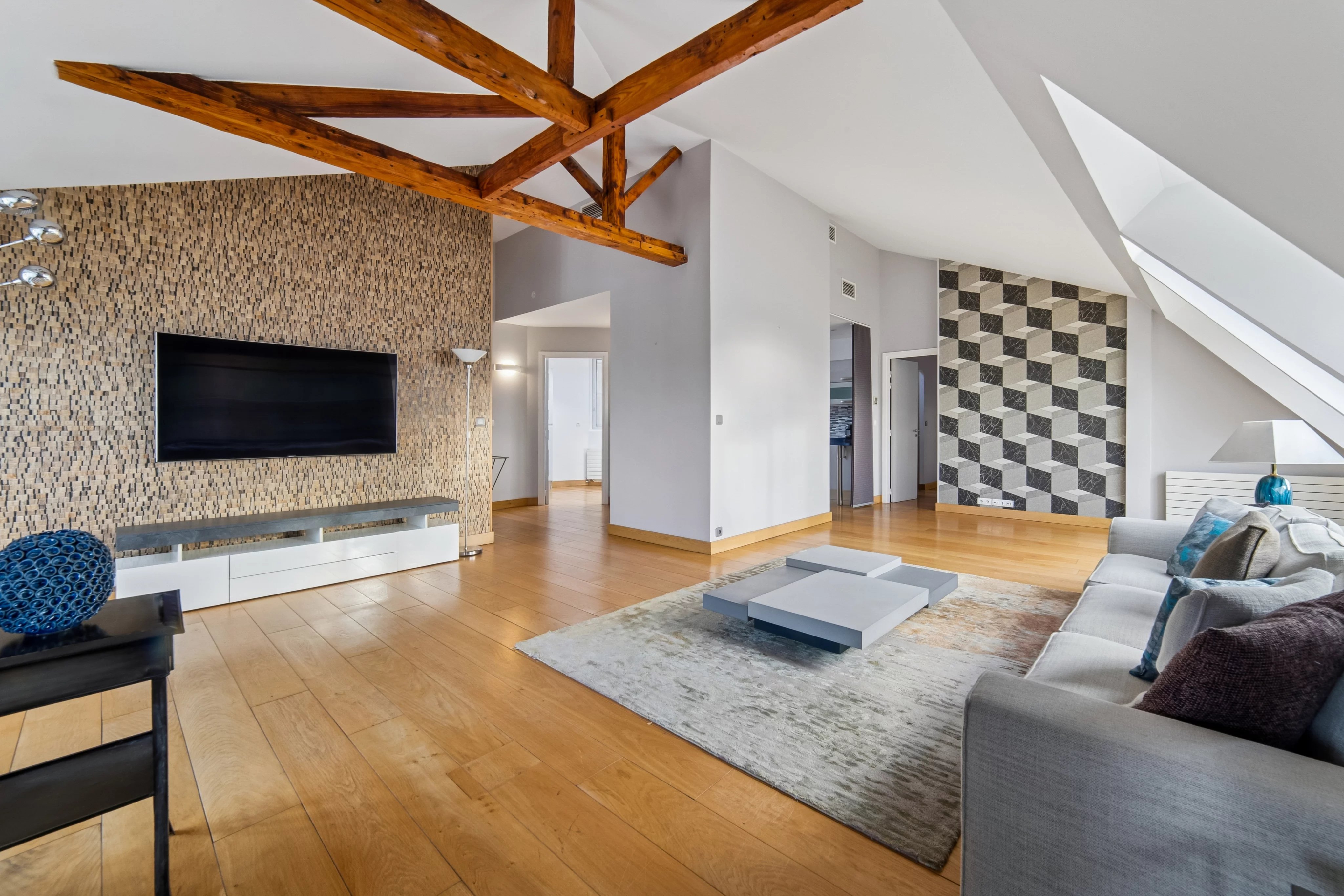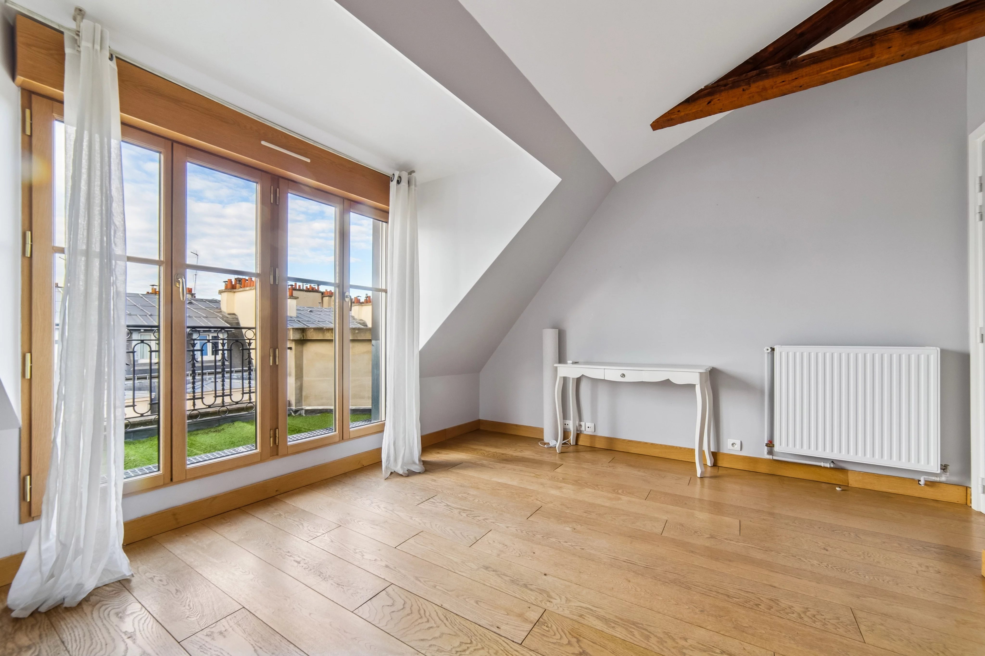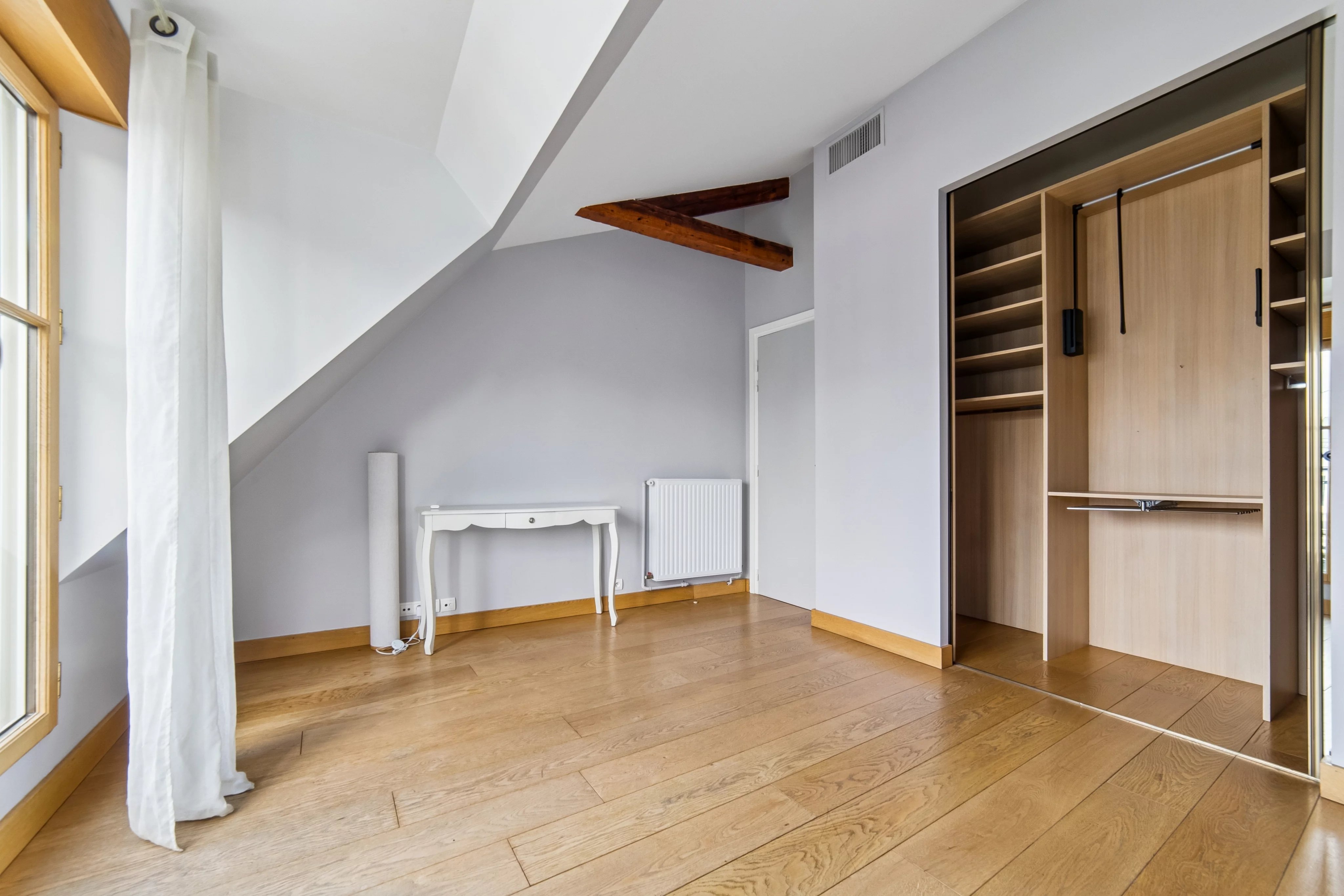appartement traversant exposé EST/OUEST, très lumineux et ensoleillé, parquet, poutres apparentes, sans vis à vis, vues dégagées.