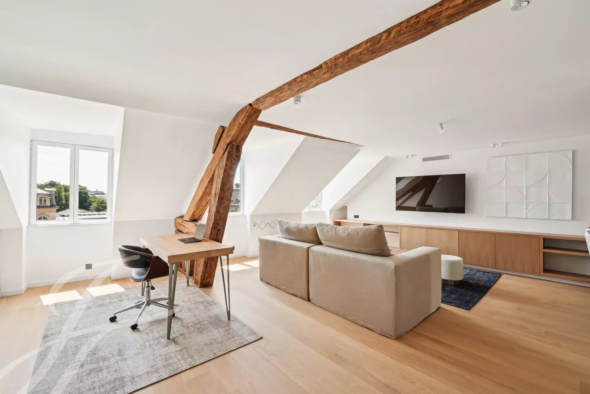 Découvrez ce superbe appartement au cinquième étage d'un prestigieux immeuble en pierre de taille, offrant une vue imprenable sur le palais de l'Élysée et la Tour Eiffel.
