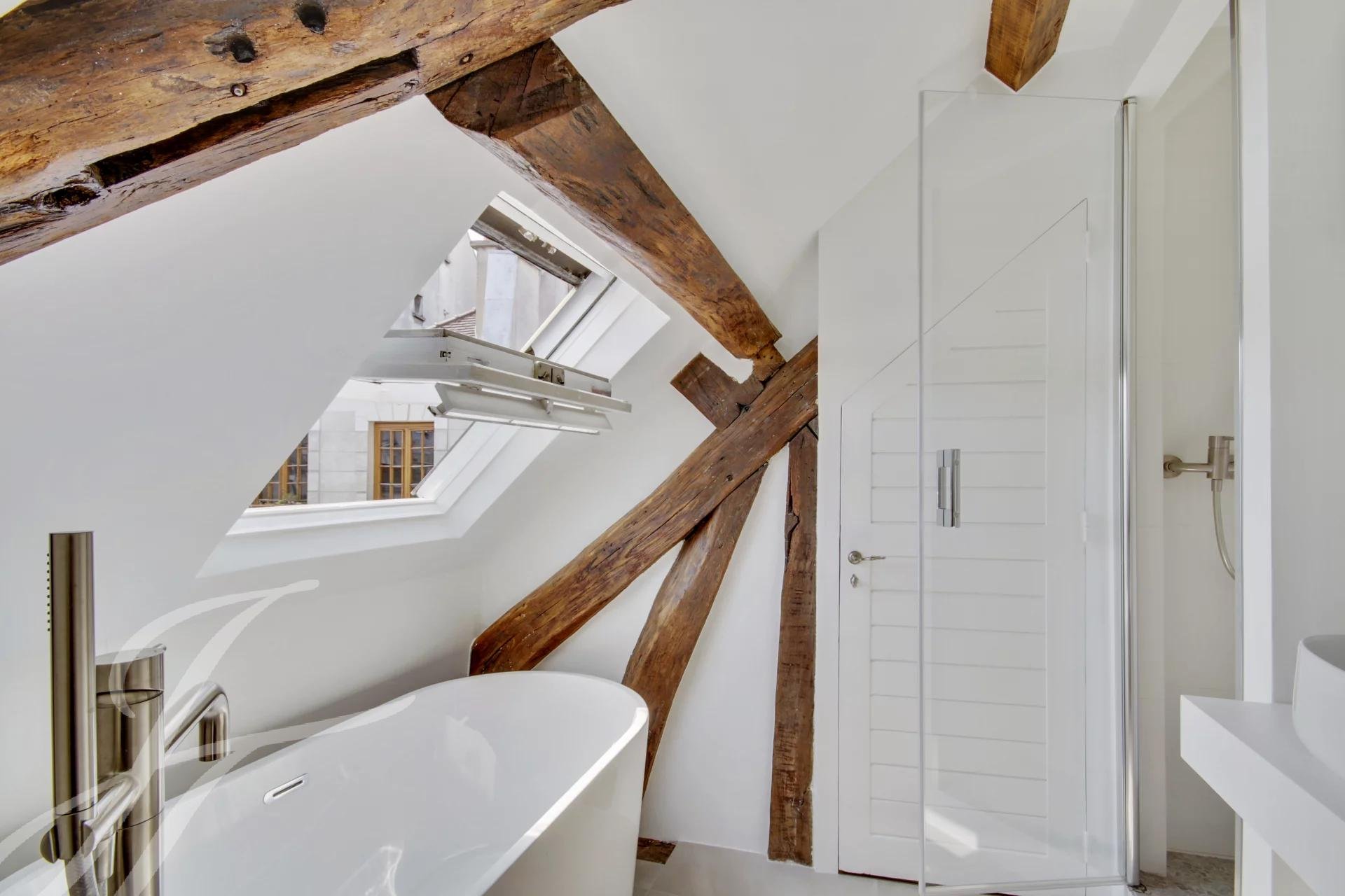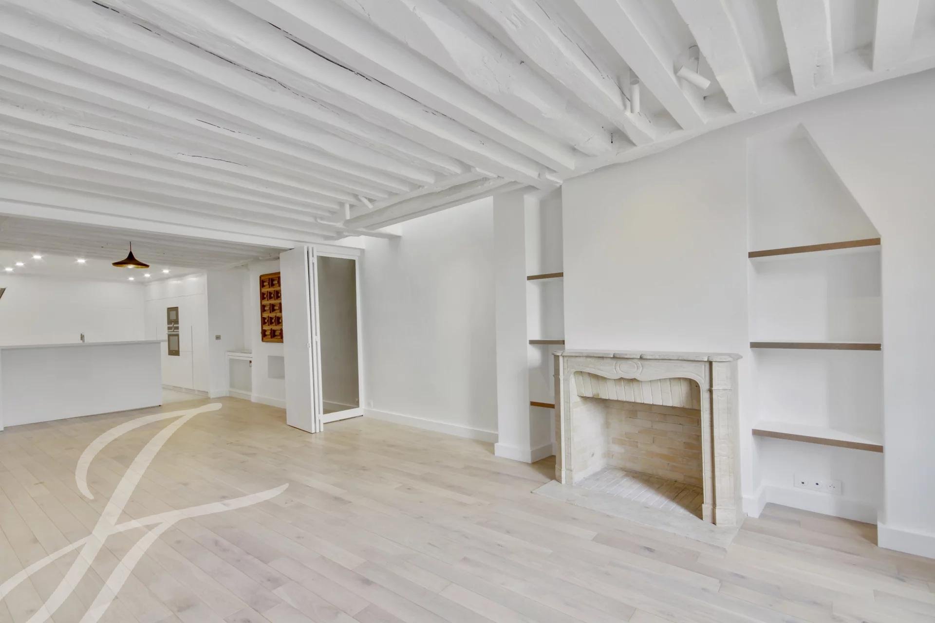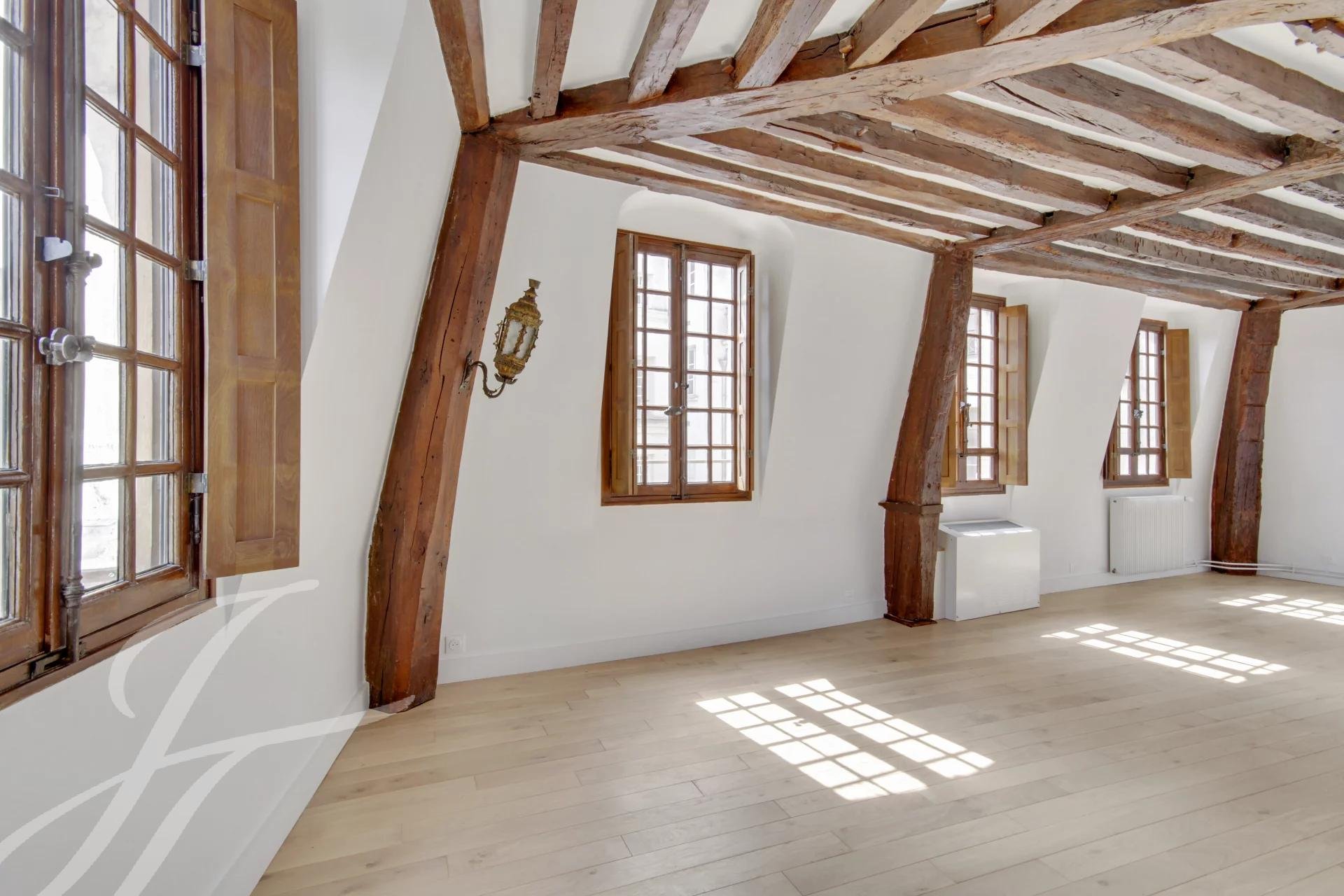 Rue Saint-Julien-le-Pauvre, un appartement refait à neuf d'une superficie au sol habitable de 134 m² et 113 m² en loi Boutin, au troisième étage d'un hôtel particulier du 17ème siècle, avec ascenseur et digicode.
