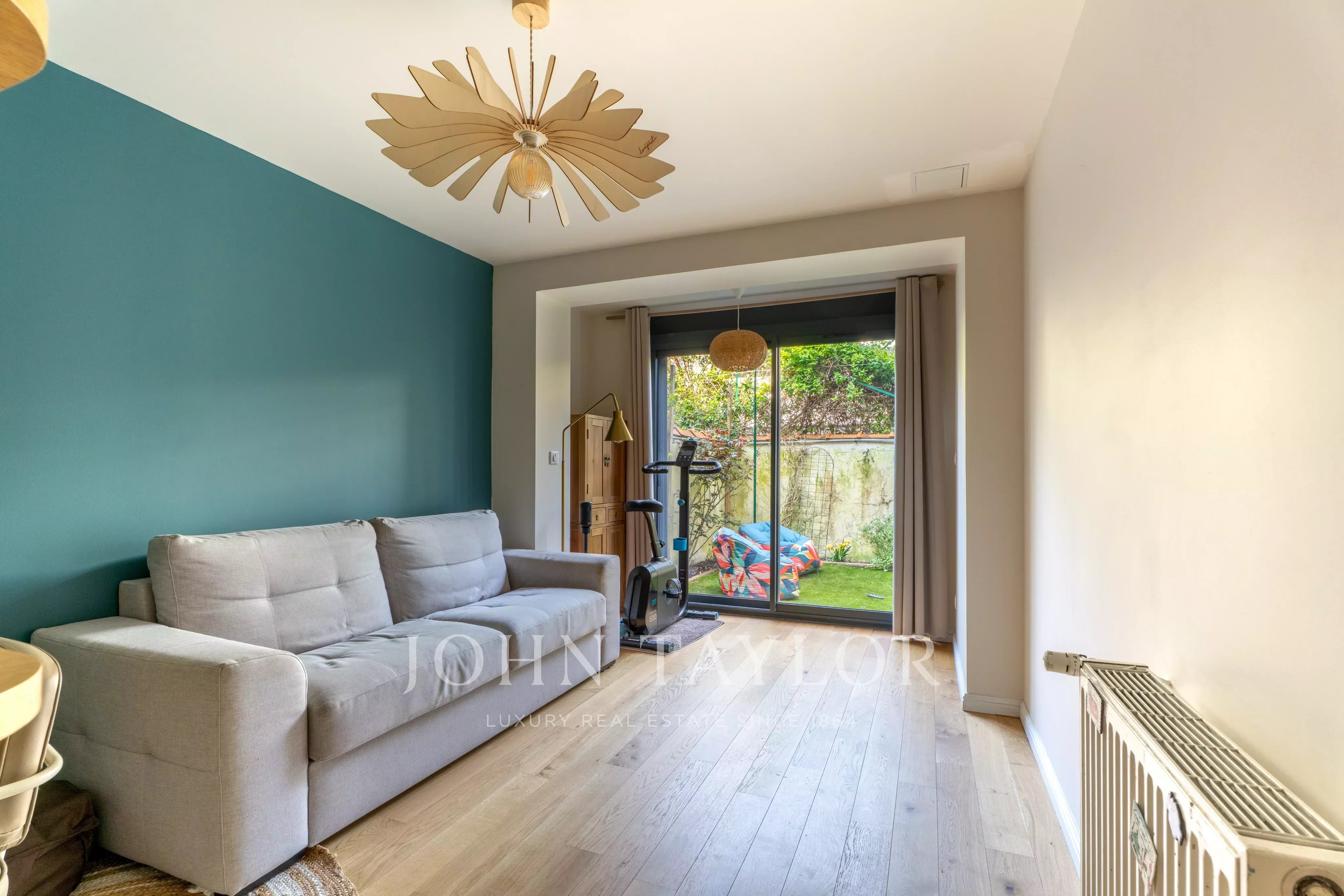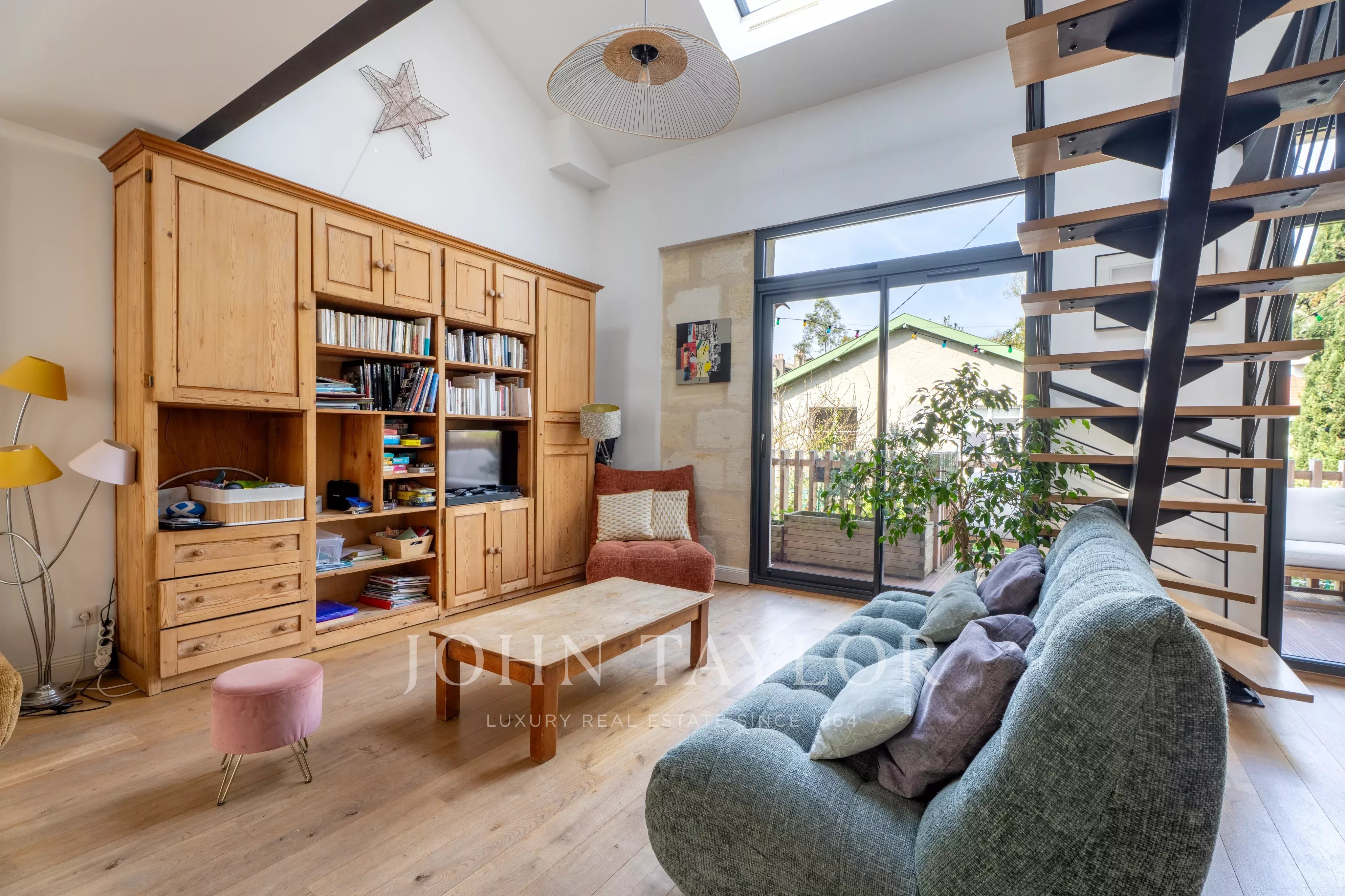 Le séjour s’ouvre directement sur une agréable terrasse arborée, aménagée avec un salon de jardin et un espace barbecue, idéale pour profiter des beaux jours.
