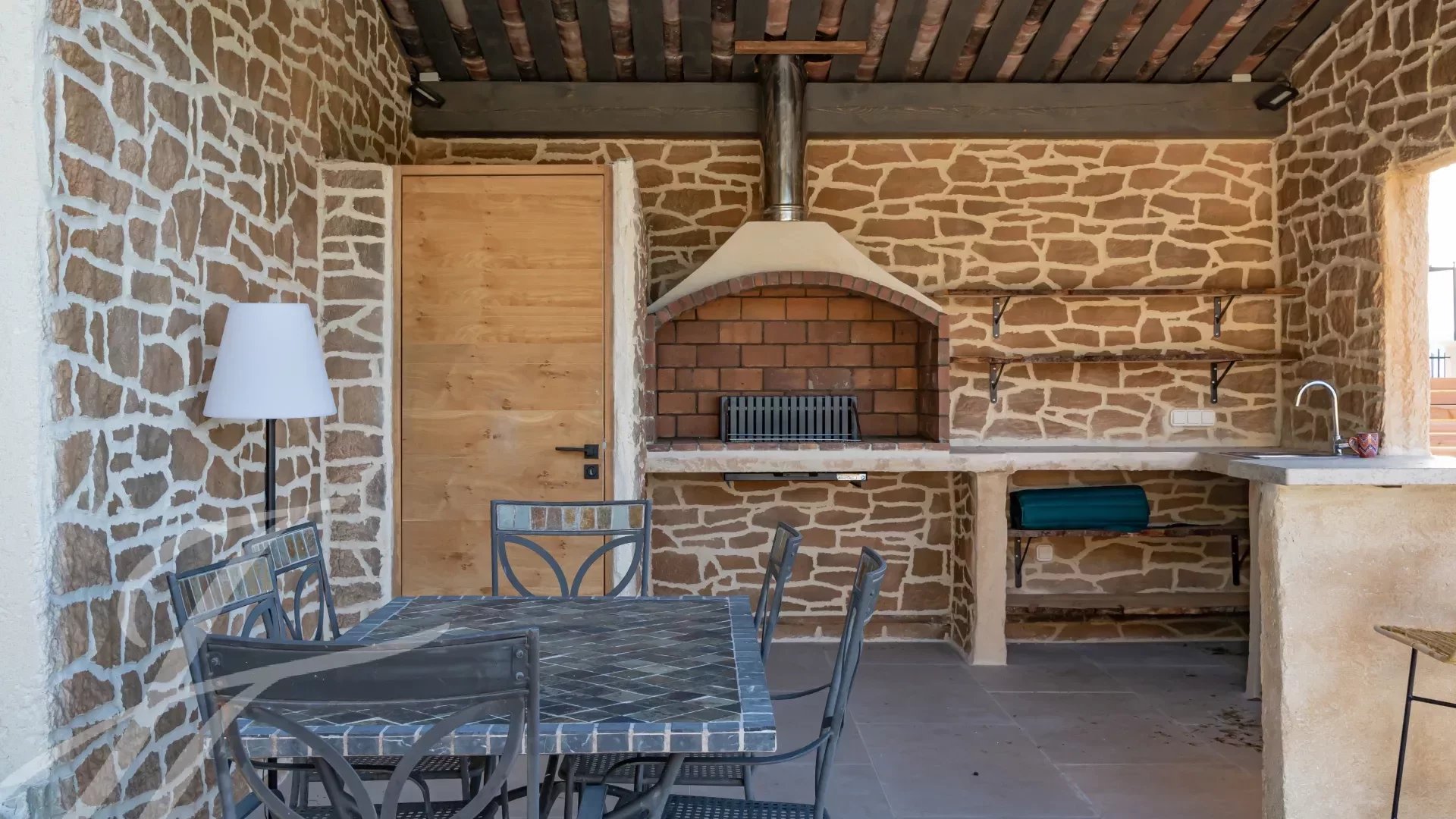 Une belle pièce conviviale avec de jolis murs en pierres, et un coin bar/détente.