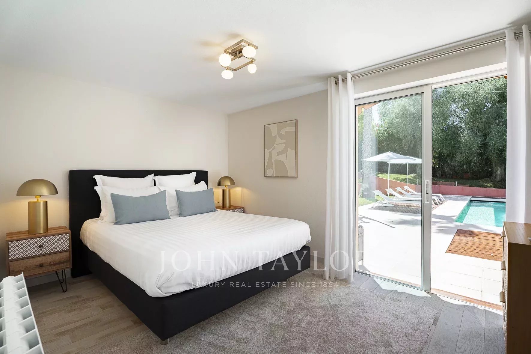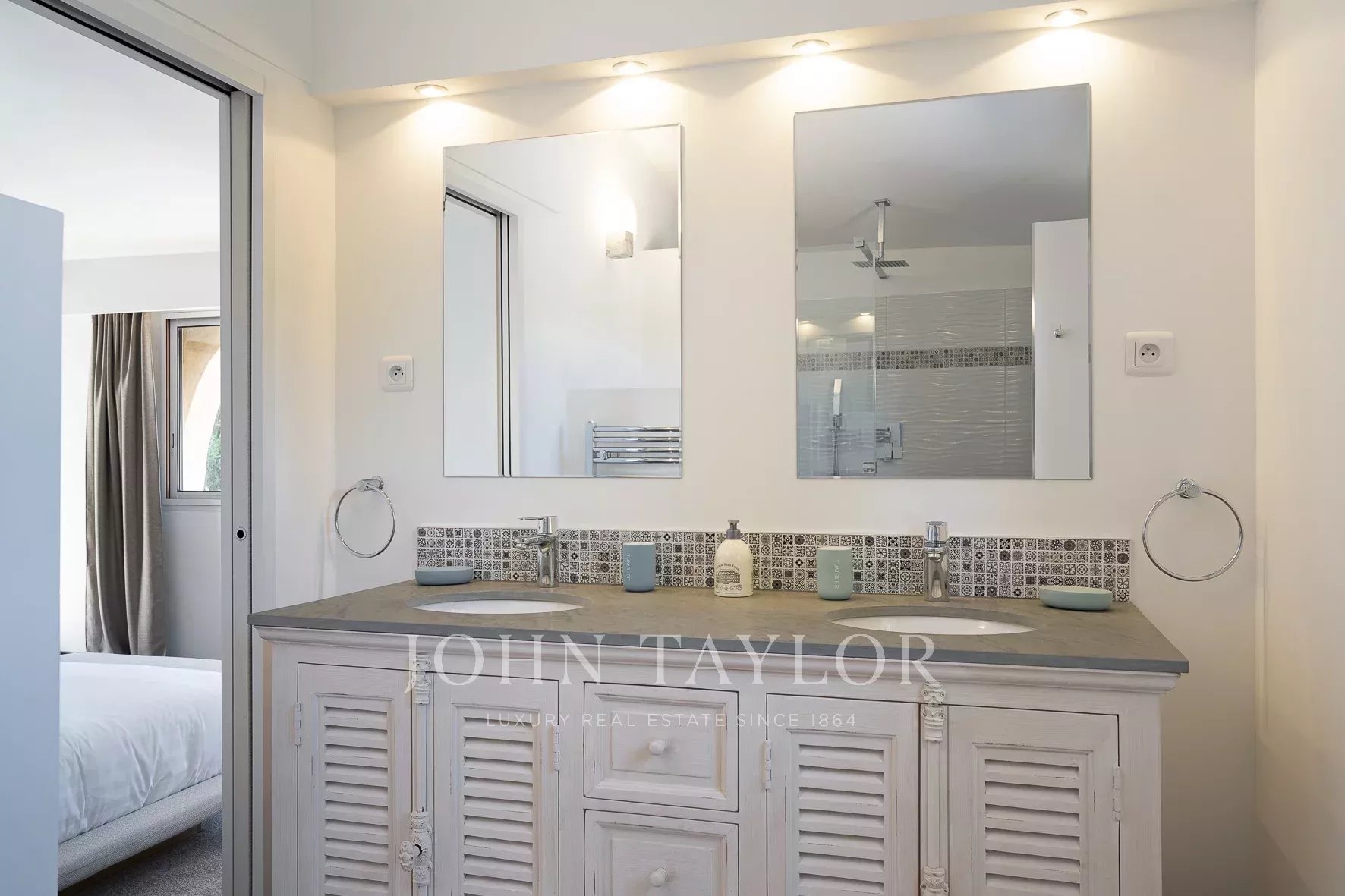 Chambre de maitre : lit double (180 cm), salle de douche (lavabo double vasque, douche, WC), 2 terrasses privatives, placards.