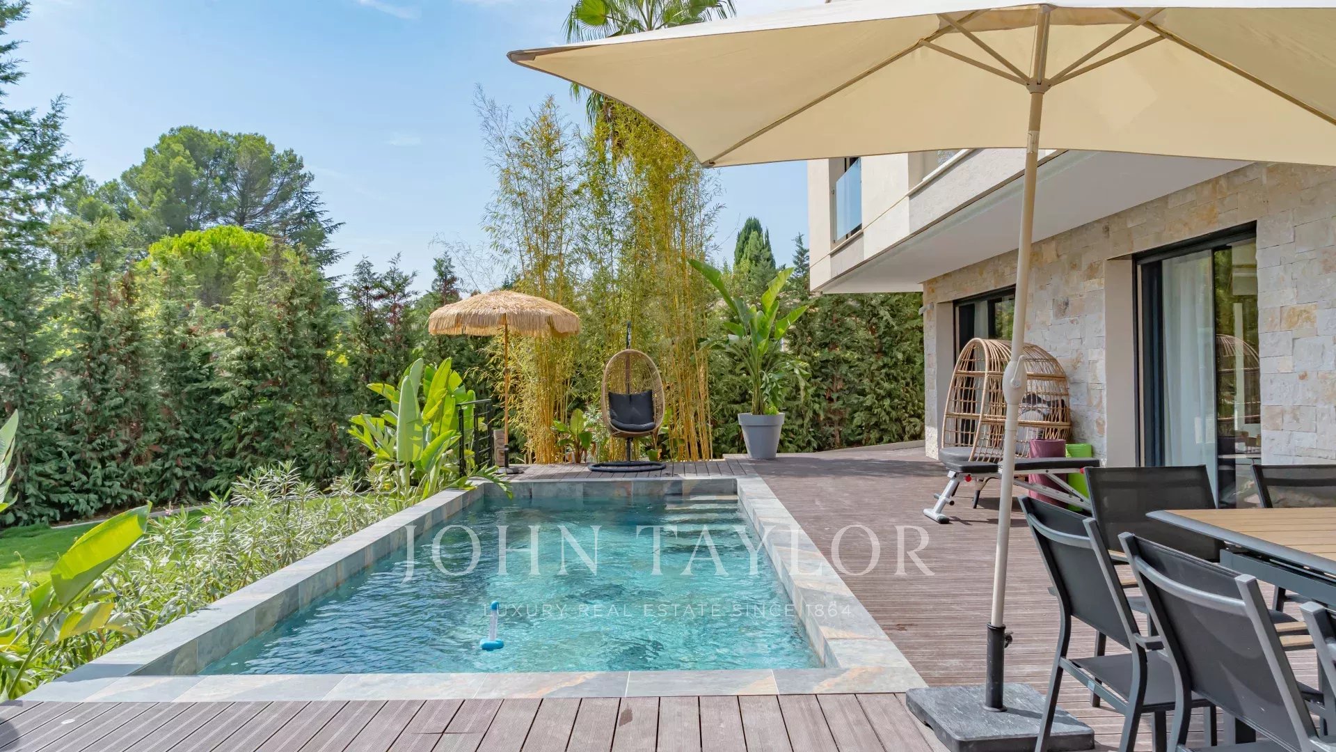 L'extérieur ne manque pas de charme, avec une piscine élégante entourée d'un jardin magnifiquement aménagé. L'espace est sécurisé grâce à un système de vidéosurveillance et équipé d'un portail électrique.