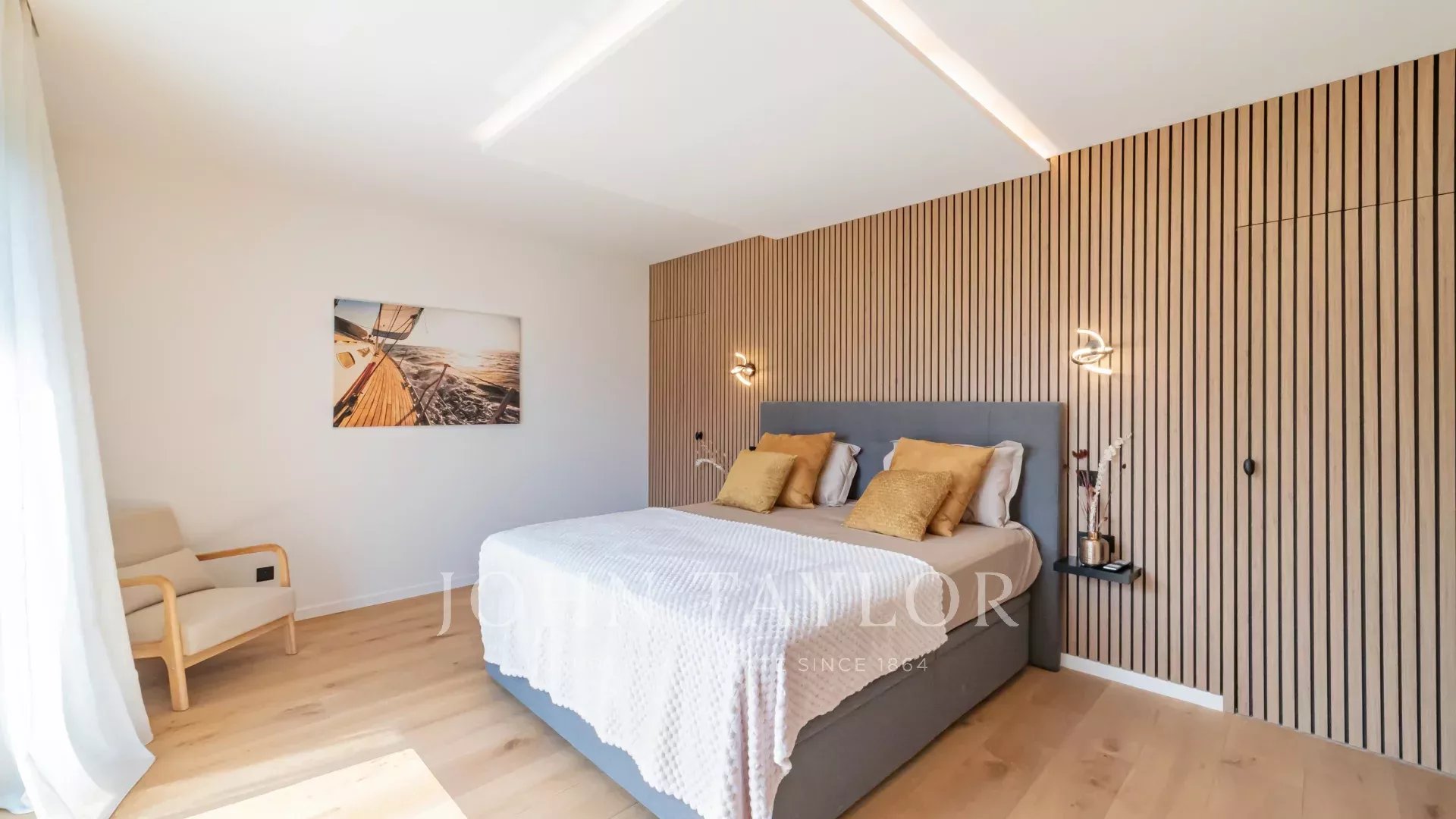 La villa propose 6 chambres spacieuses, toutes habillées de grandes fenêtres coulissantes qui laissent entrer la lumière naturelle.