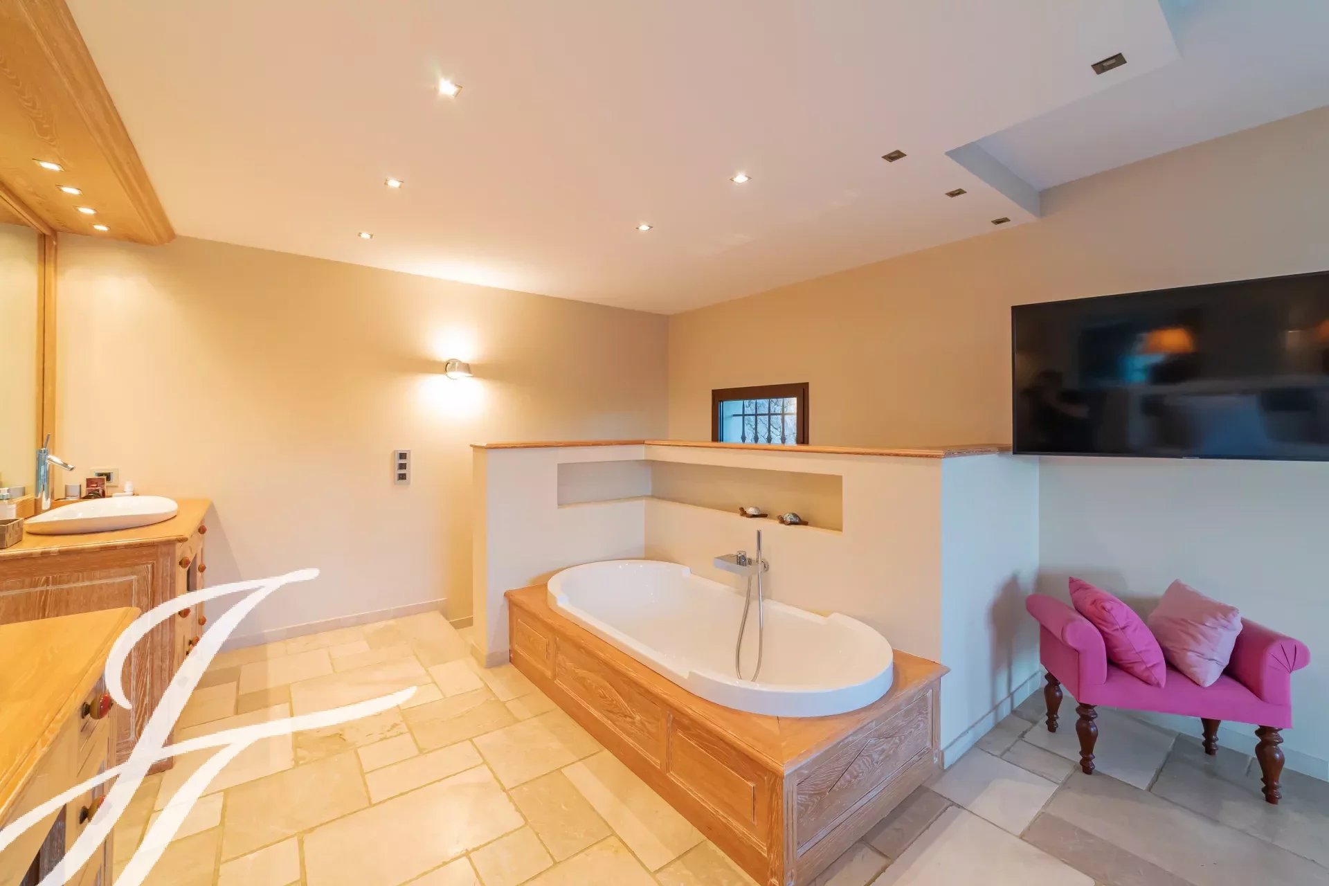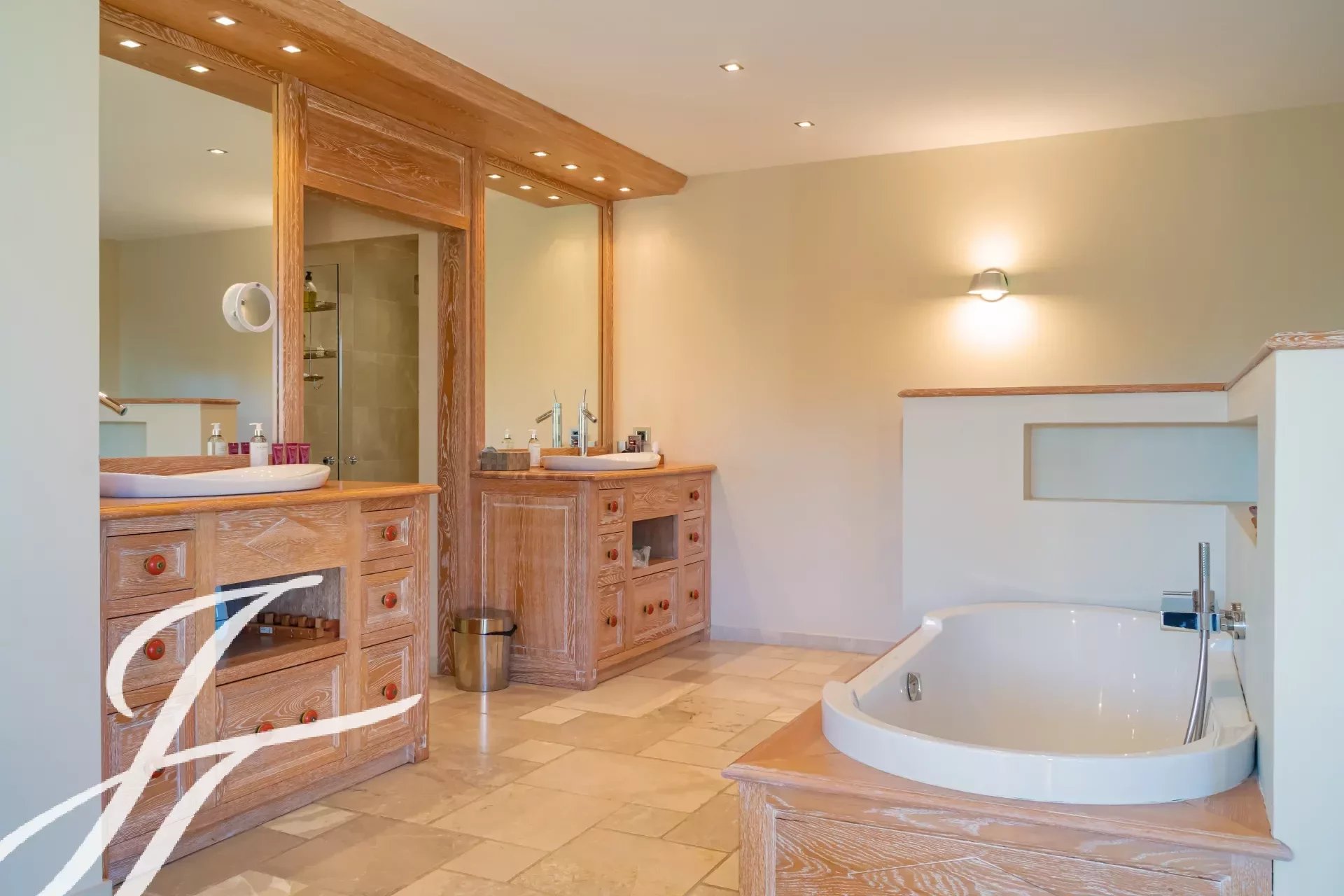 Suite parentale spacieuse avec salle de bains privative comprenant baignoire, double vasque, deux douches et WC indépendant