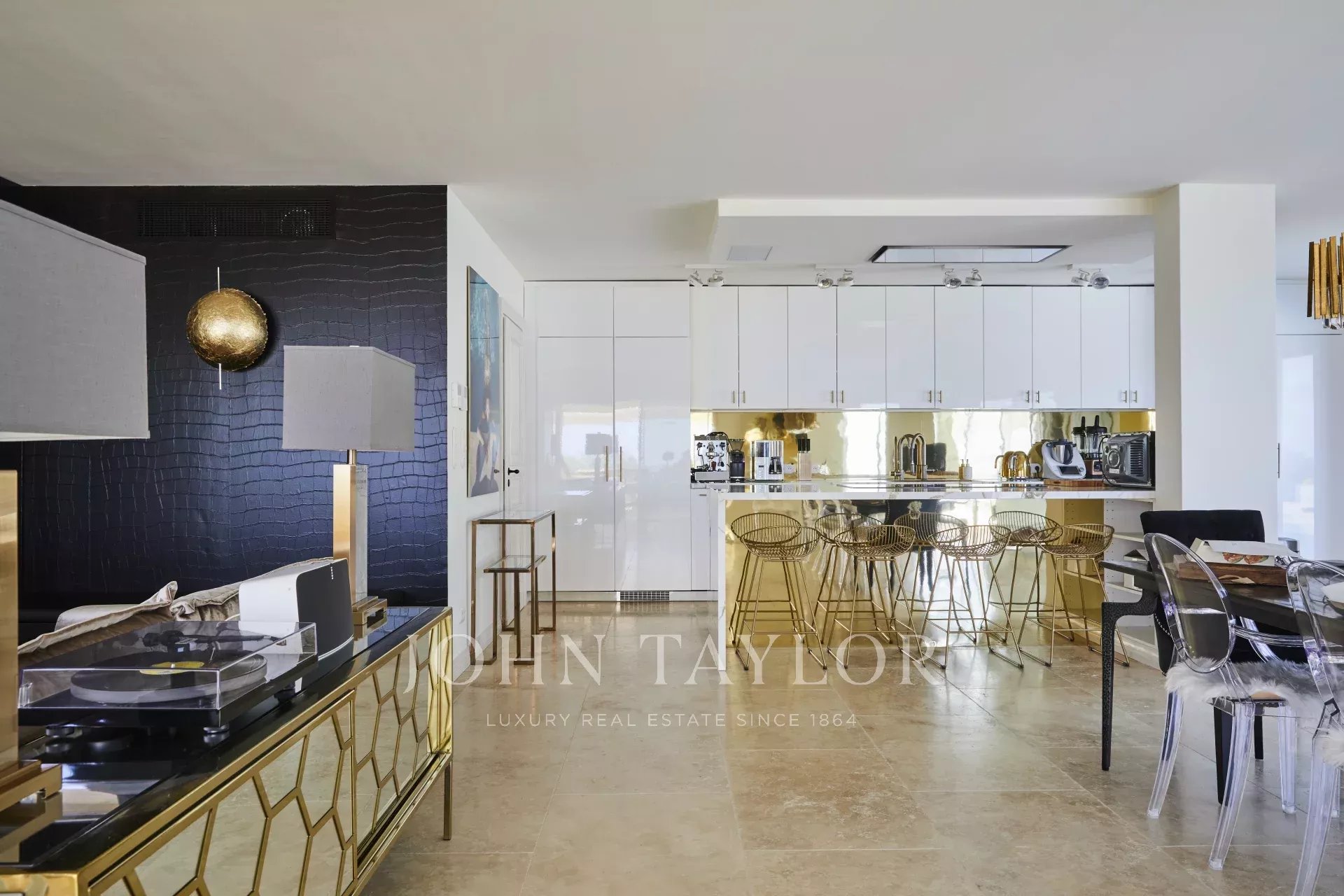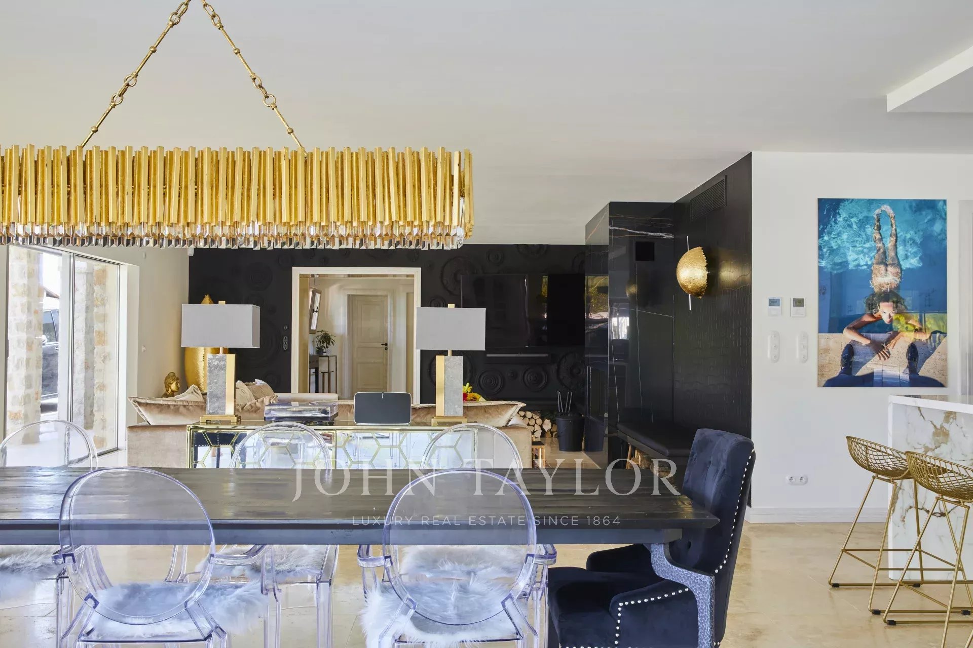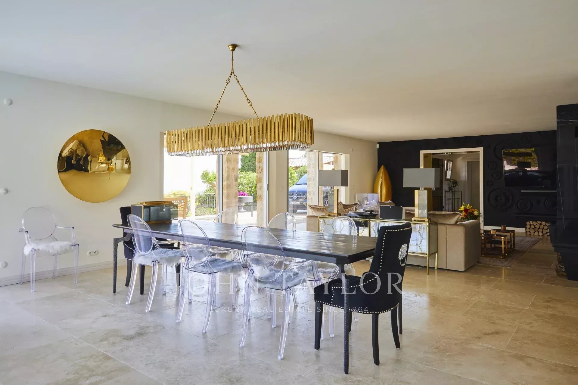 Au rez-de-chaussée, un bel espace de vie avec salon équipé d'une télévision, système de son Sonos, cheminée à bois. Le séjour est baigné de lumière avec un magnifique angle vitré, il est dans la prolongation de la cuisine tout équipée avec îlot central.