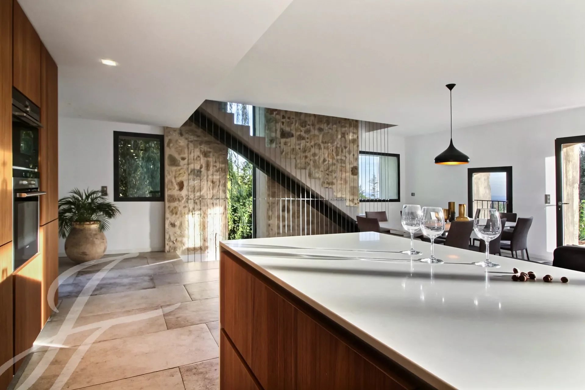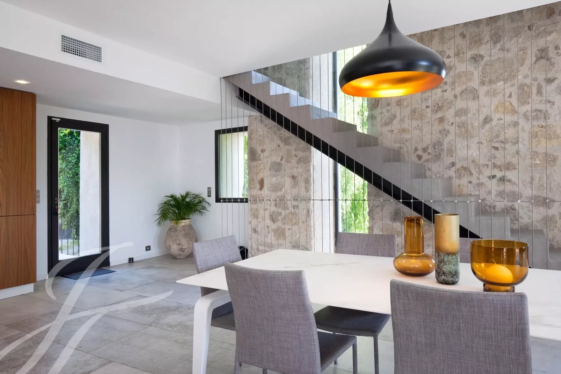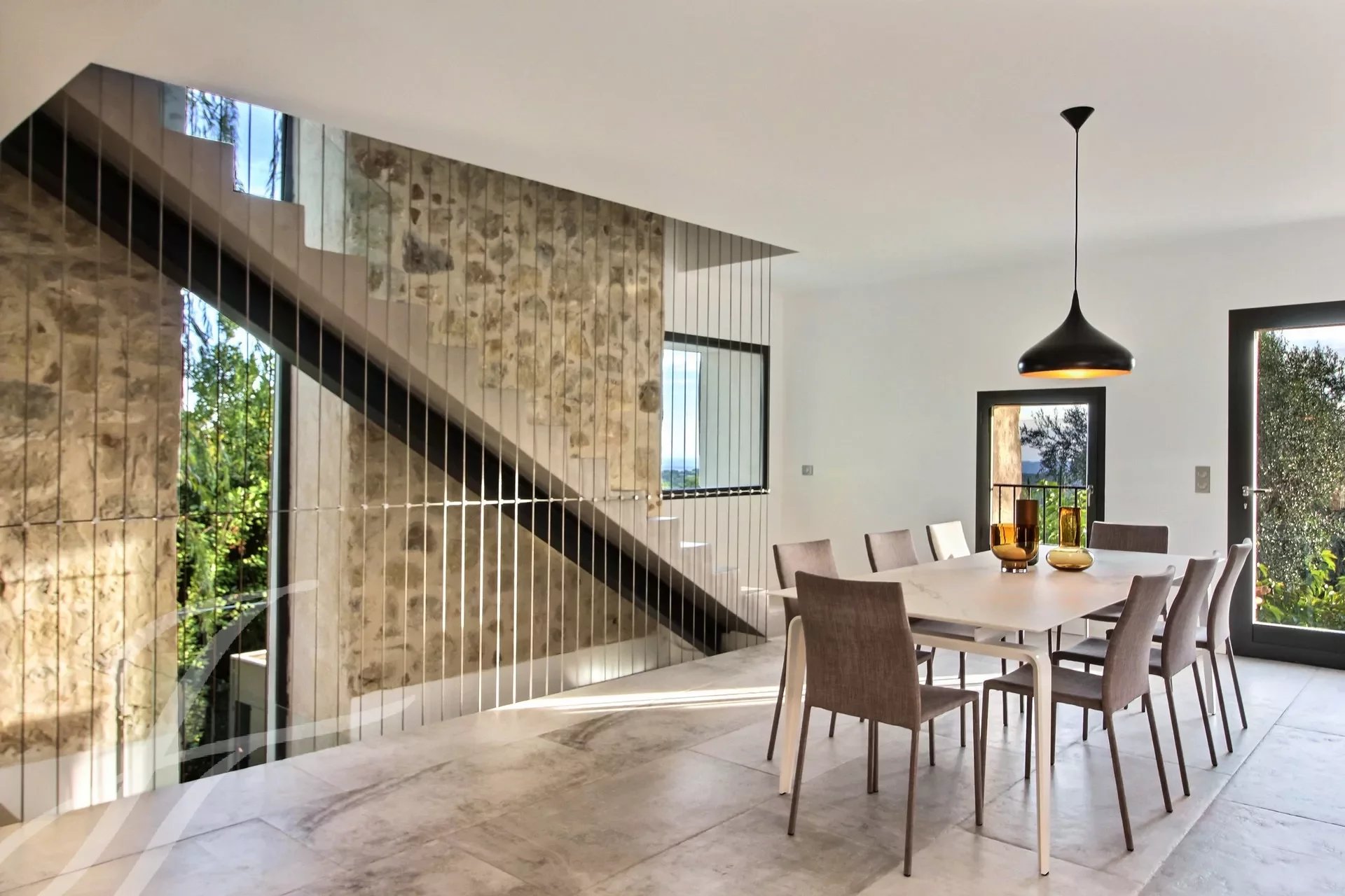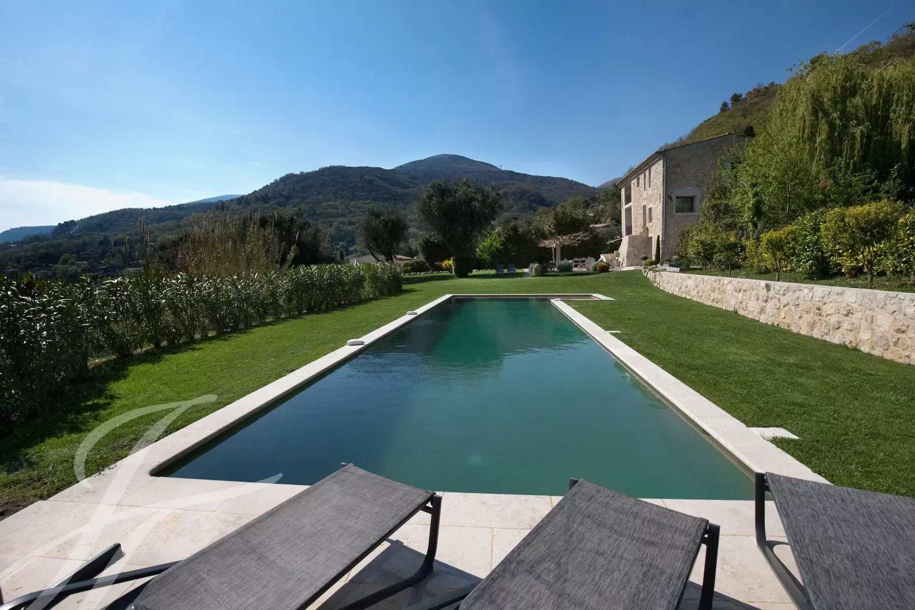 Cette superbe bergerie ancienne de 230 m² environ, entièrement rénovée dans un style contemporain et épuré, offre un charme authentique avec une vue imprenable depuis les hauteurs de Vence. Située dans un cadre privilégié, la propriété bénéficie d'un vaste jardin paysager et d'une grande piscine élégante.