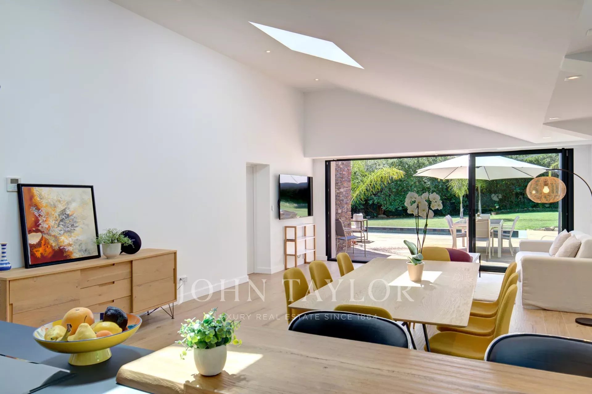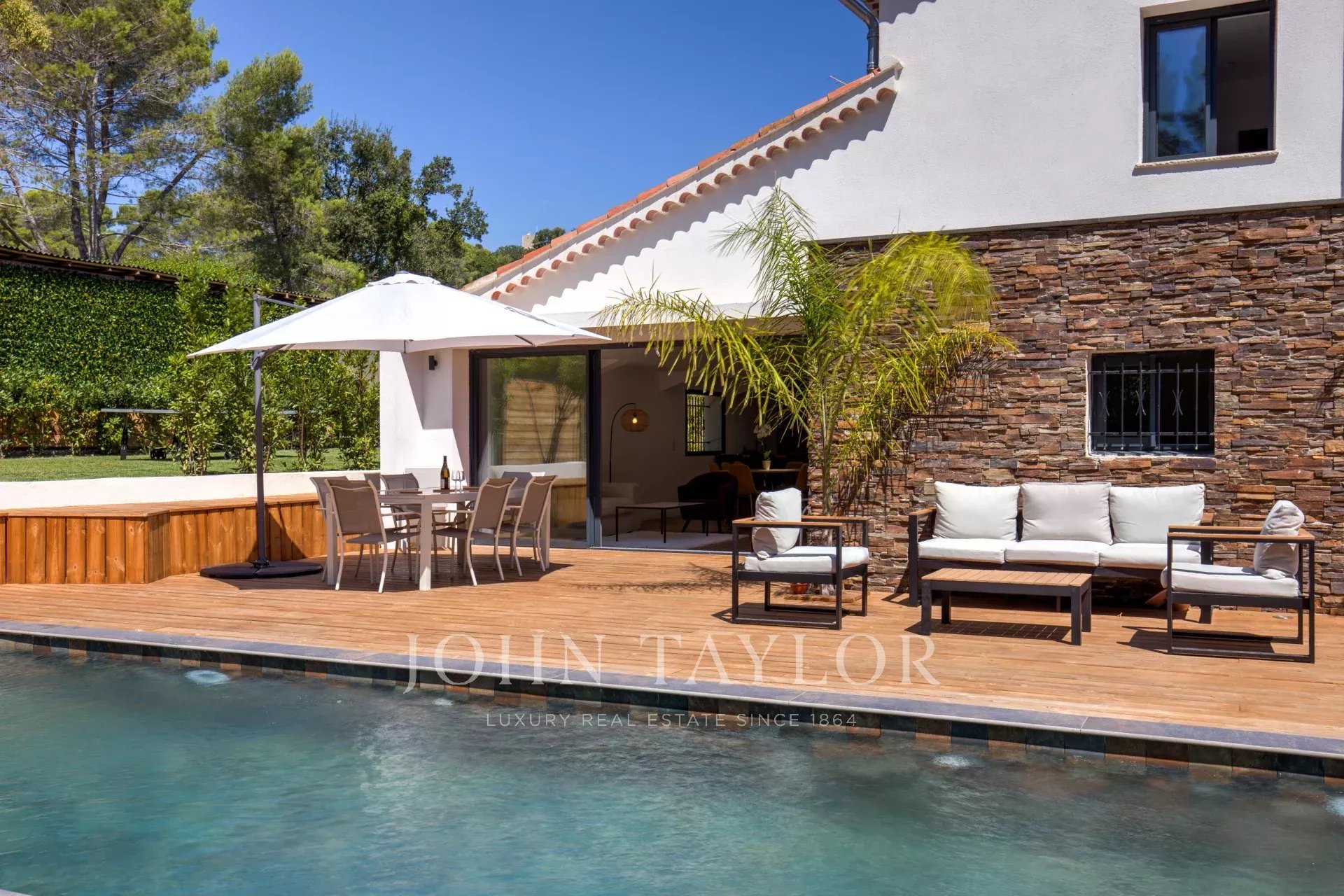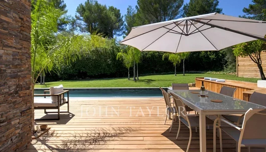 Les extérieurs sont composés d'une piscine sécurisée, qui peut-être chauffée, des parasols, un terrain de pétanque, un espace repas avec barbecue et un espace équipé d'un salon de jardin. Un parking pour 3 voitures avec branchements pour voitures électriques et un garage fermé pour 1 voiture complètent le bien.