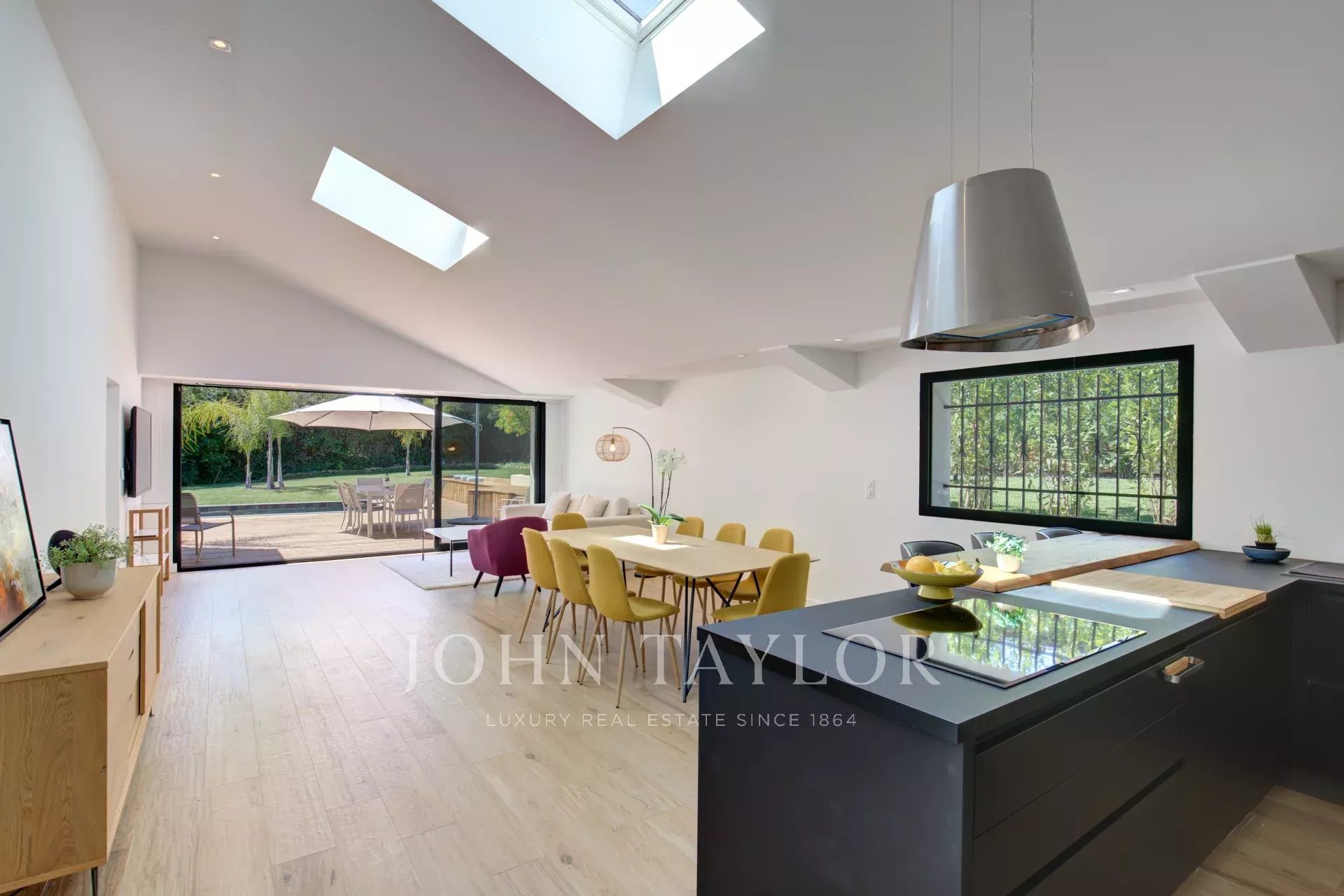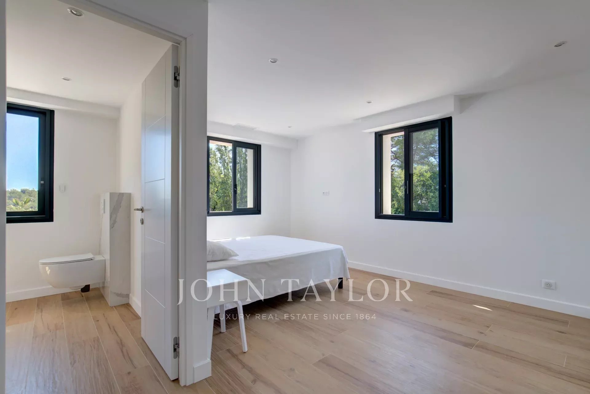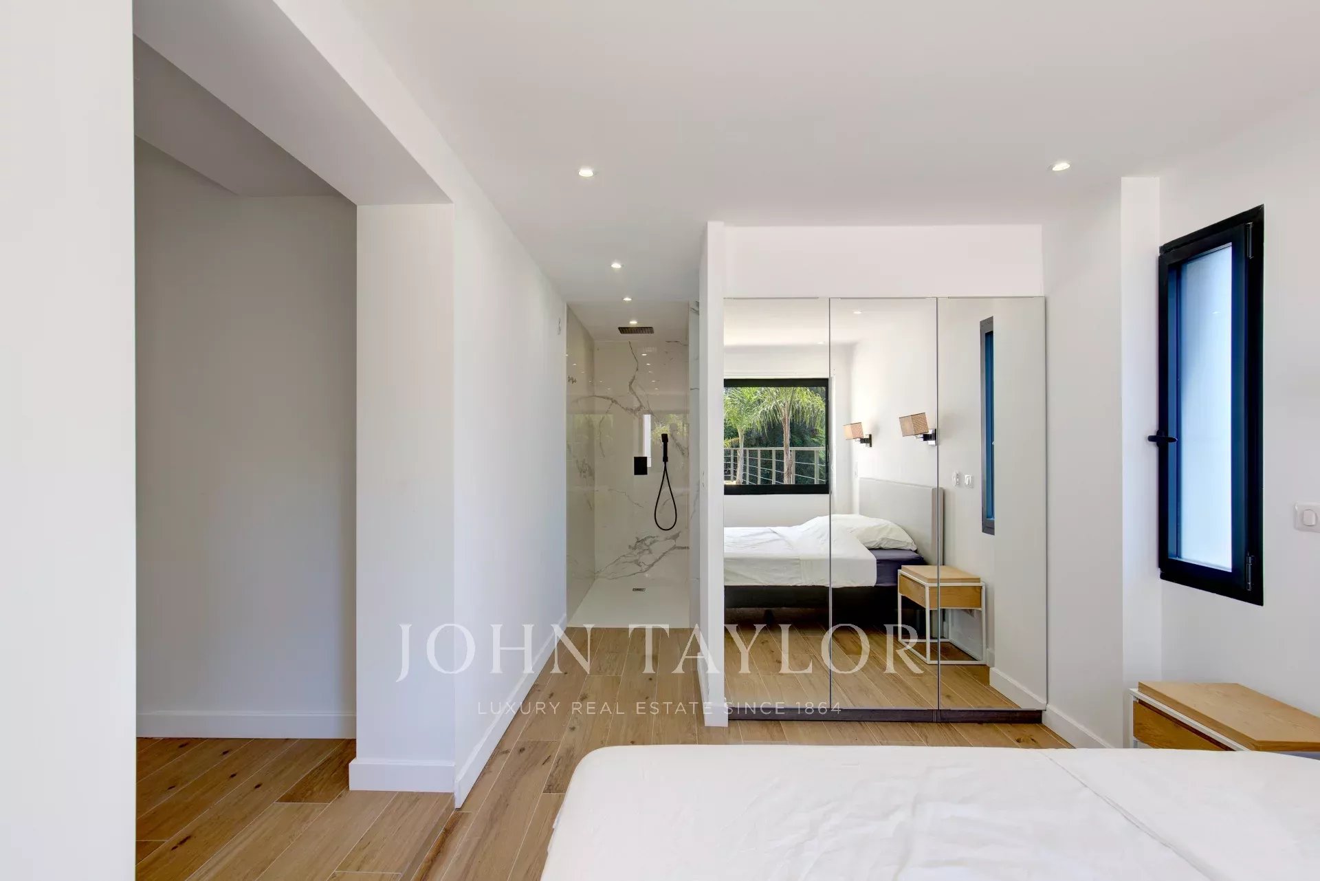 Au rez-de-chaussée se trouve un grand séjour ouvert sur l'extérieur, une cuisine ouverte entièrement équipée et deux chambres avec salle de douche en suite et dressing
