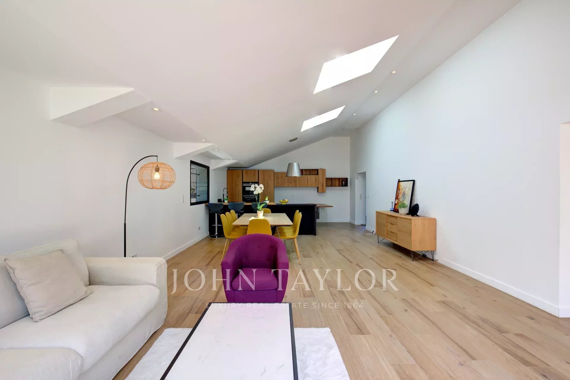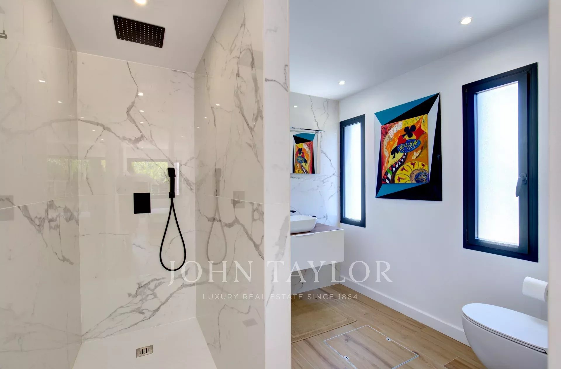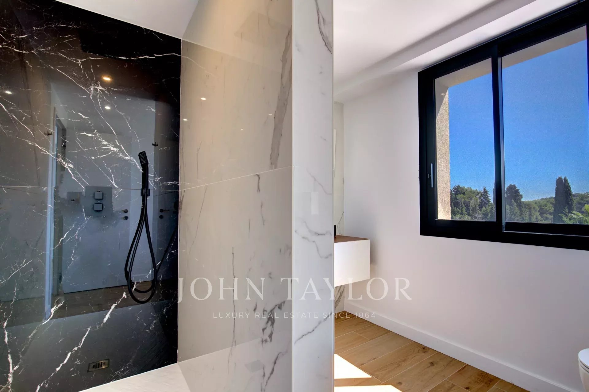 Au rez-de-chaussée se trouve un grand séjour ouvert sur l'extérieur, une cuisine ouverte entièrement équipée et deux chambres avec salle de douche en suite et dressing