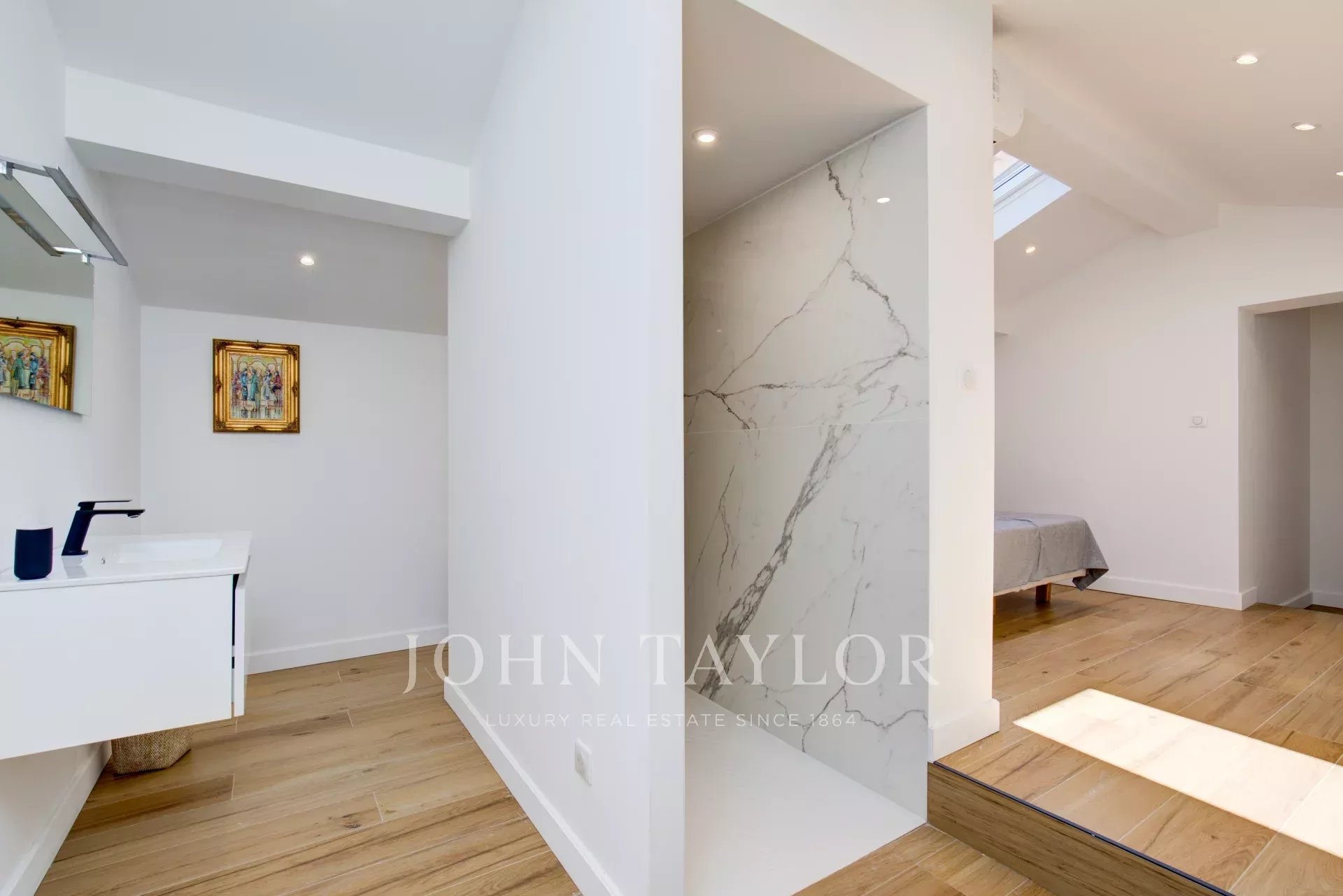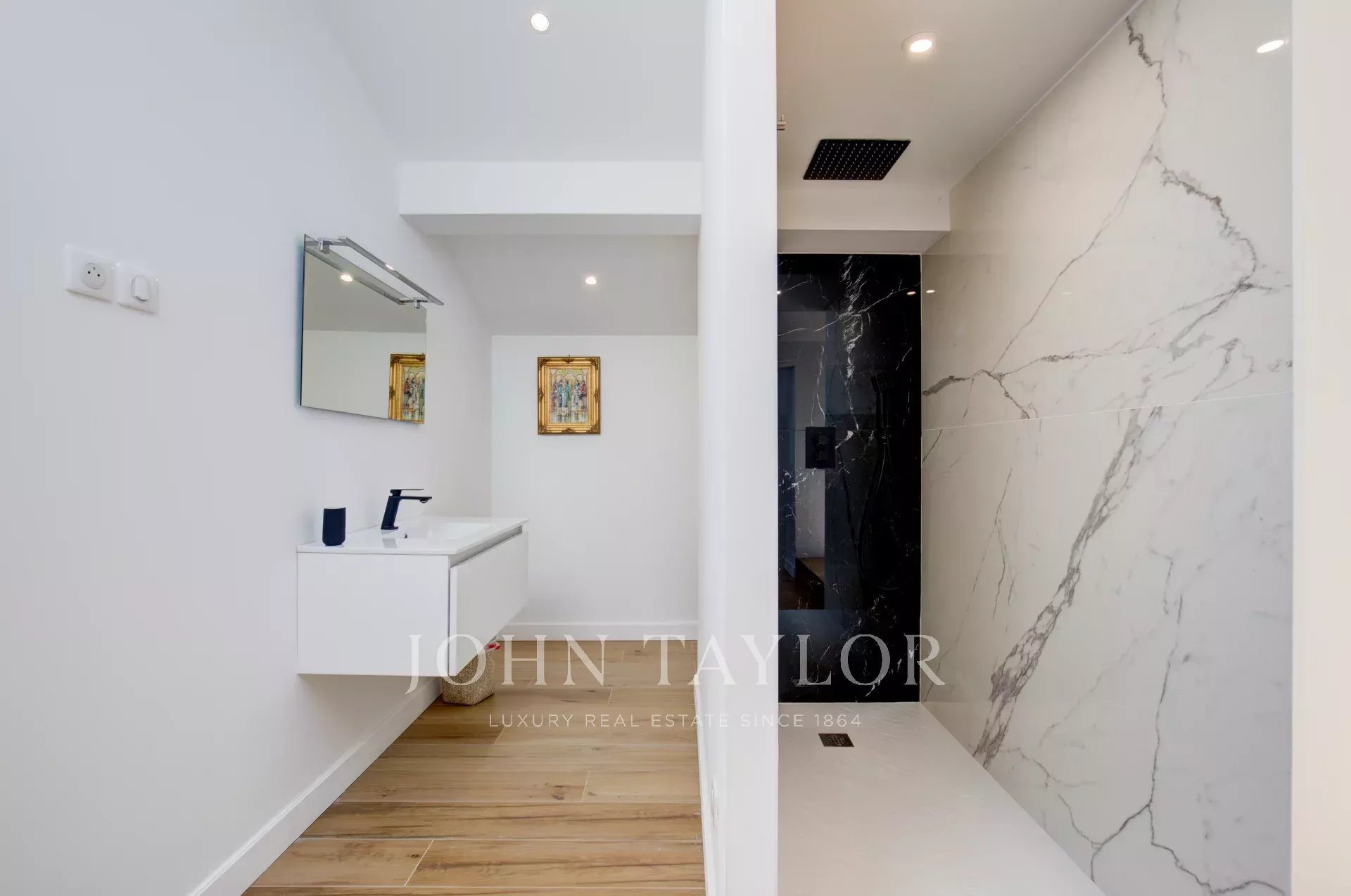 Au premier étage se trouvent deux chambres avec lits doubles, en suite avec salle de bains et douches, toutes les deux climatisées