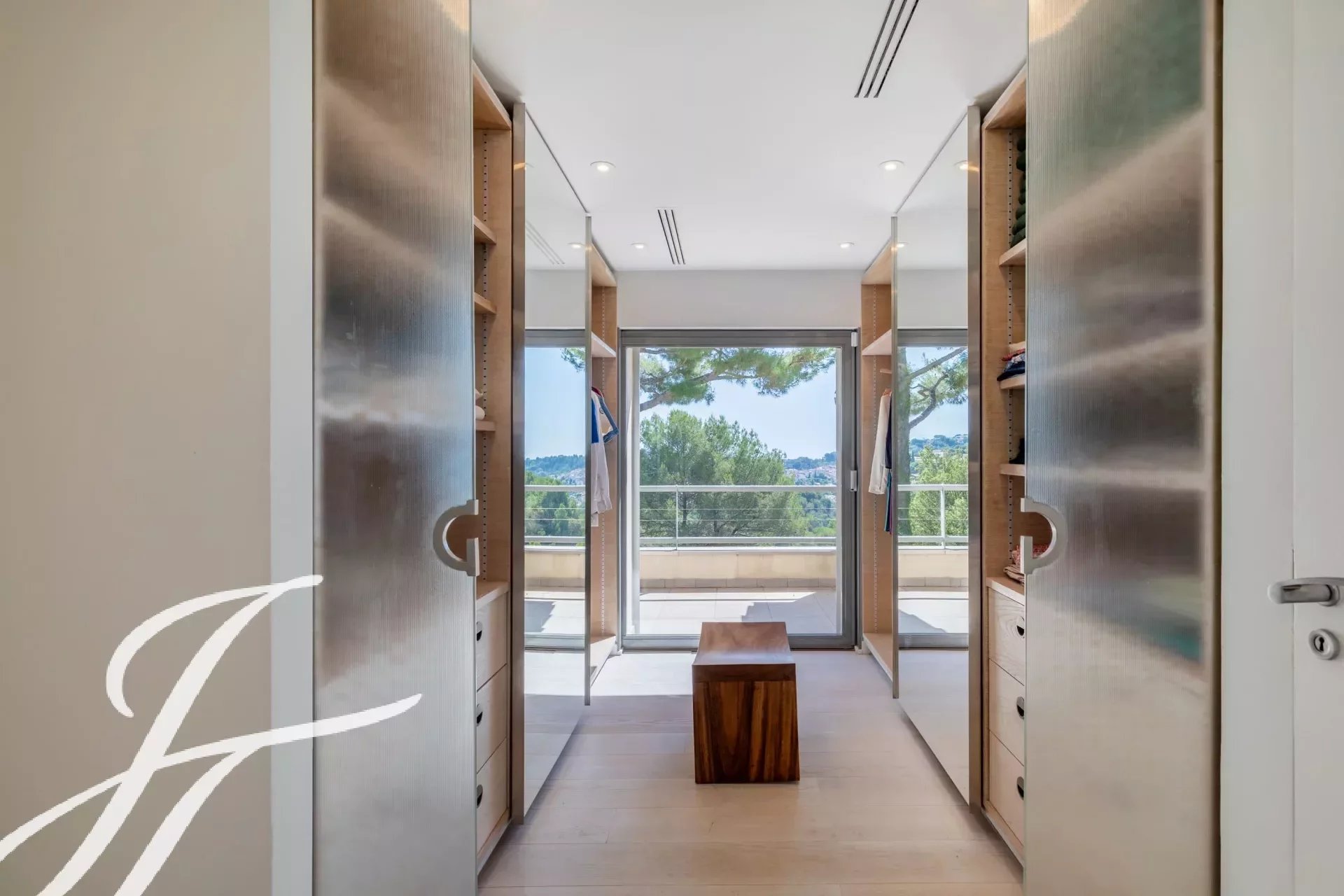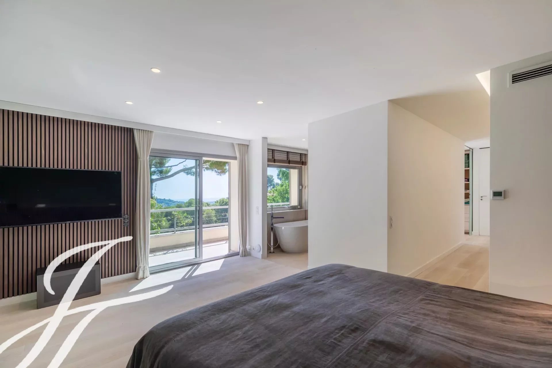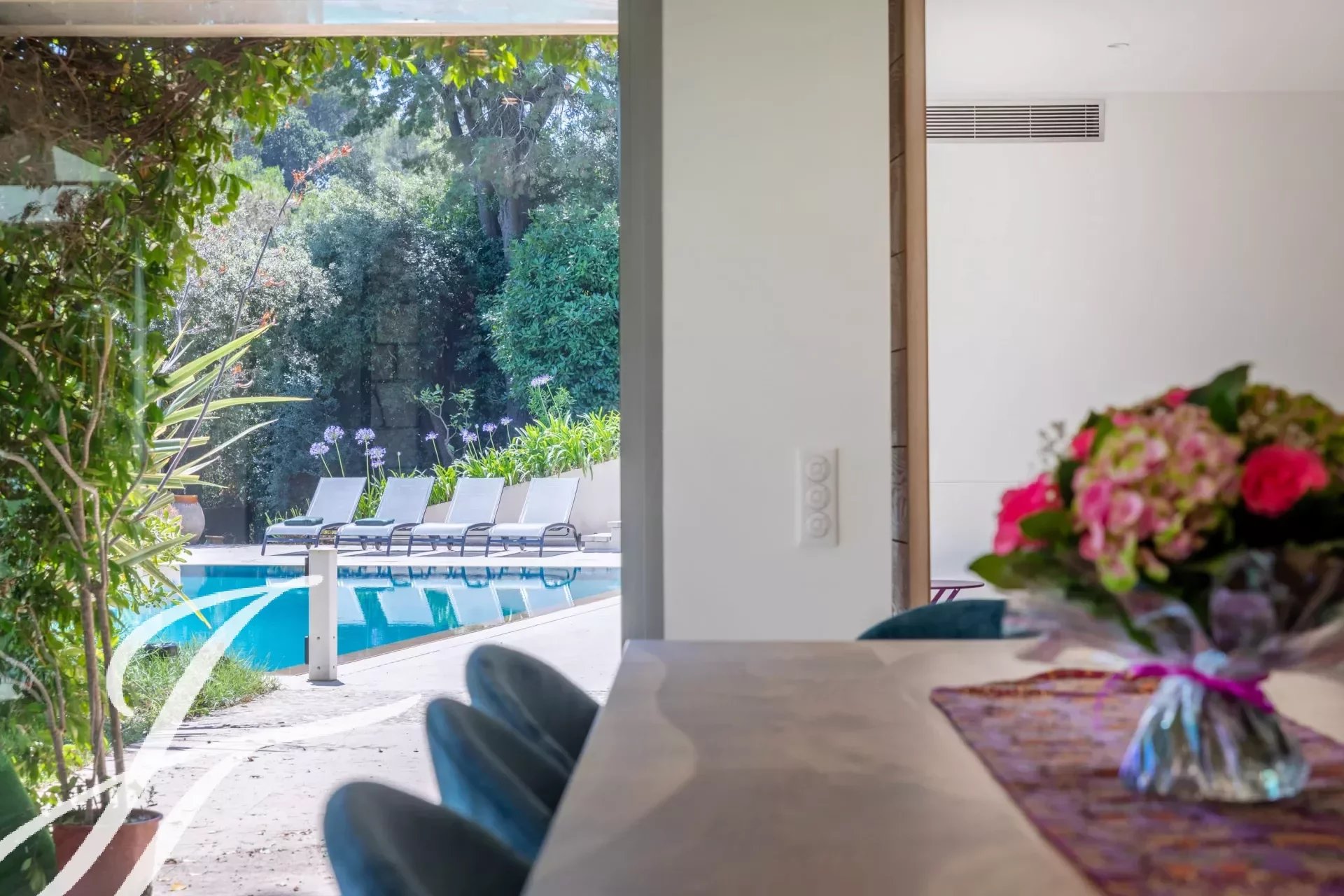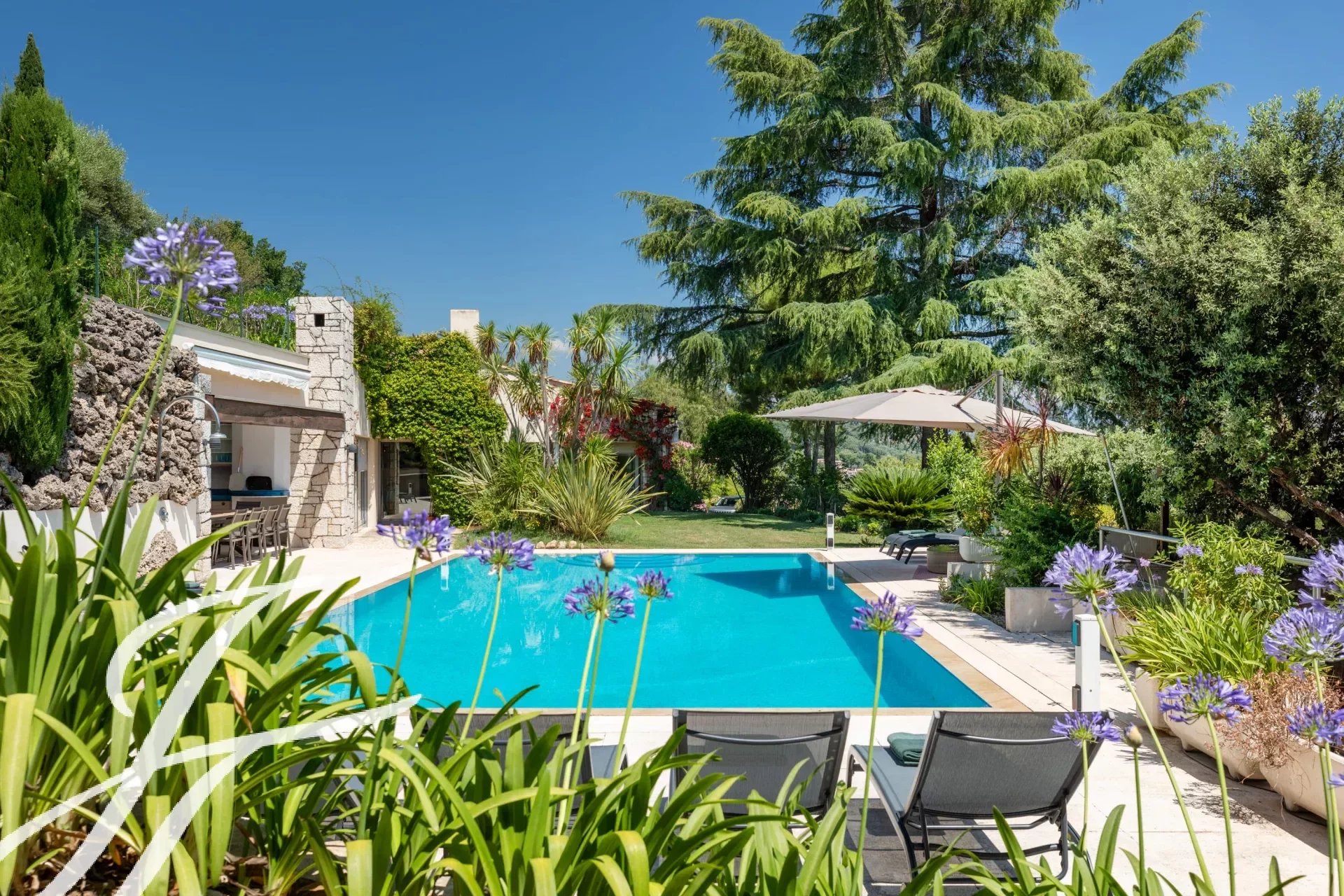 Dans un prestigieux domaine résidentiel fermé bénéficiant d'une vue panoramique sur le village de Biot et la mer en toile de fond, superbe propriété de style contemporain, entièrement rénovée avec goût, offrant environ 360 m2 habitables, au cœur d'un parc paysager de 2 586 m2 avec piscine.