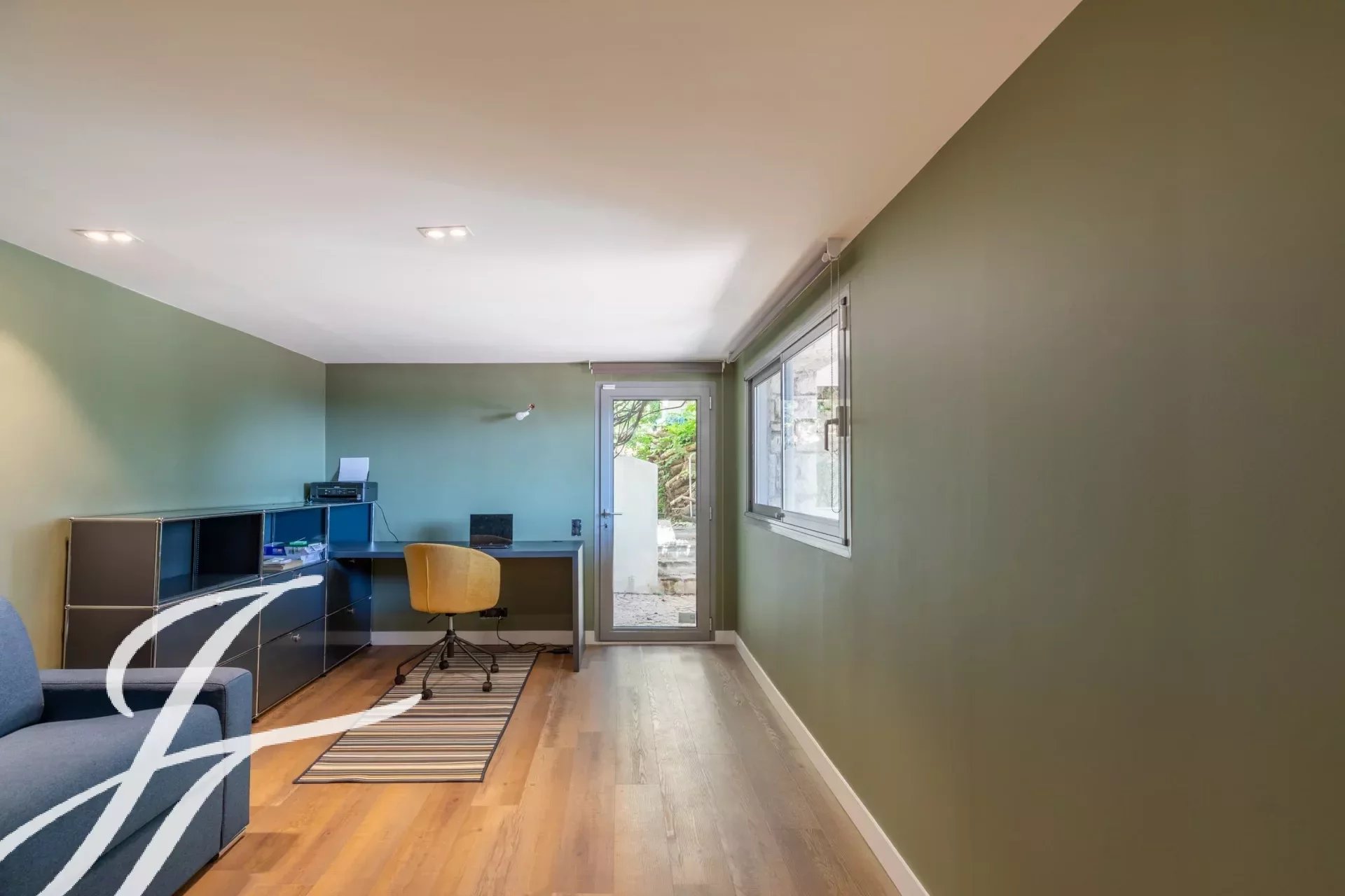Au rez-de-jardin : Bureau, salle de cinéma, buanderie. Studio indépendant de 38 m2 avec un séjour, une kitchenette, une chambre et une salle de douche.