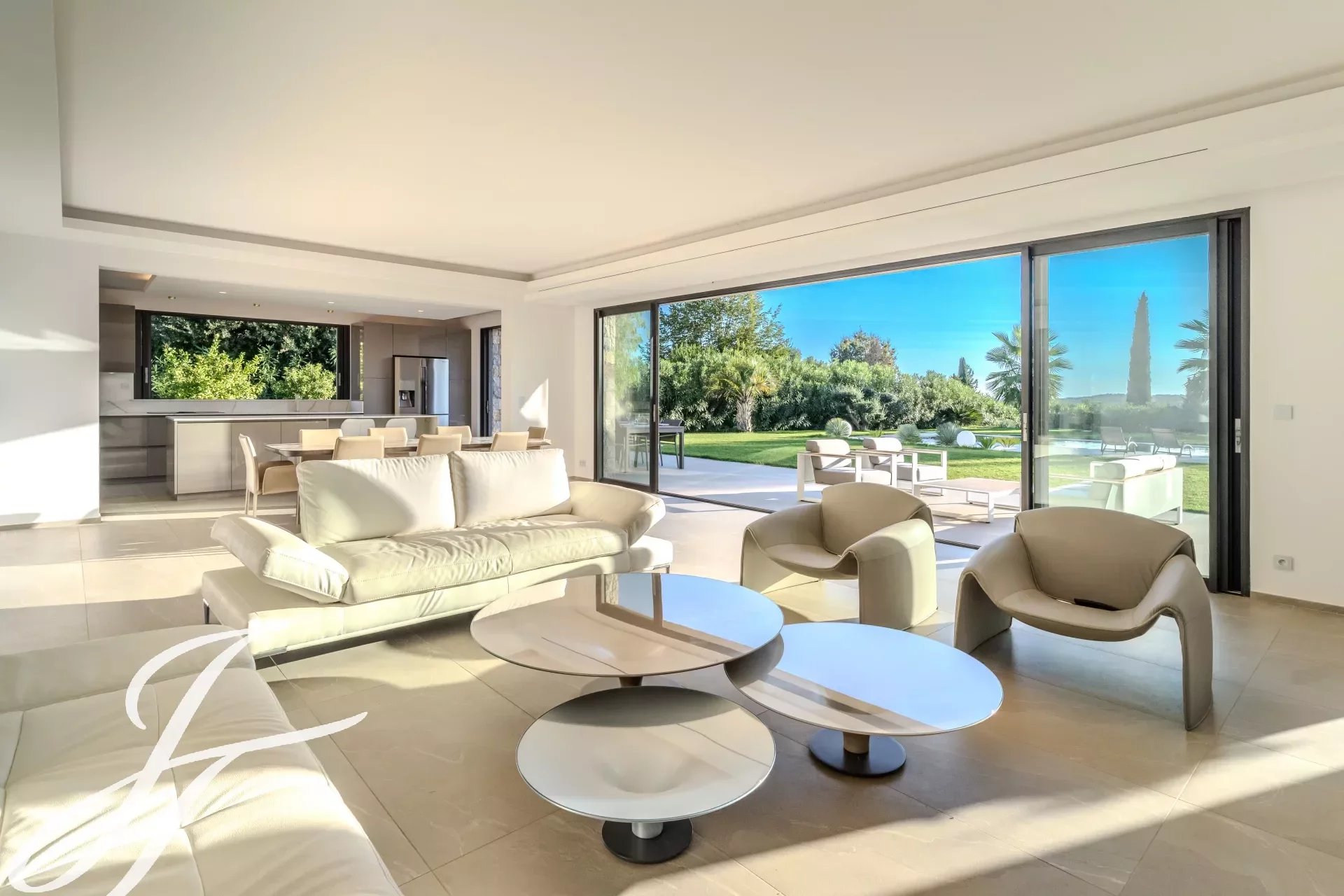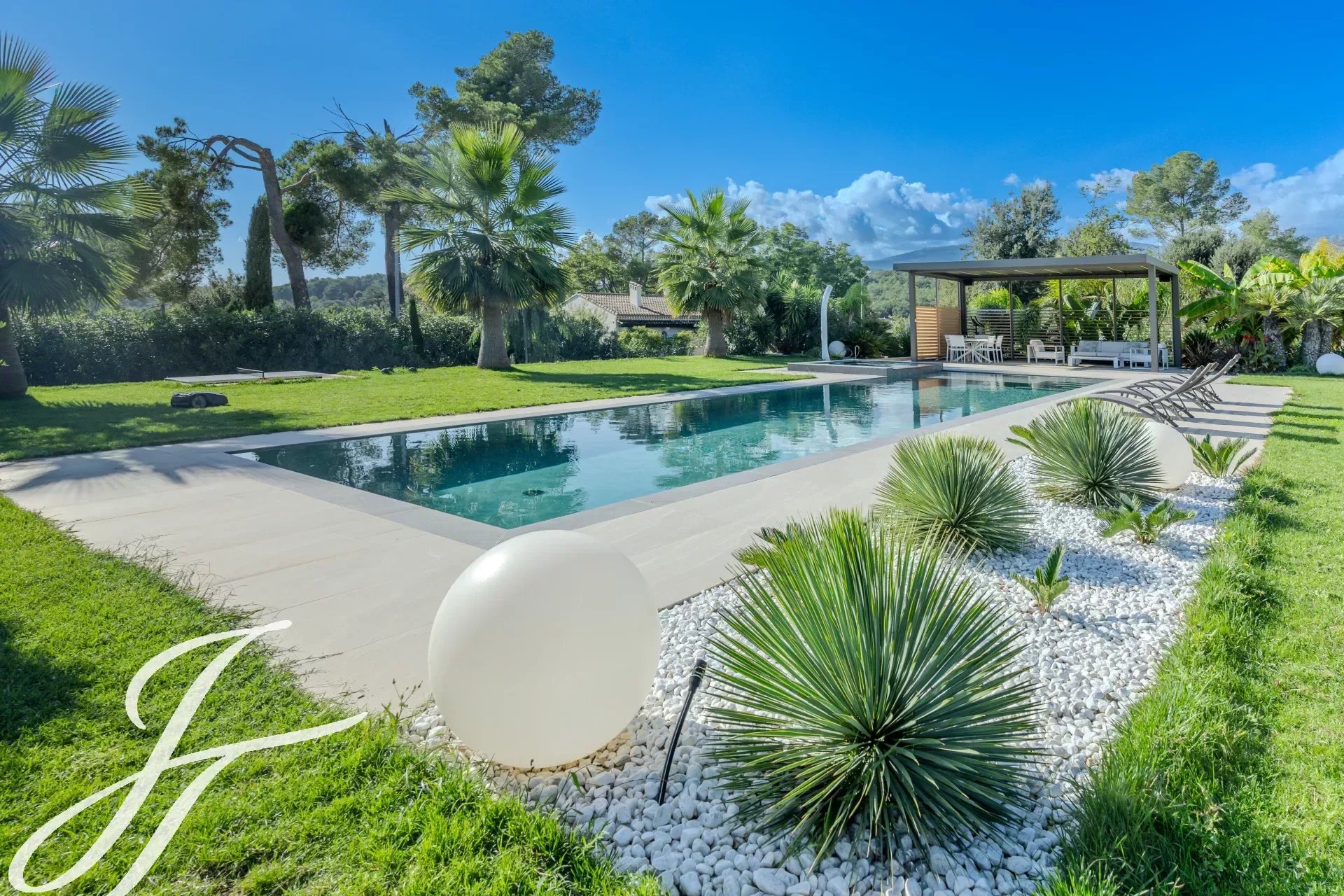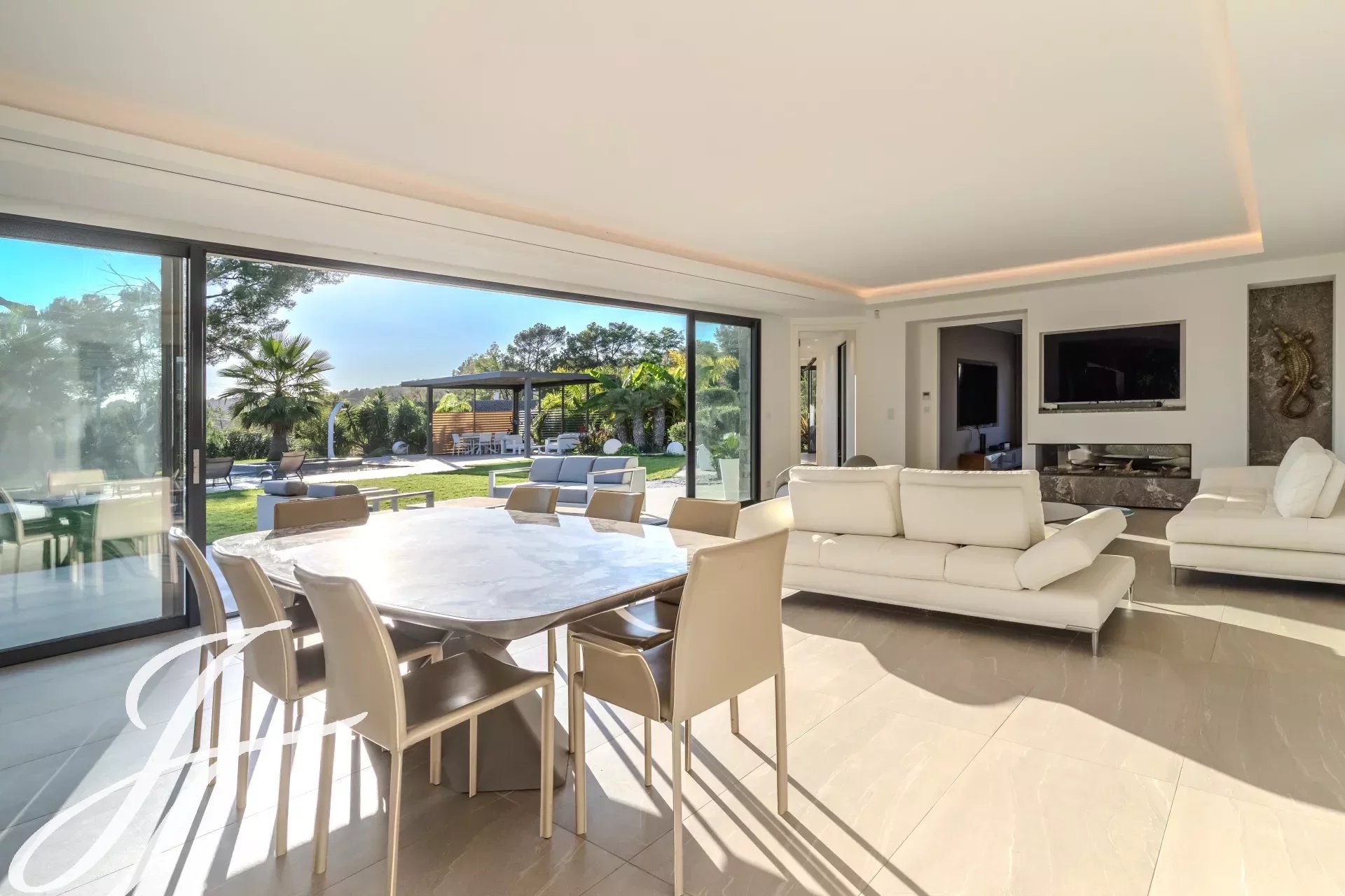 Toutes les pièces donnent sur la terrasse, piscine chauffée et son pool house, idéales pour profiter des journées ensoleillées.
