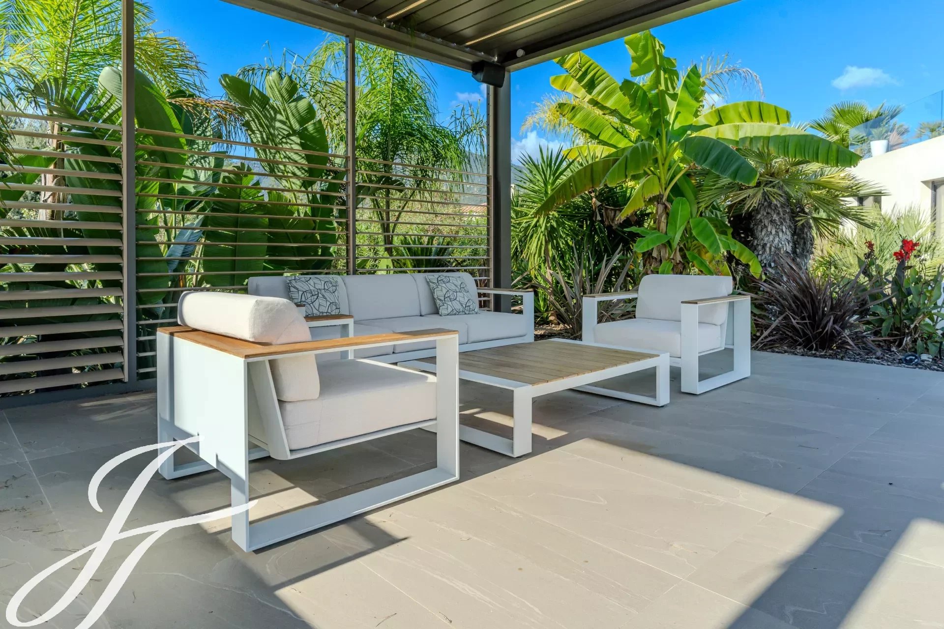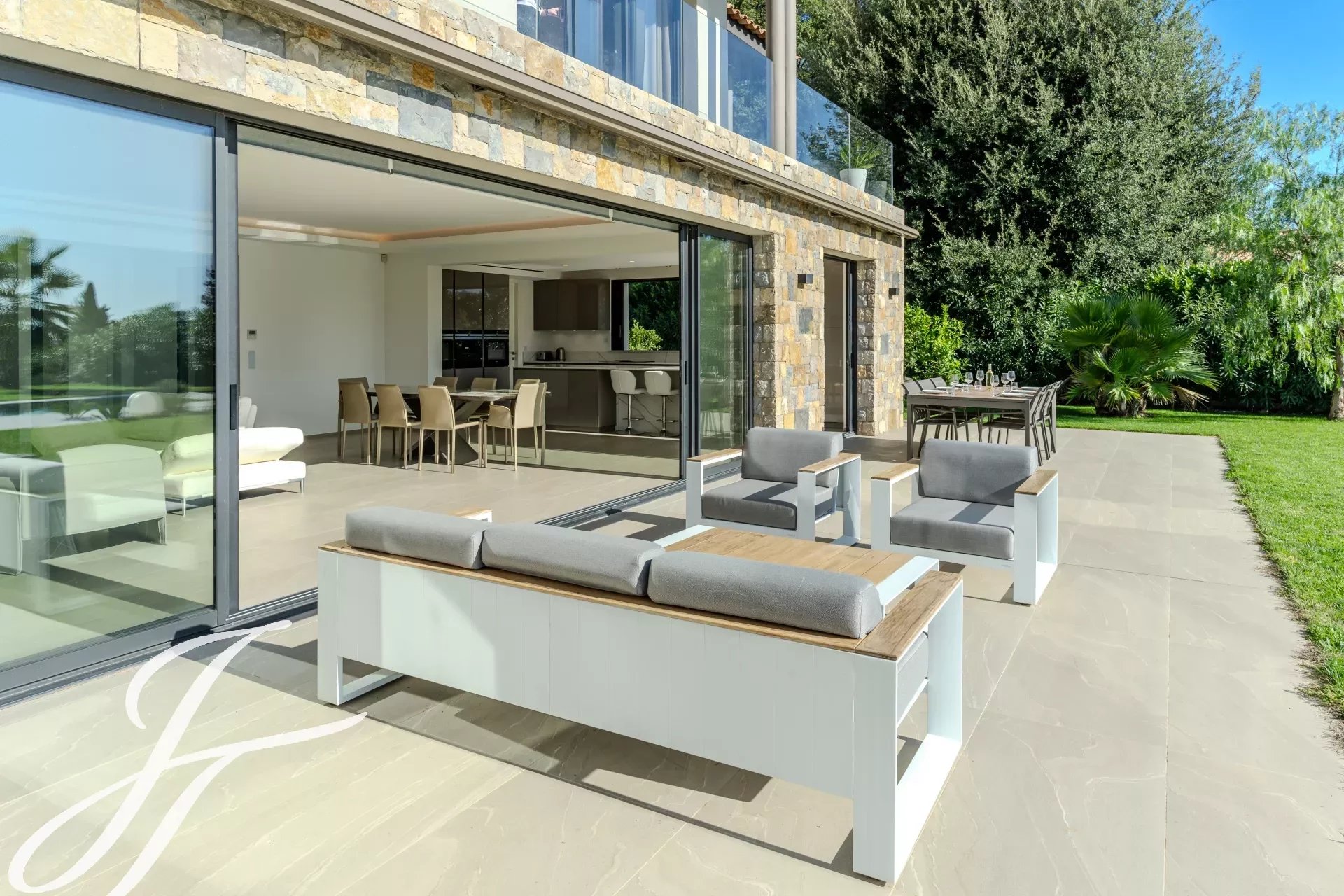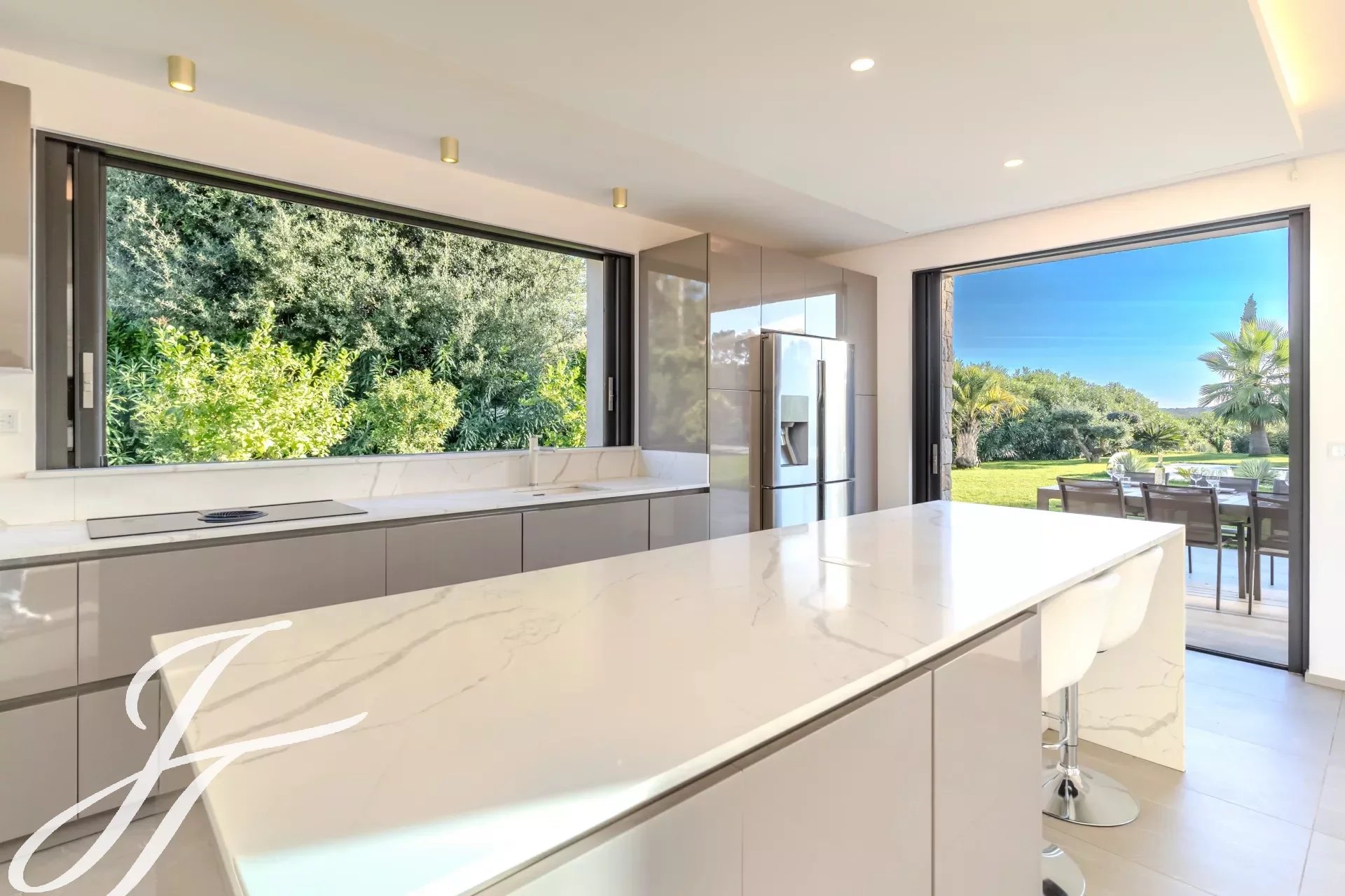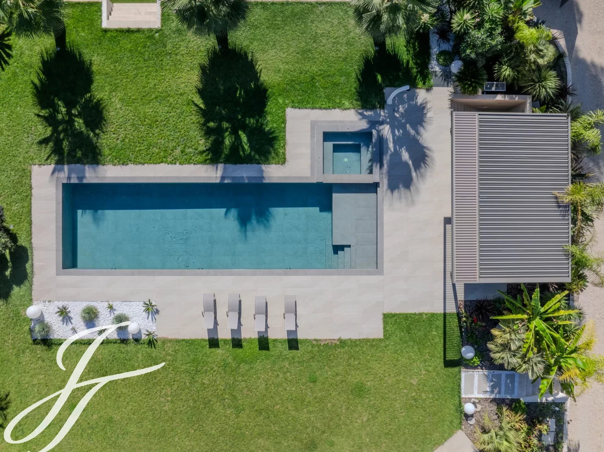 Toutes les pièces donnent sur la terrasse, piscine chauffée et son pool house, idéales pour profiter des journées ensoleillées.