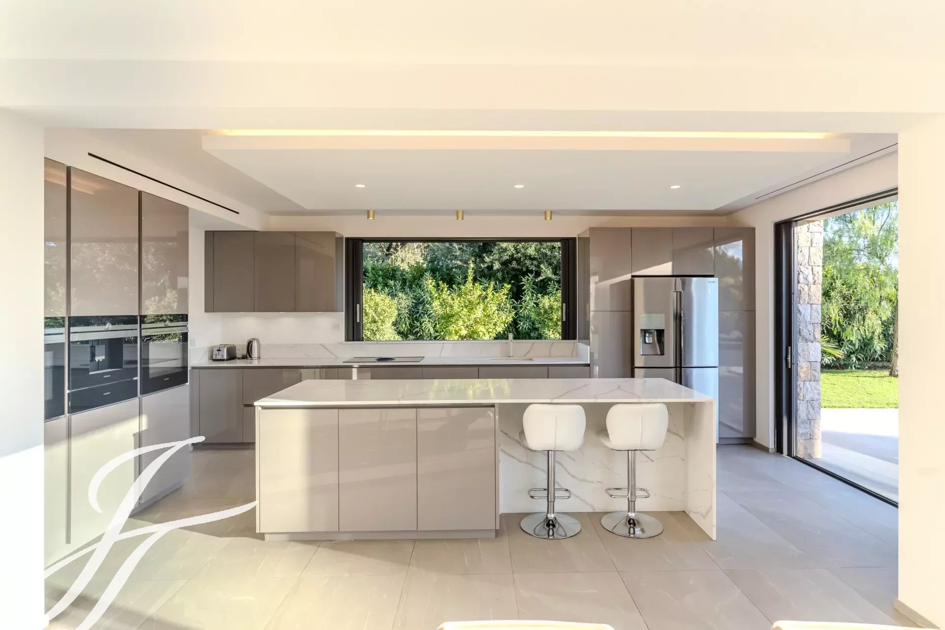 Au rez-de-chaussée se trouvent un hall d’entrée avec placards, un toilette pour les invités, un salon spacieux avec cheminée, une salle à manger, une cuisine ouverte entièrement équipée, une arrière-cuisine/buanderie et une suite parentale avec dressing, salle de bains privative, coin bureau et une terrasse privative.