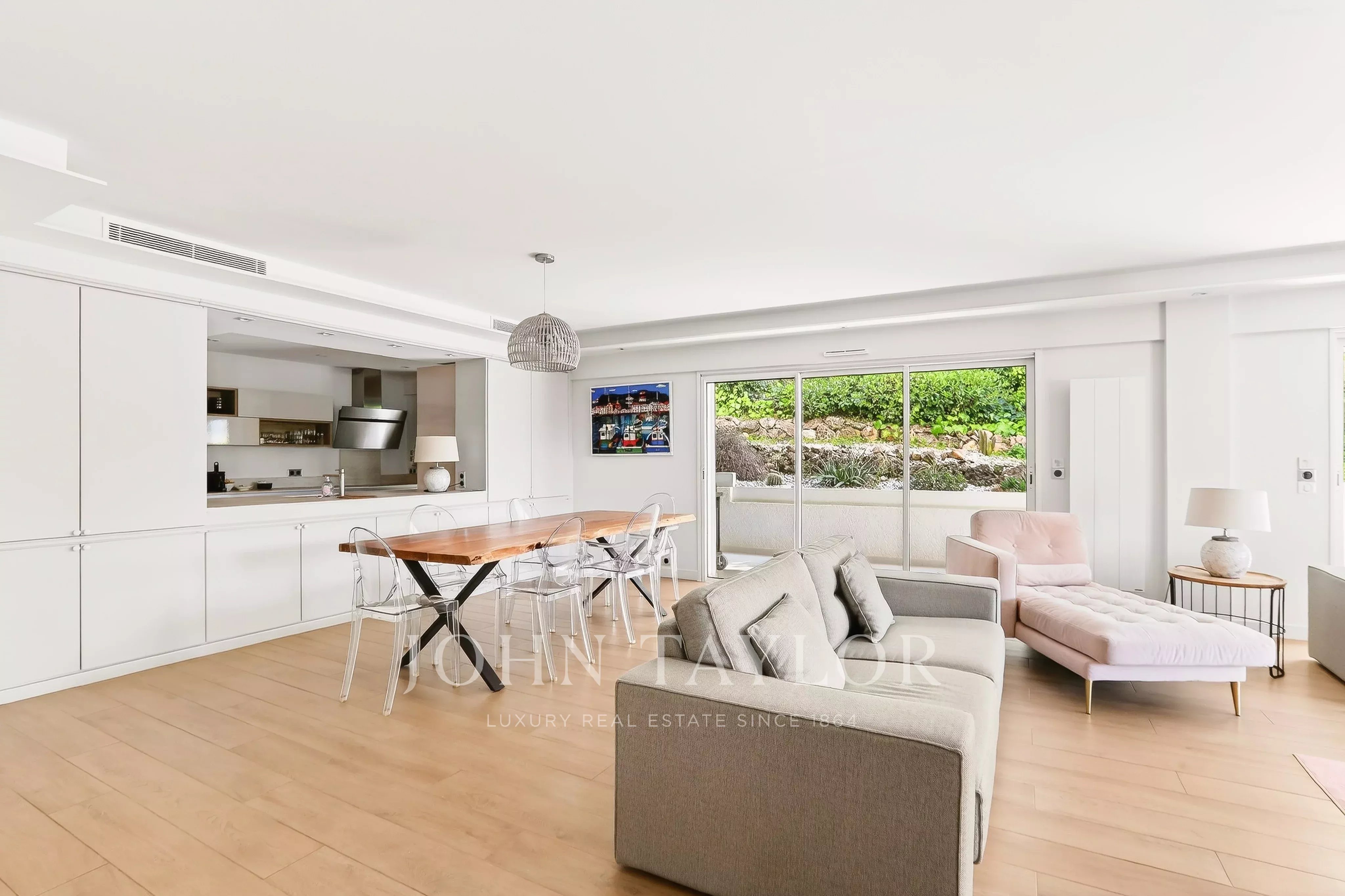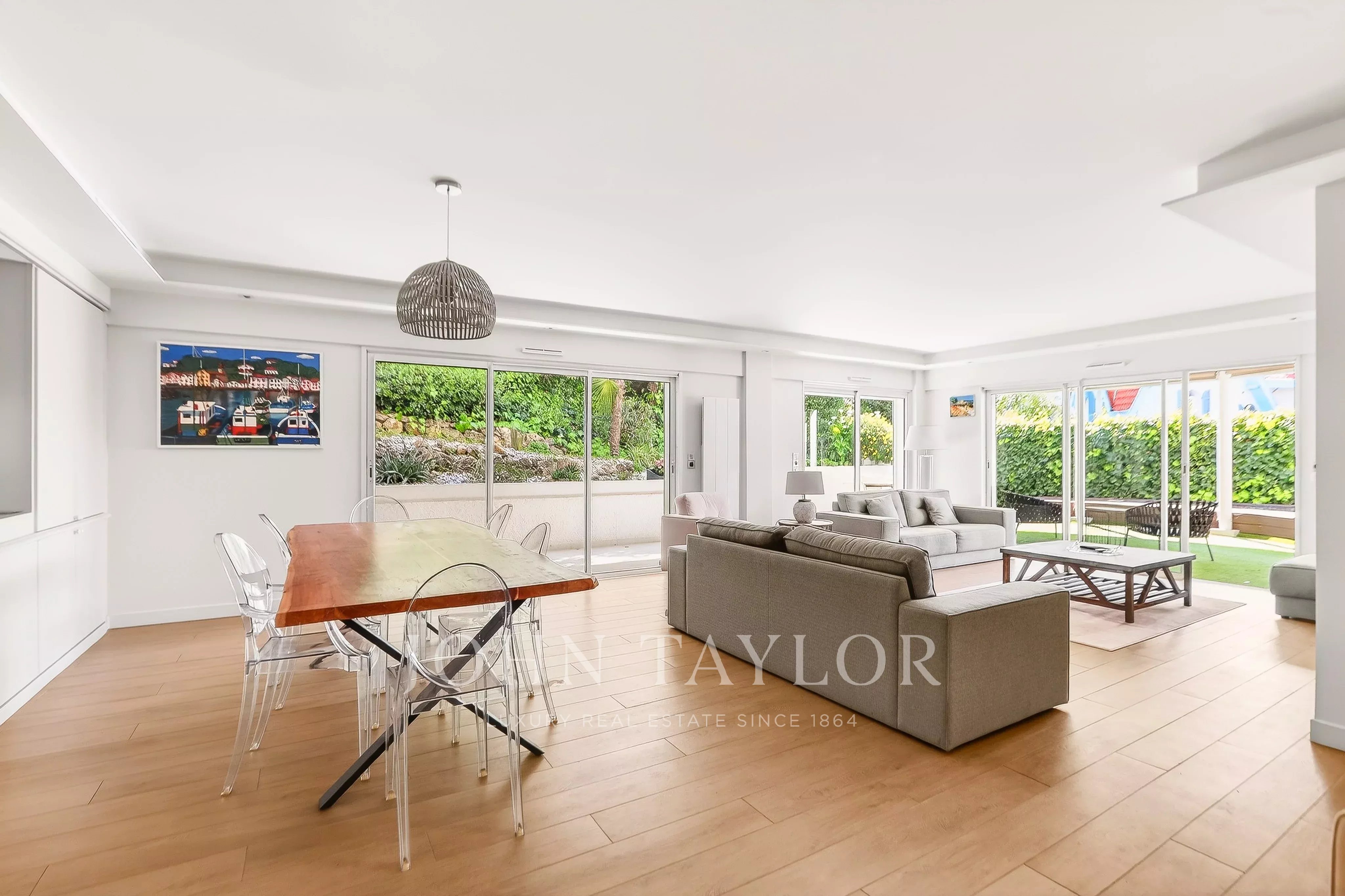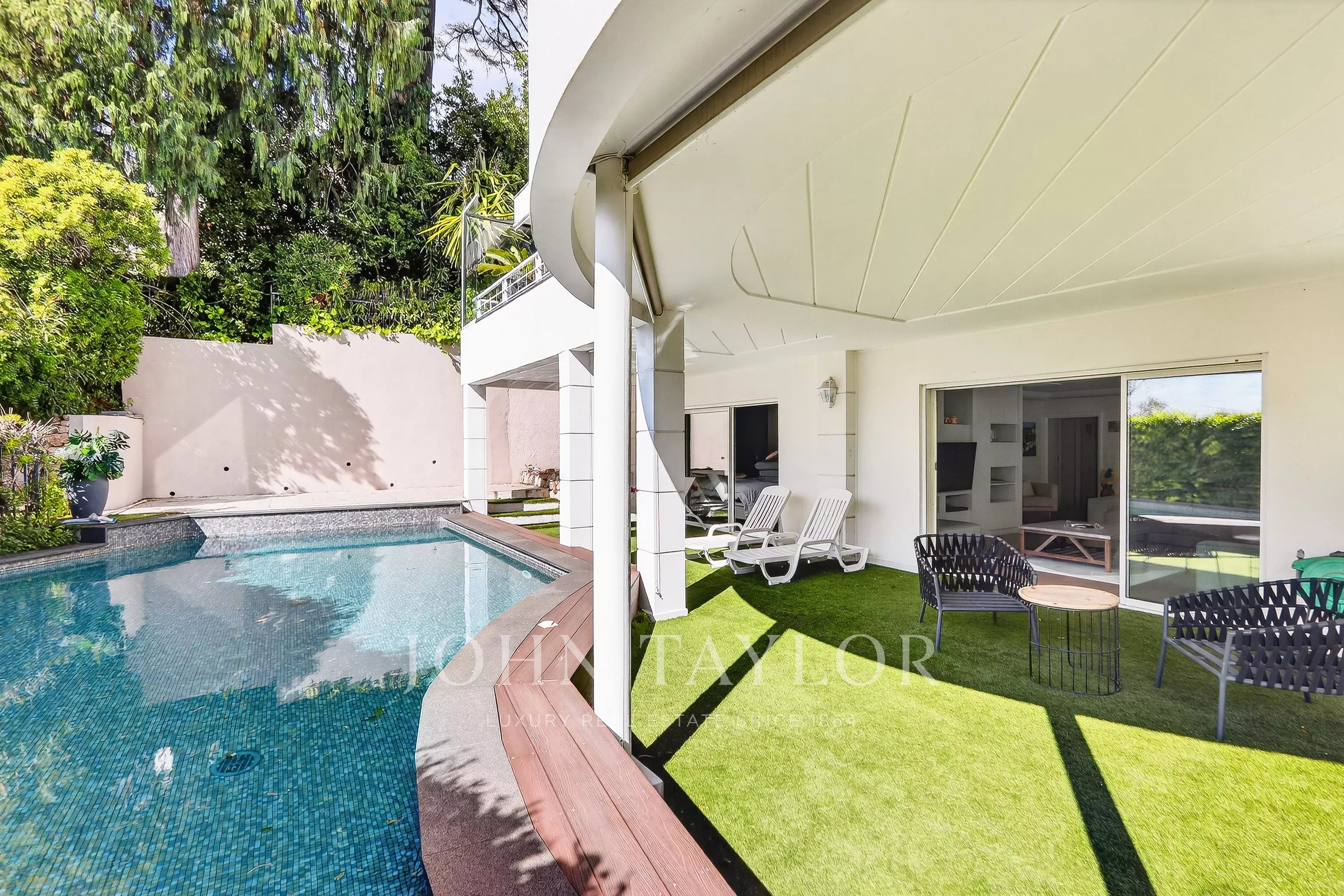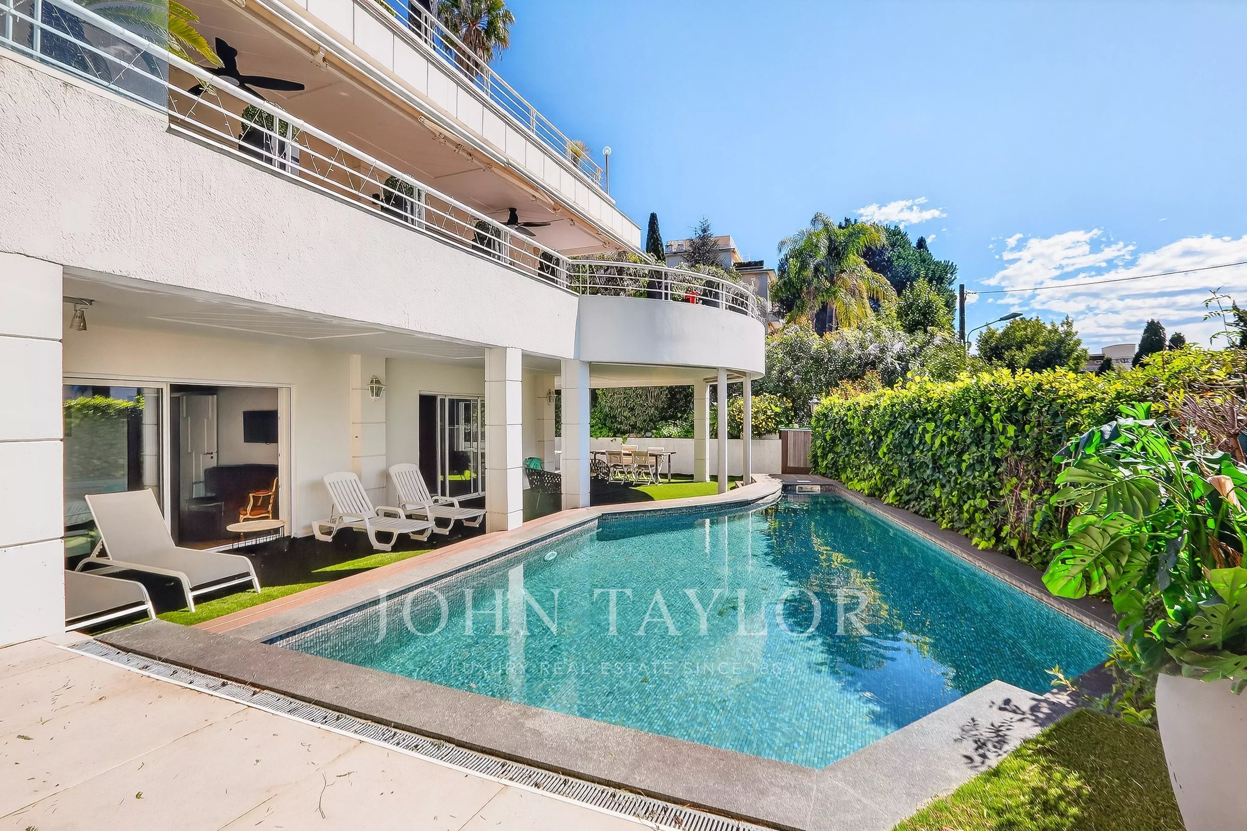 Situé dans le quartier résidentiel et verdoyant de la Californie, à proximité immédiate du centre-ville et du complexe sportif du Parc Montfleury, ce magnifique appartement de 162 m², entièrement rénové, se trouve en rez-de-jardin et bénéficie d’une piscine privative.
