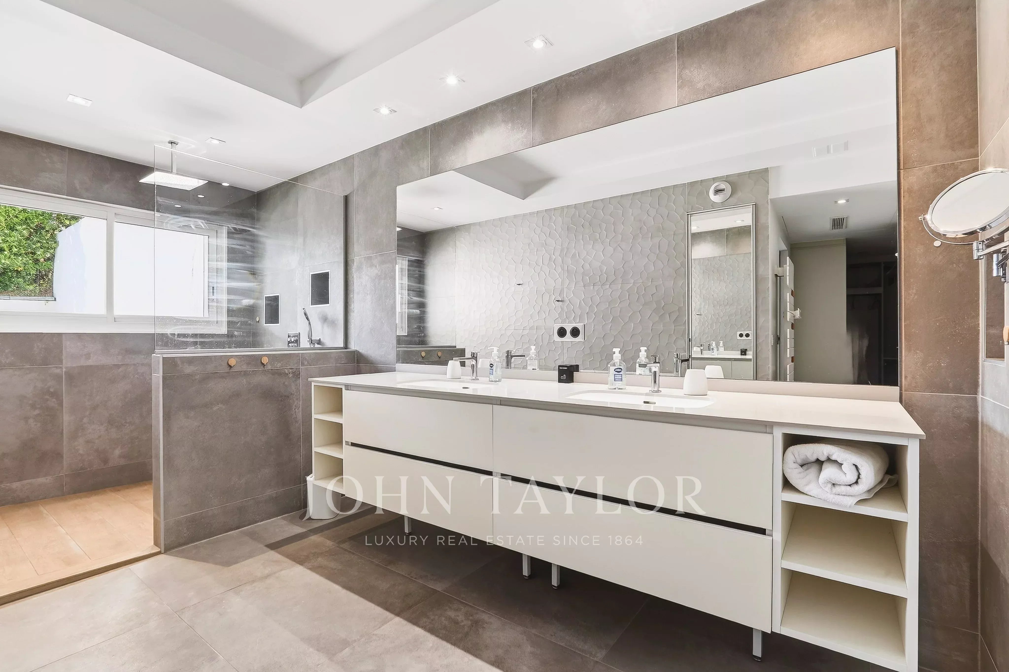 Il se compose d’une entrée, d’un vaste séjour lumineux avec cuisine équipée semi-ouverte, ouvrant sur une terrasse, un jardin et une piscine, pour une superficie extérieure totale d’environ 255 m². L’espace nuit comprend trois chambres en suite, dont deux avec salle de douche et une avec salle de bain, ainsi qu’un patio et de nombreux rangements.