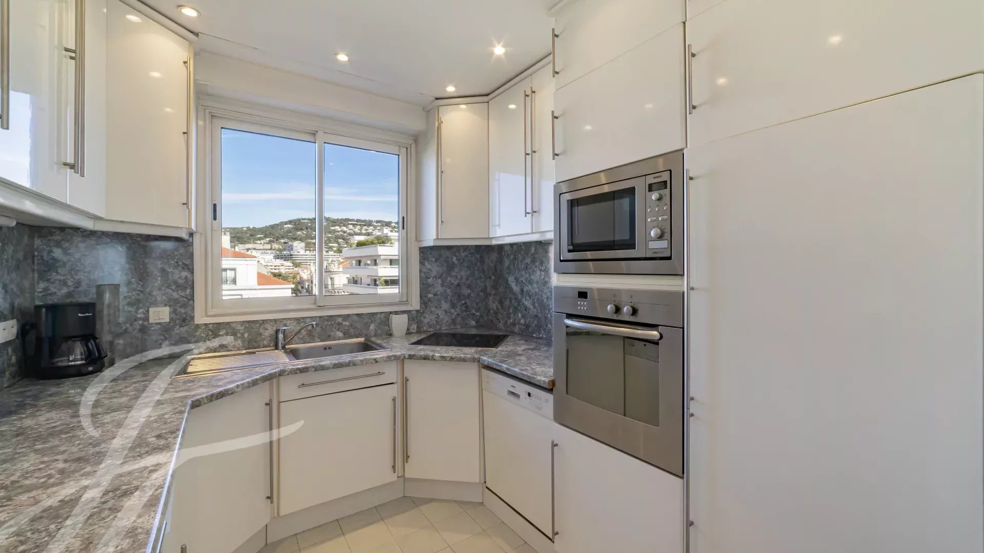 Situé au sein d’une résidence renommée, idéalement placée entre la Croisette et la rue d’Antibes, ce bel appartement, en parfait état, se trouve à l’avant-dernier étage et bénéficie d’un aperçu mer.
