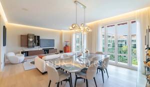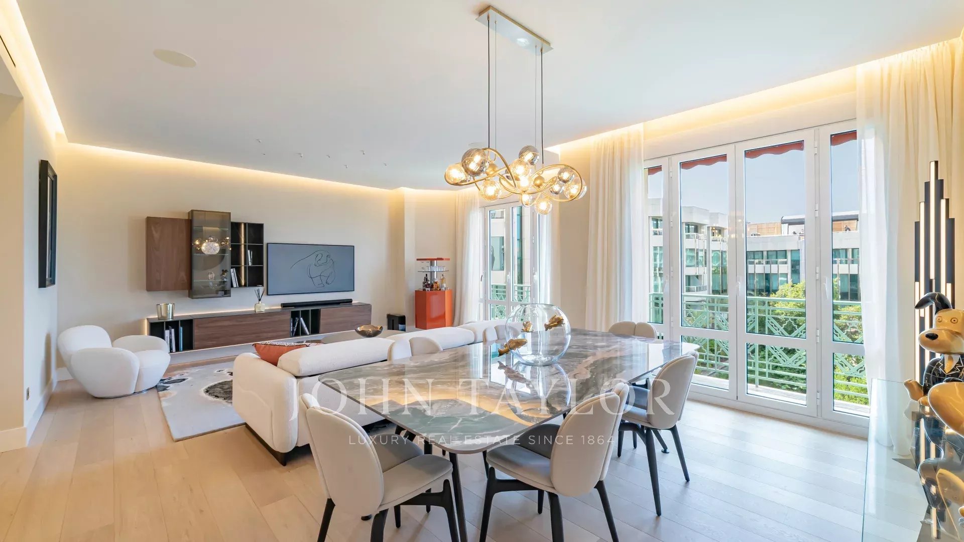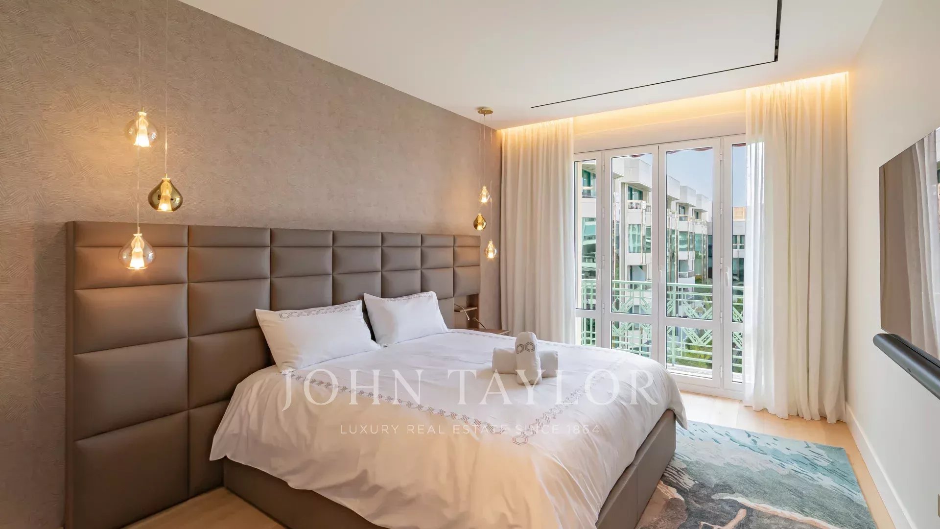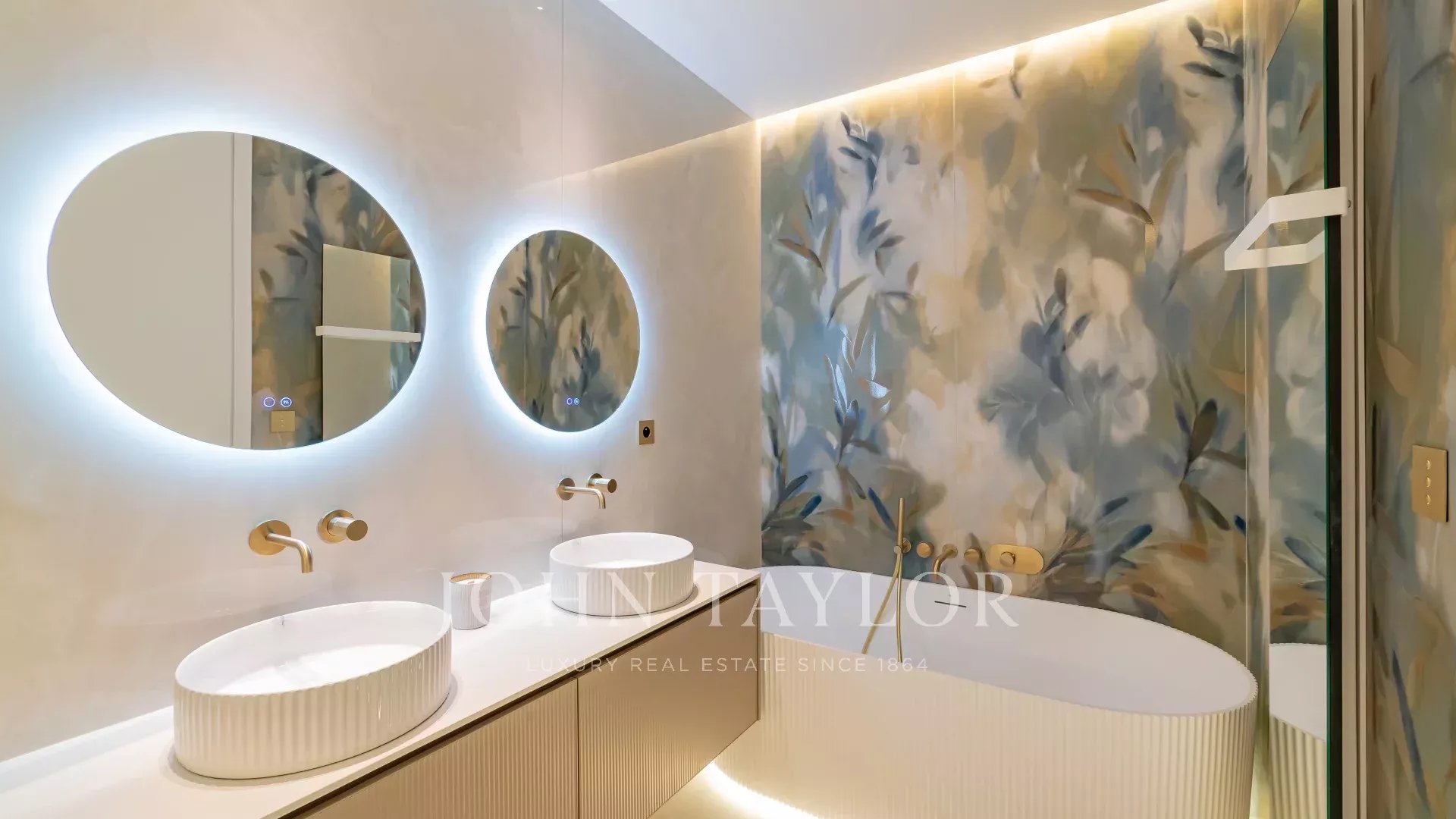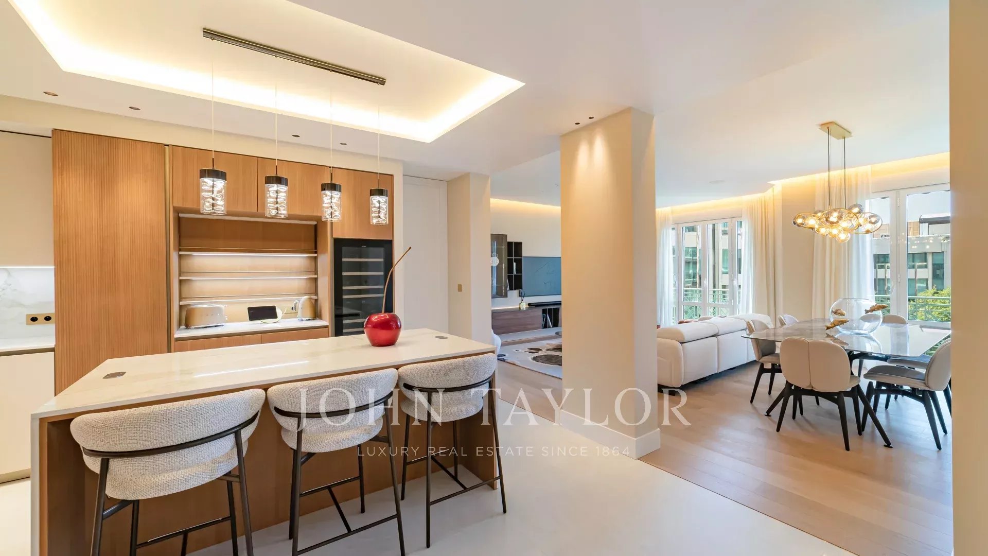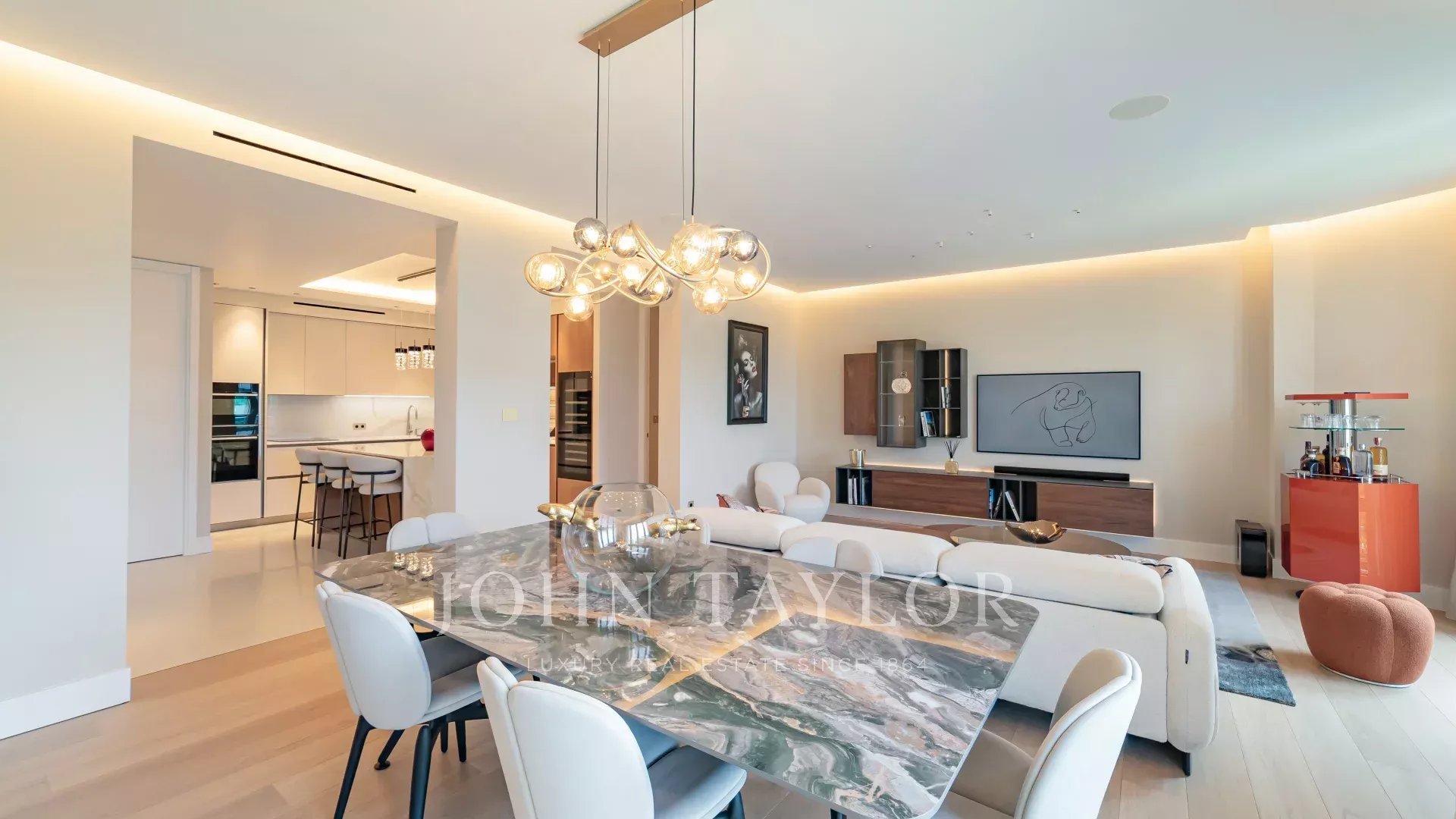L’appartement se compose d’une entrée, d’une cuisine américaine ouverte sur un vaste salon et une salle à manger lumineuse. Il dispose de deux chambres en suite, chacune avec sa propre salle de douche, une chambre de maître avec dressing, douche et baignoire, ainsi que de toilettes invités et d’une buanderie.