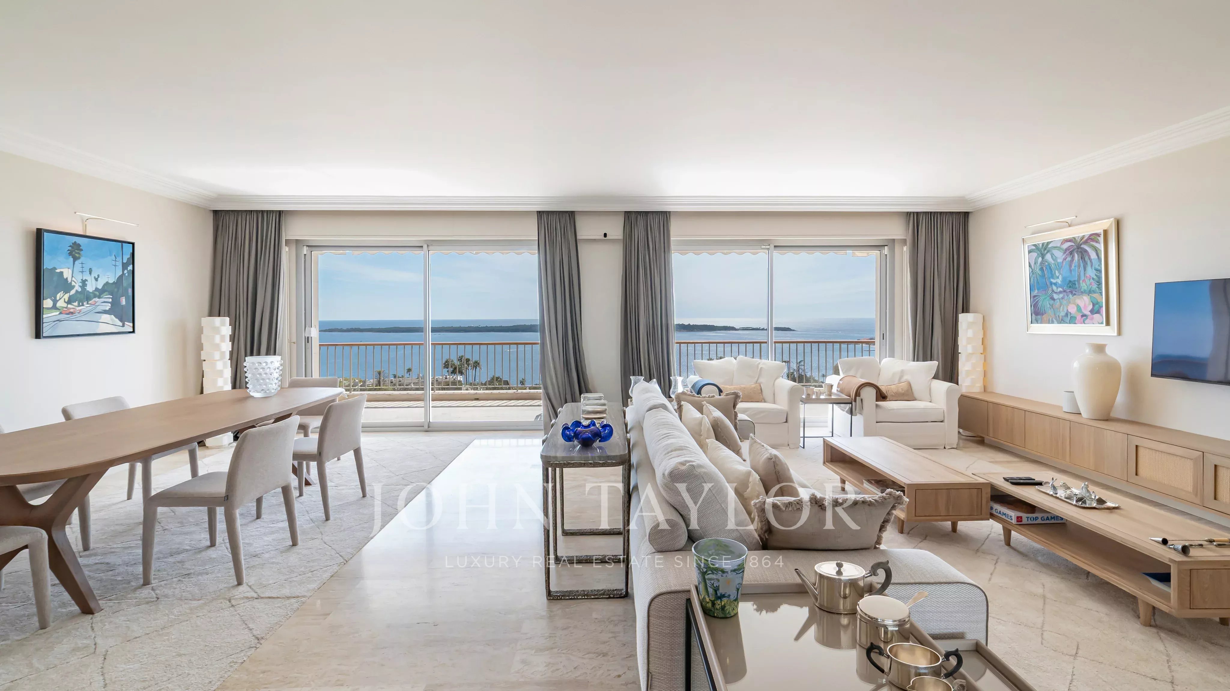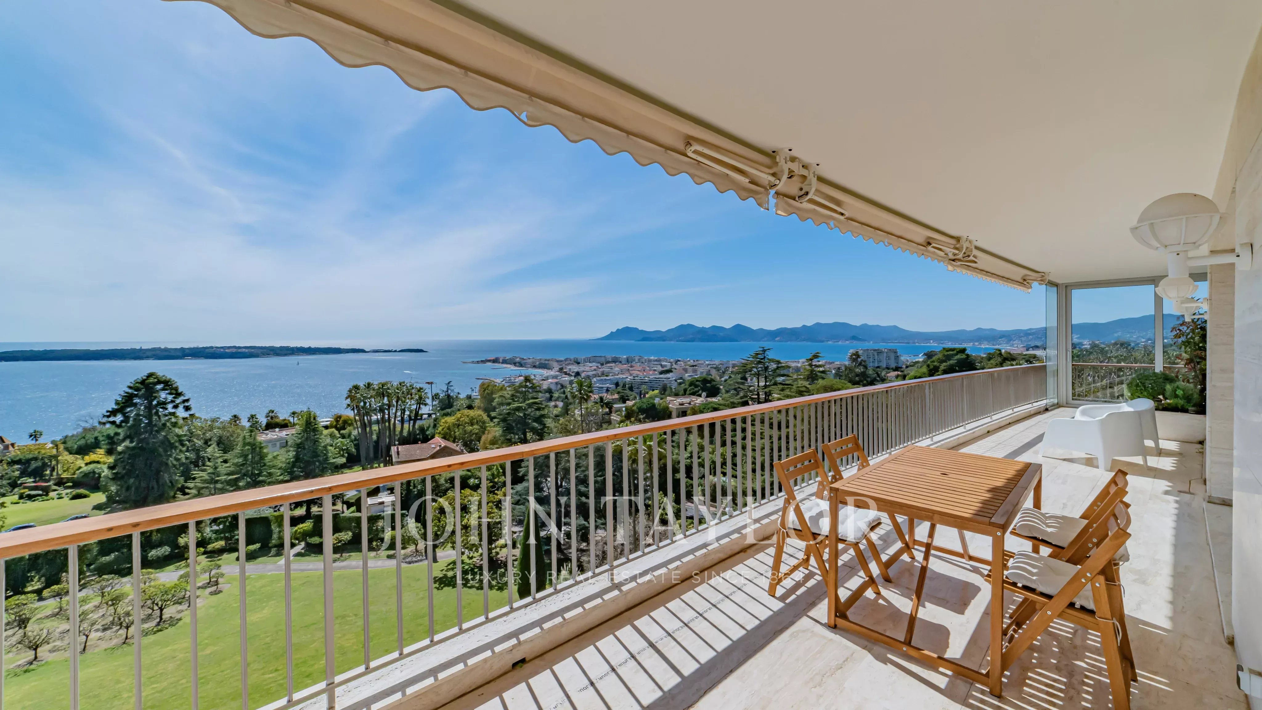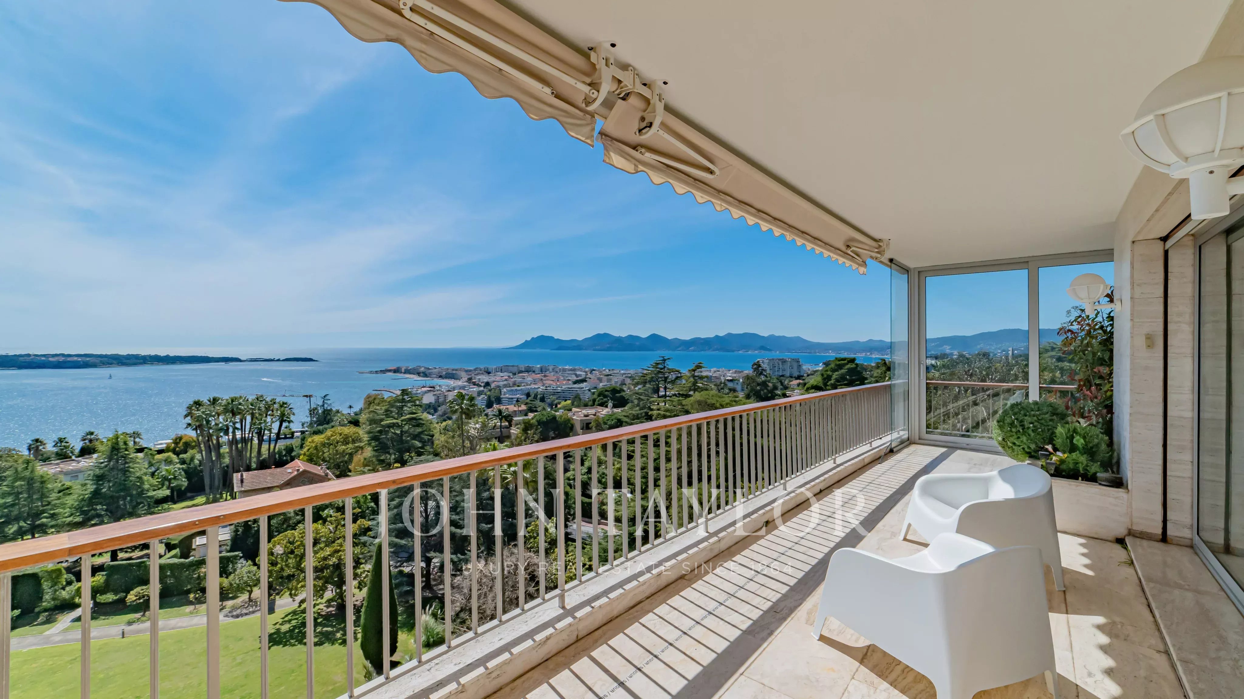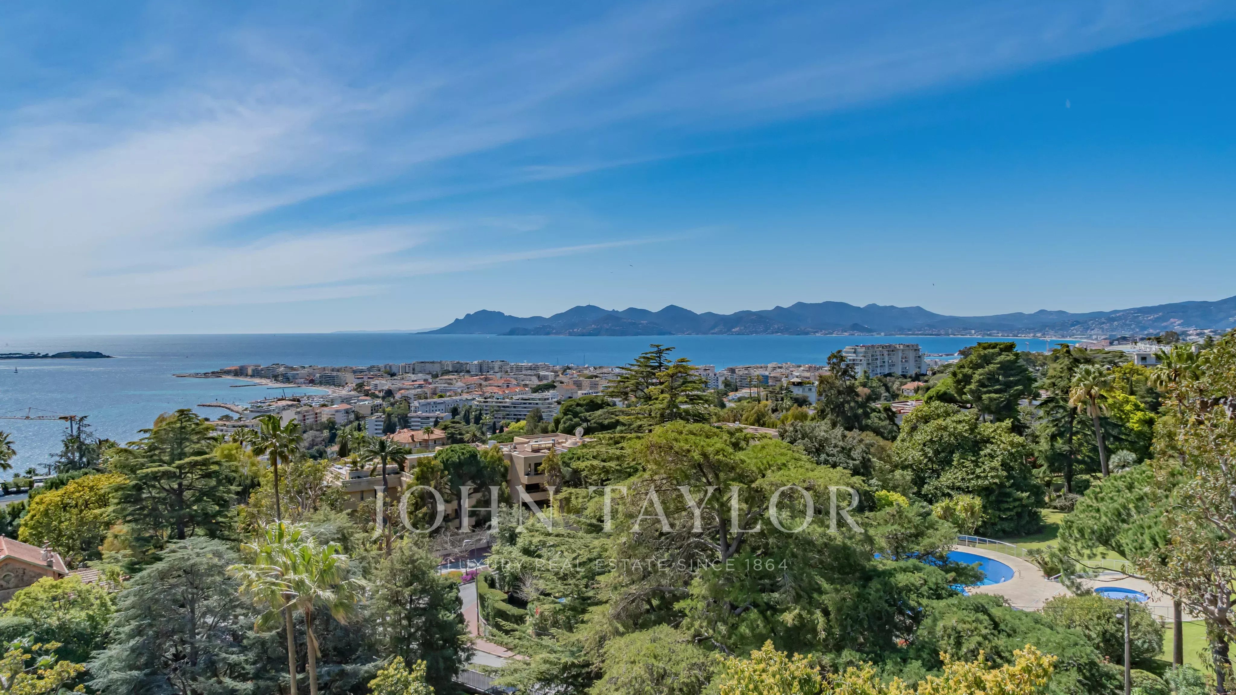 Situé dans une résidence de prestige avec piscine, tennis, navette et concierge, ce somptueux appartement d’angle d’environ 213 m² habitable (190 Loi Carrez), en étage élevé, offre une vue imprenable sur la mer, les îles de Lérins, la baie de Cannes et l’Estérel.