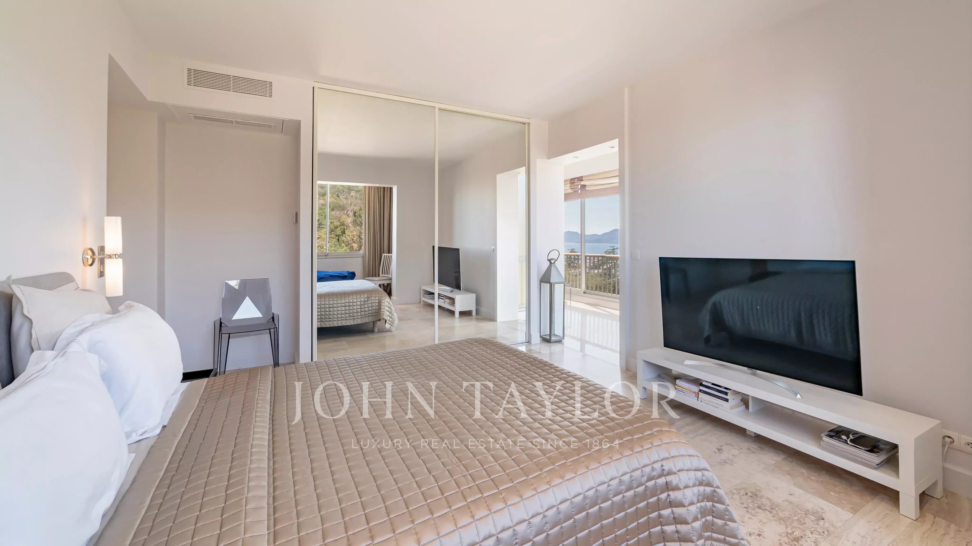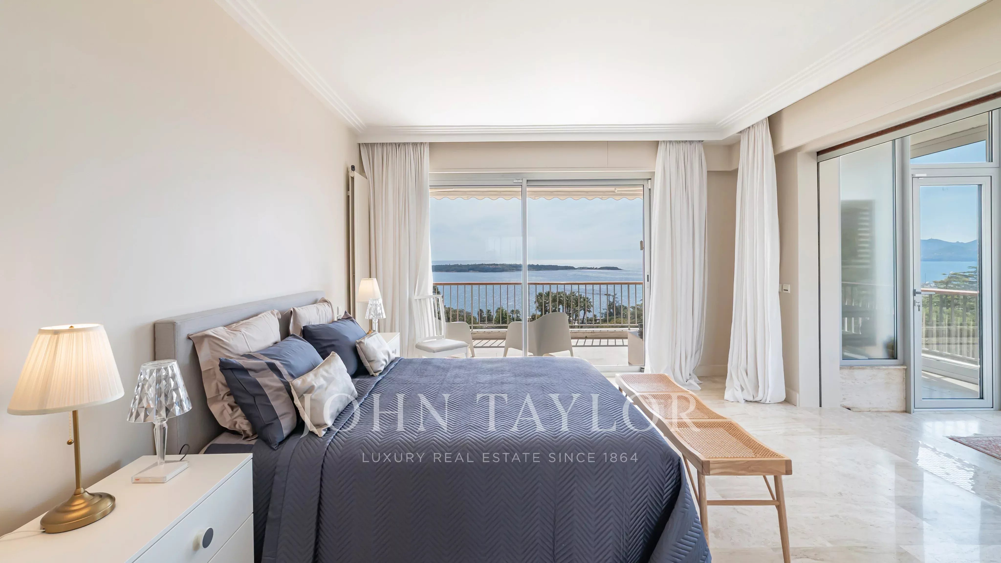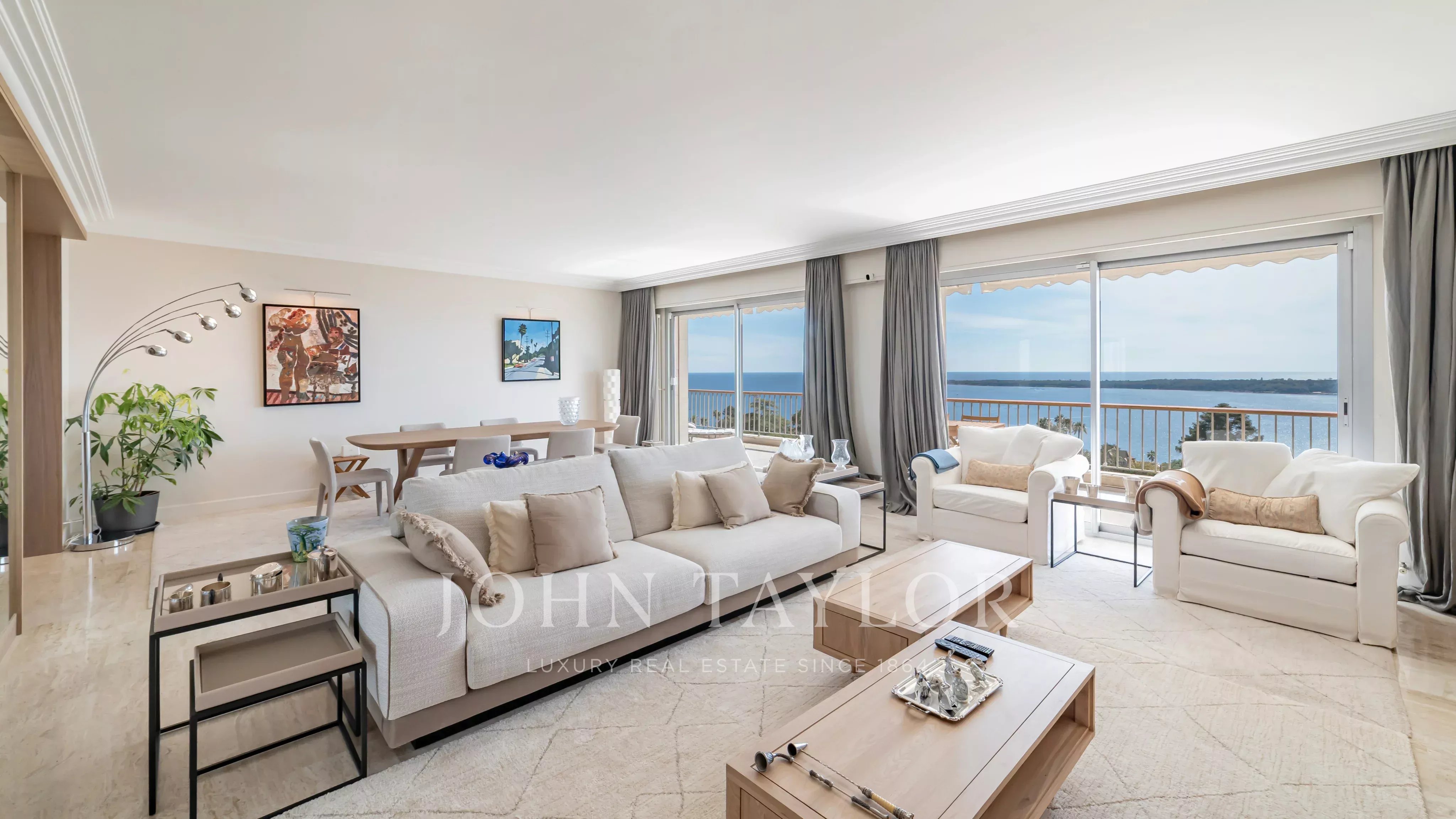 Situé dans une résidence de prestige avec piscine, tennis, navette et concierge, ce somptueux appartement d’angle d’environ 213 m² habitable (190 Loi Carrez), en étage élevé, offre une vue imprenable sur la mer, les îles de Lérins, la baie de Cannes et l’Estérel.
