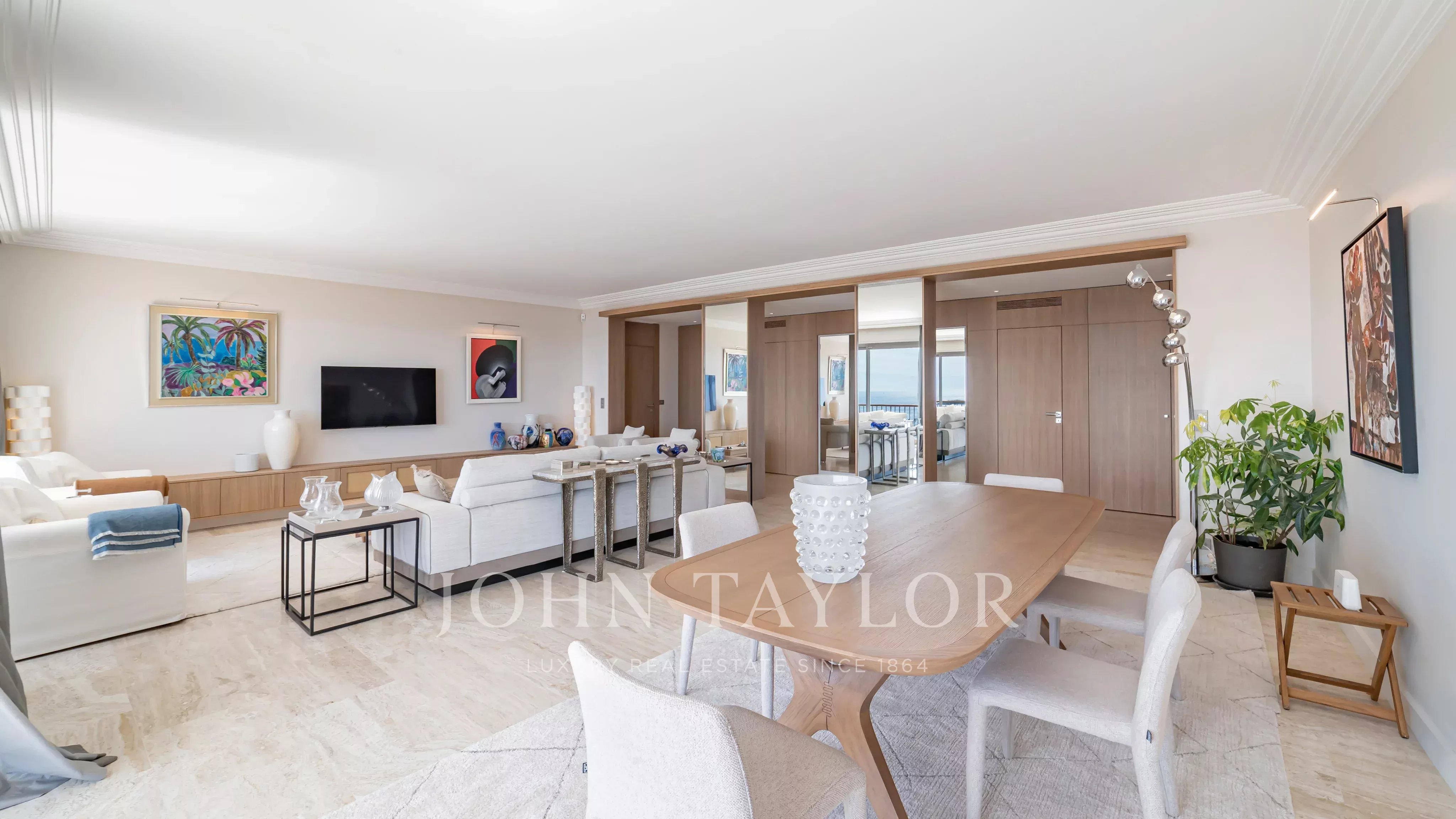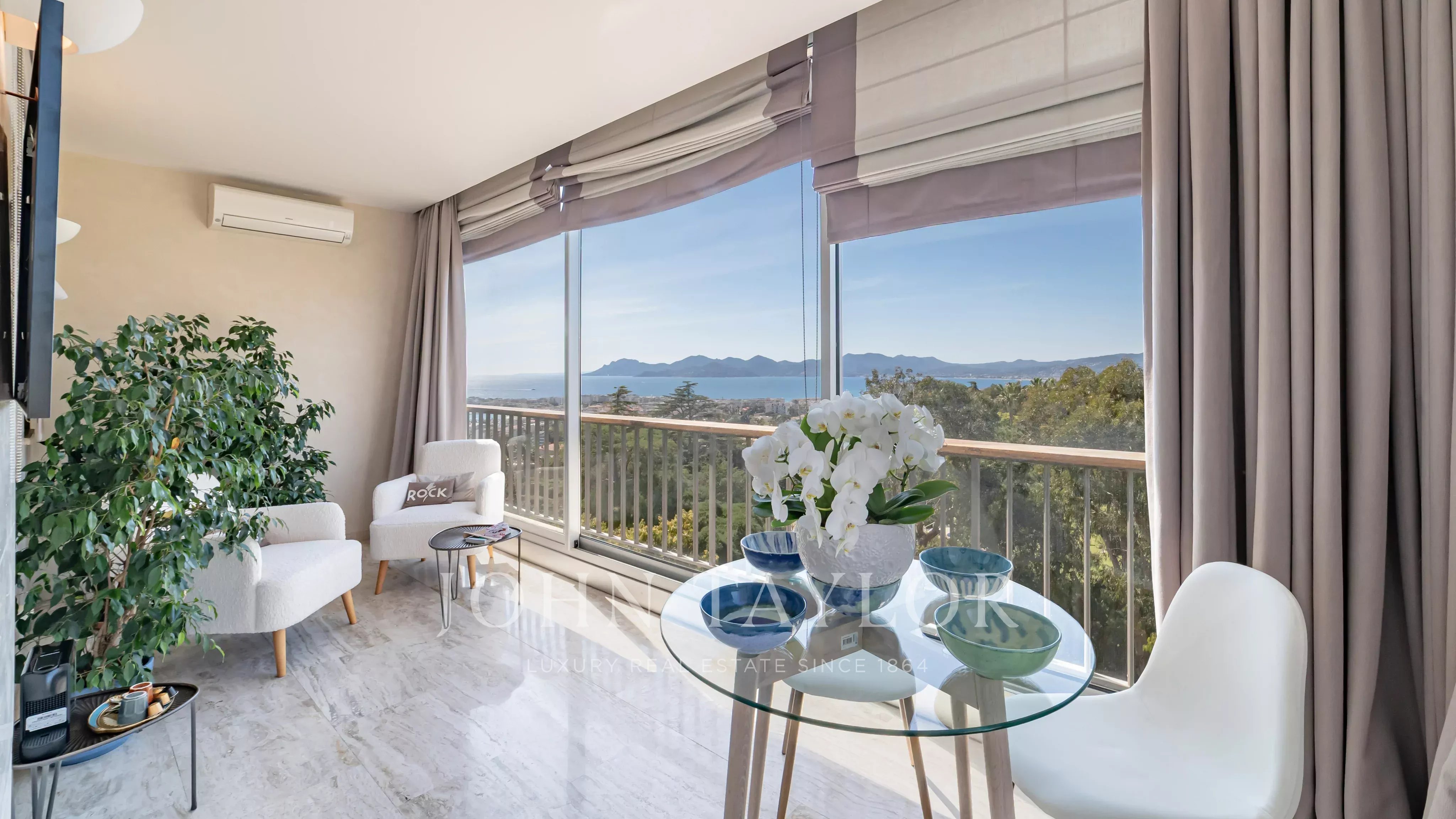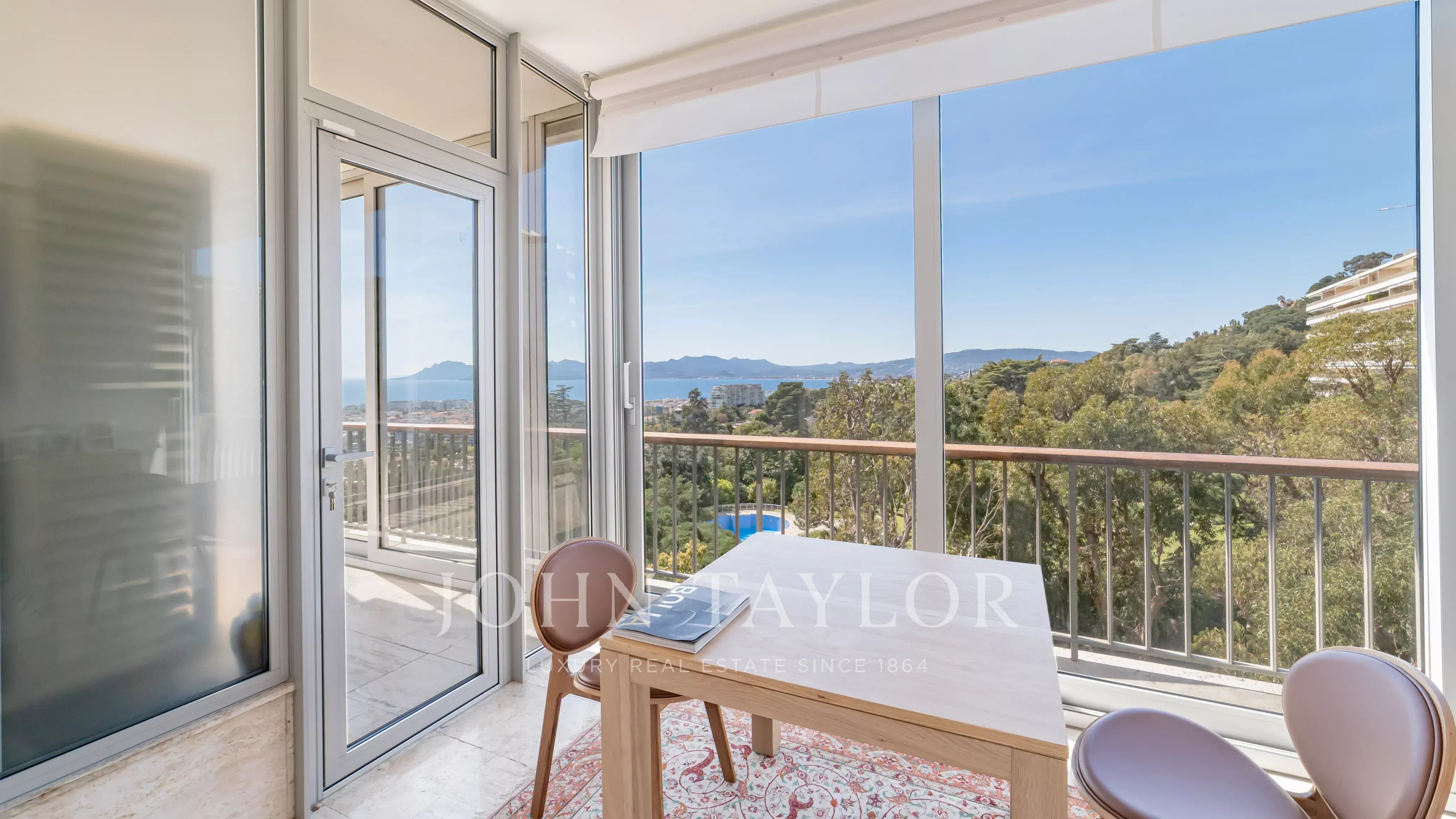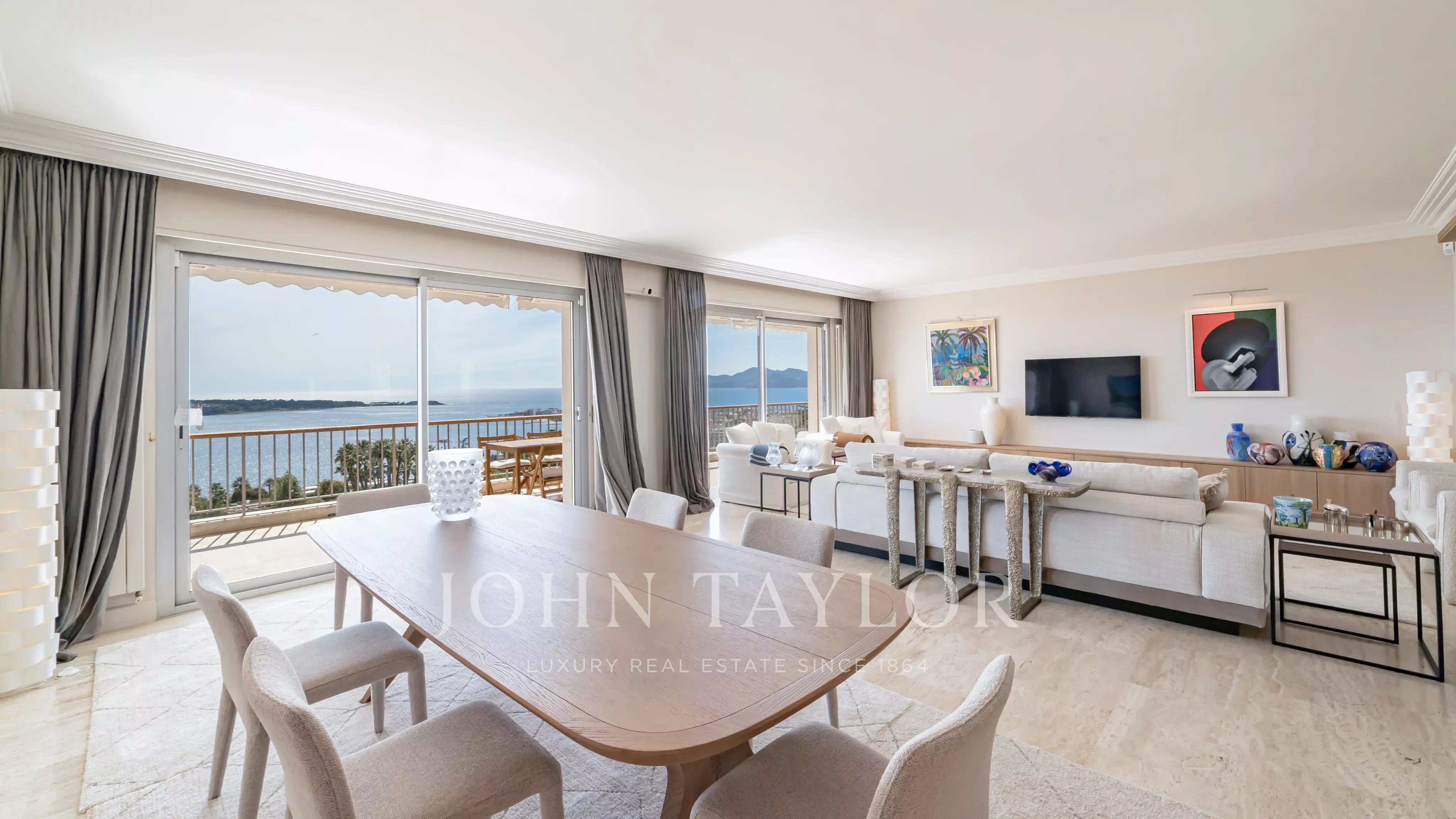 Situé dans une résidence de prestige avec piscine, tennis, navette et concierge, ce somptueux appartement d’angle d’environ 213 m² habitable (190 Loi Carrez), en étage élevé, offre une vue imprenable sur la mer, les îles de Lérins, la baie de Cannes et l’Estérel.