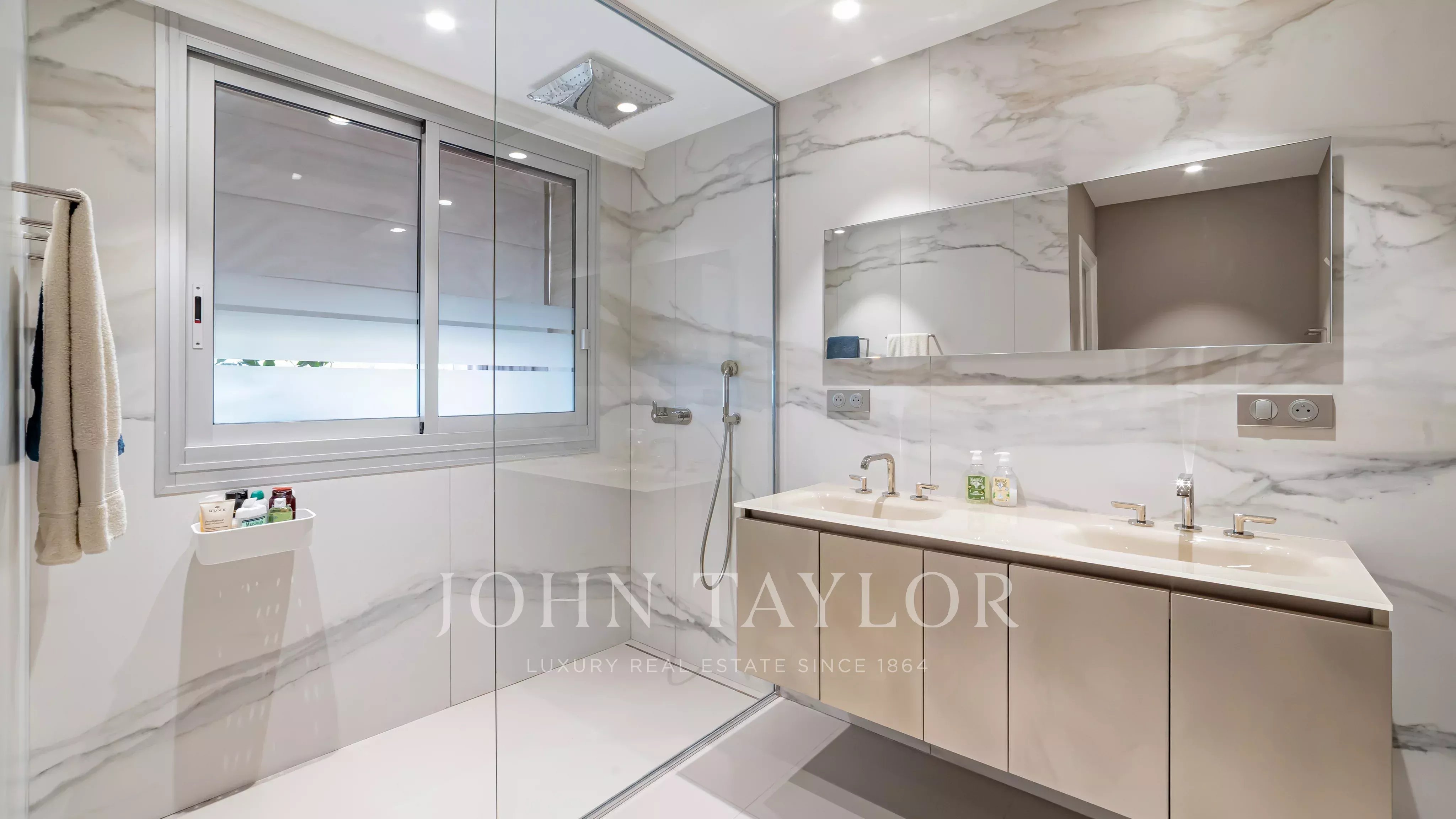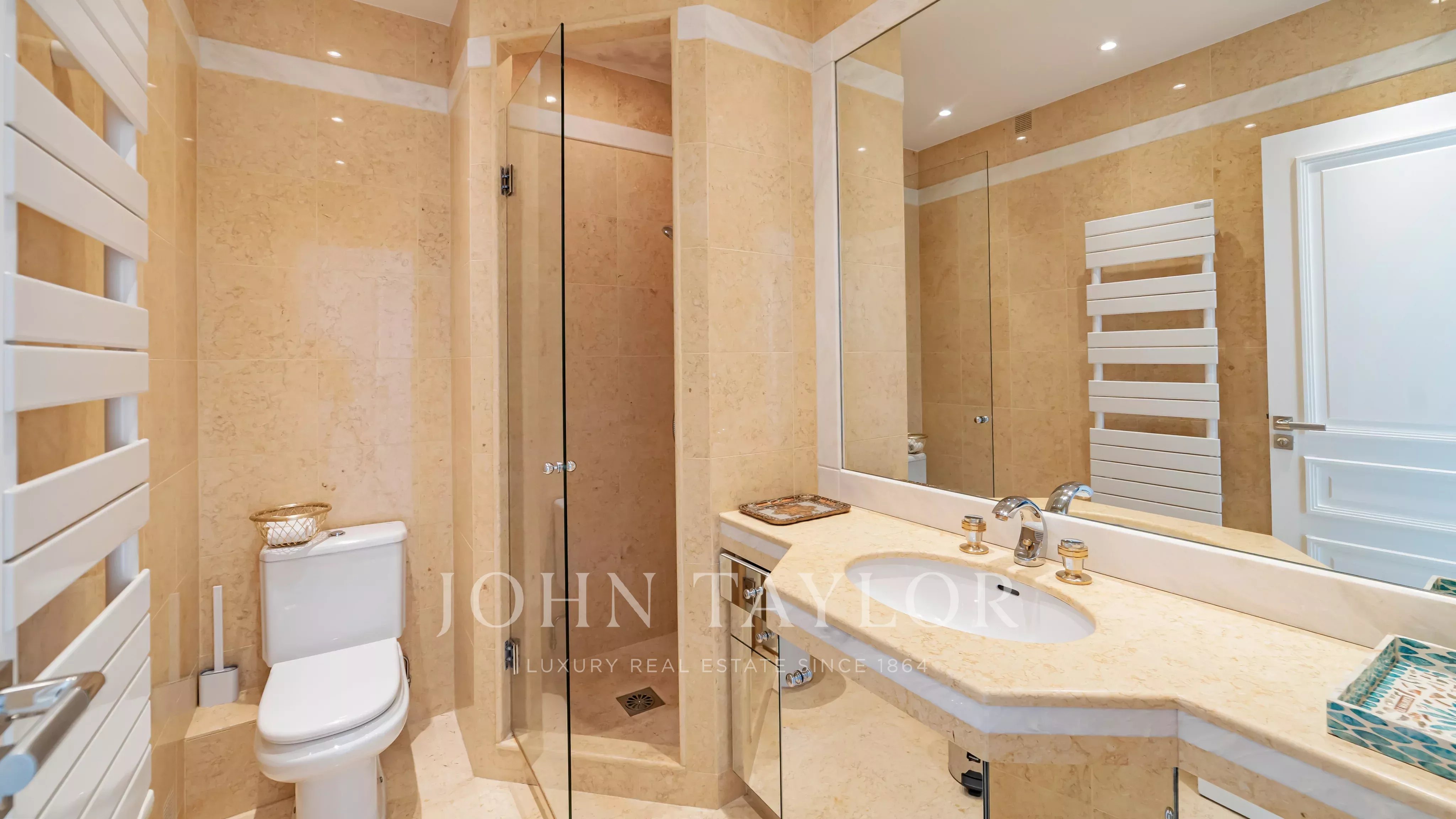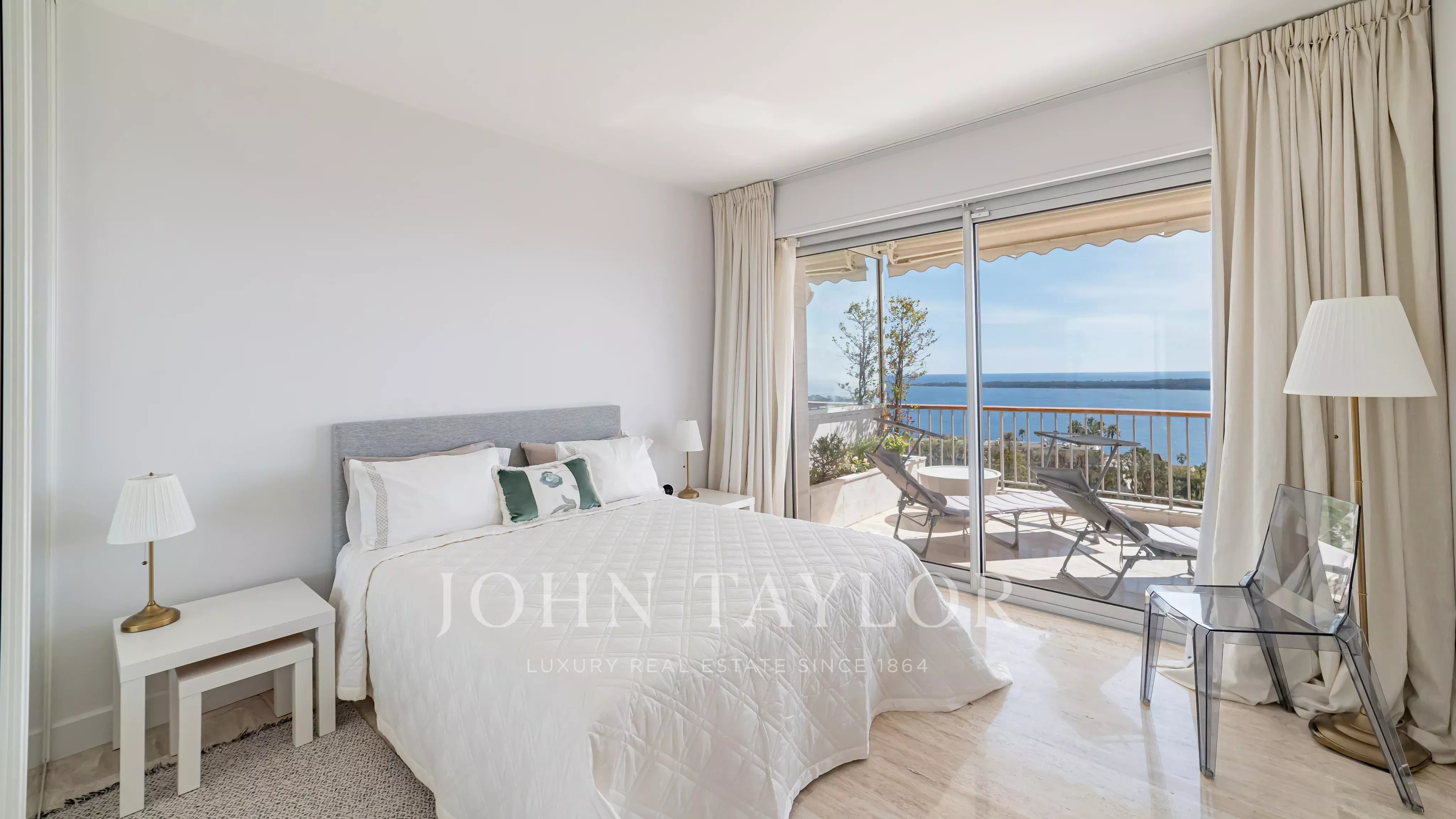 Unique à l’étage, avec un ascenseur privatif desservant directement l’appartement, il se compose de quatre chambres, dont deux avec vue panoramique mer et salle d’eau en suite, d’un vaste double séjour et d’une cuisine séparée.