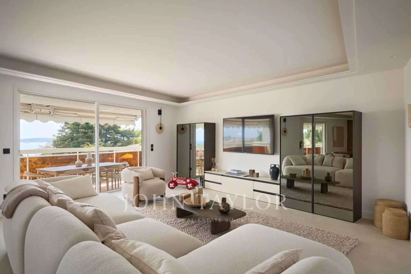 Proche des plages du Palm Beach et des commerces de proximité, dans une petite résidence de très bon standing avec piscine, cet appartement situé au dernier étage offre une surface de 135,55 m² Loi Carrez et bénéficie d'une belle terrasse de 32 m² exposée sud.