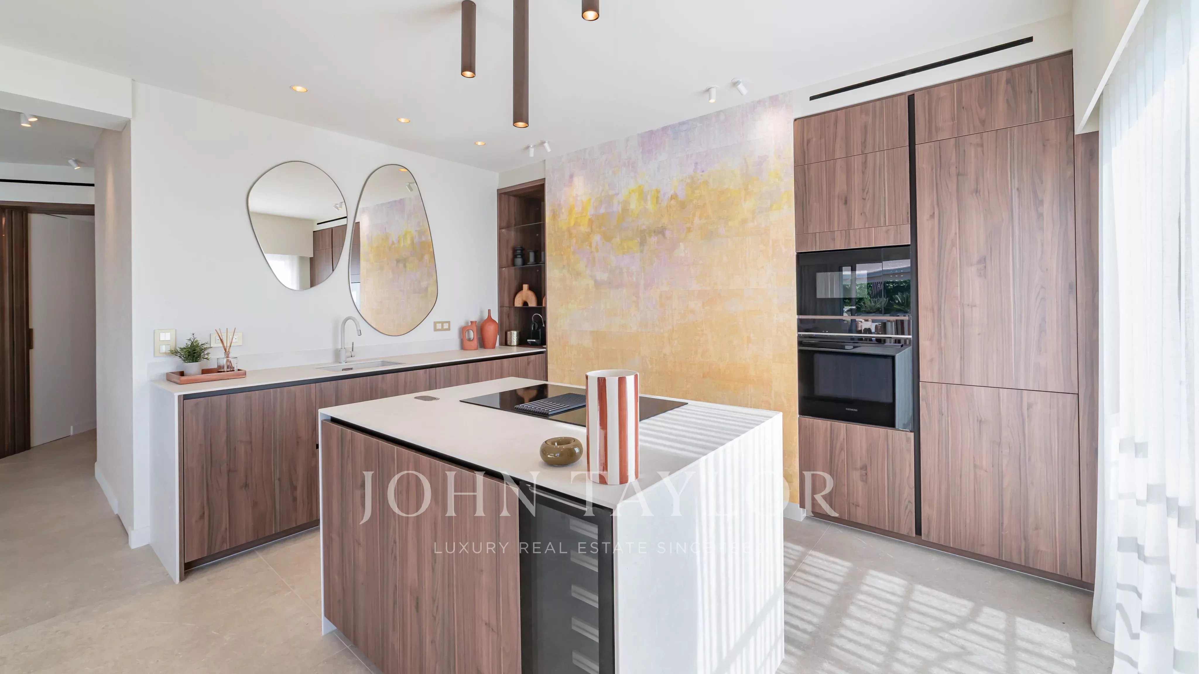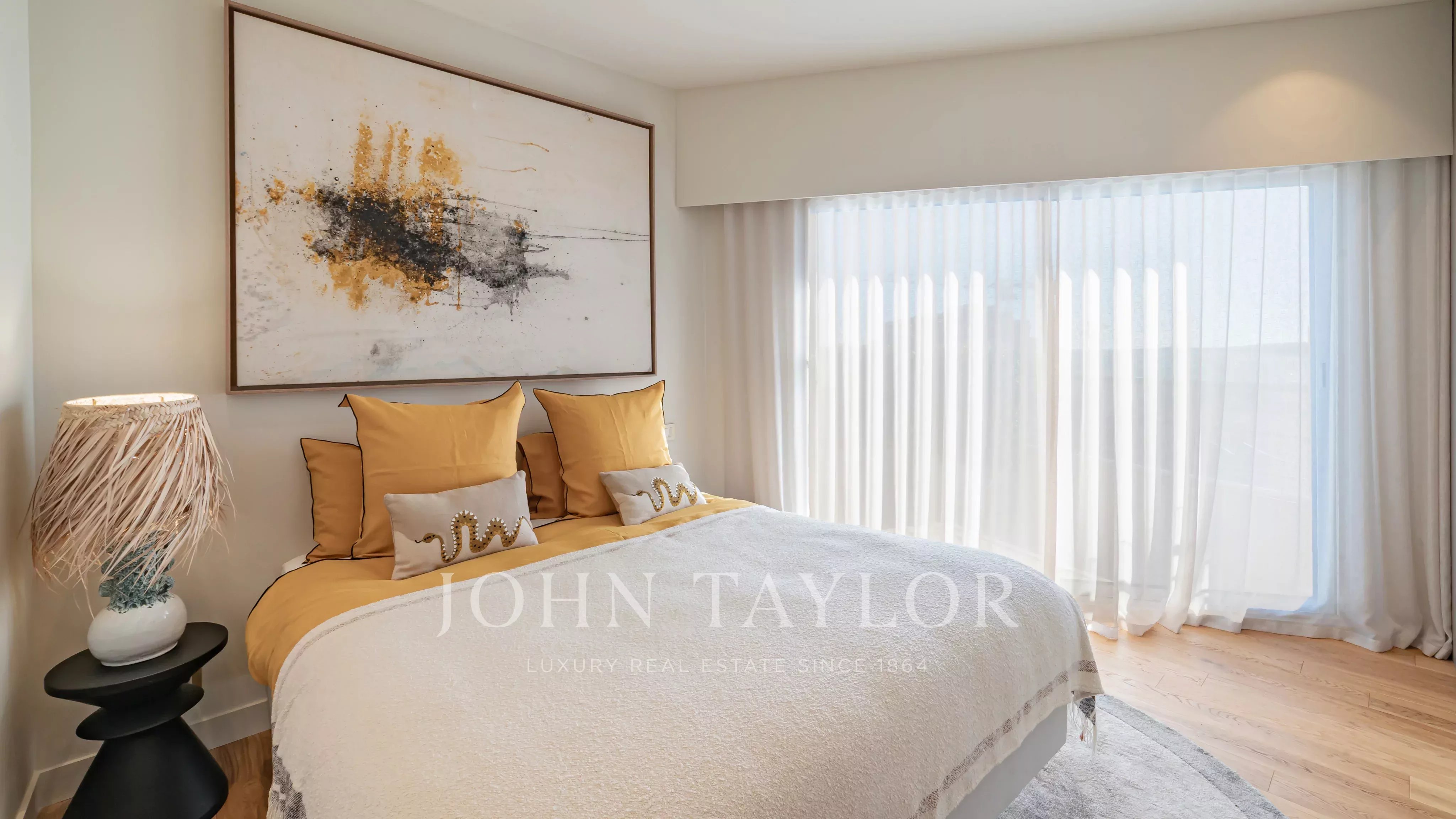 entrée, double séjour/salle à manger, cuisine ouverte entièrement équipée, le tout ouvrant sur une large terrasse d'environ 110 m² exposée sud-ouest, toilettes invités, une chambre de maître avec dressing et salle de douches en suite avec une terrasse privée offrant une belle vue sur le Port et la Californie, une salle de bains, une chambre en suite, et une troisième chambre, chacune profitant d'une terrasse privée.
