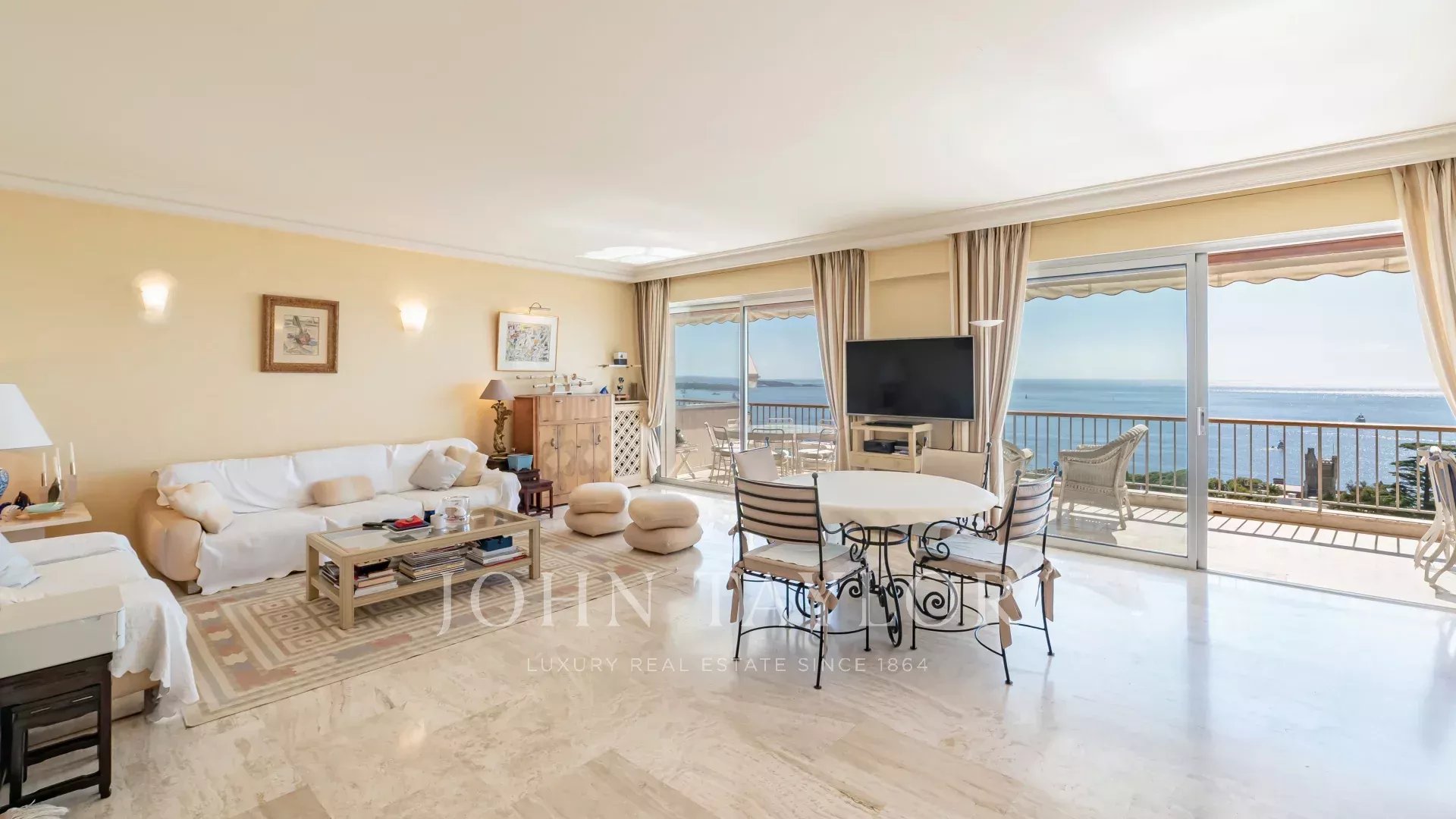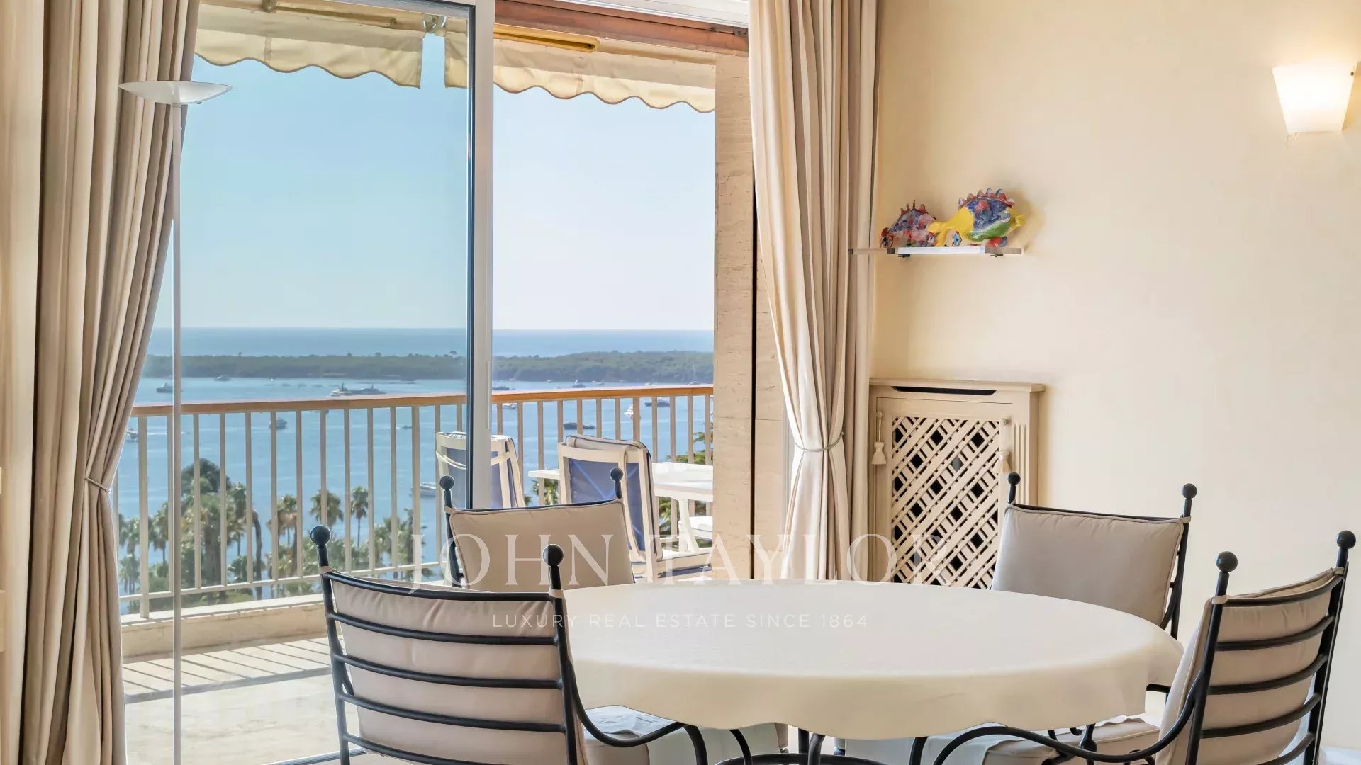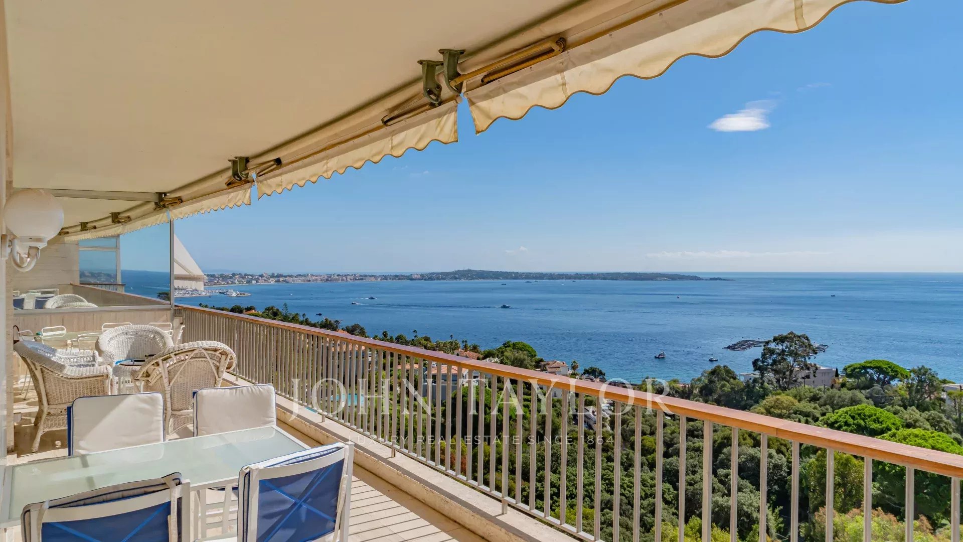 Dans une résidence de standing gardiennée 24h/24, 7j/7 au sein d'un parc de 12 ha avec piscine, tennis, salle de sport, practice de golf, service navette, ce bel appartement en étage élevé offre un panorama exceptionnel du Cap d'Antibes aux îles de Lérins et la mer.