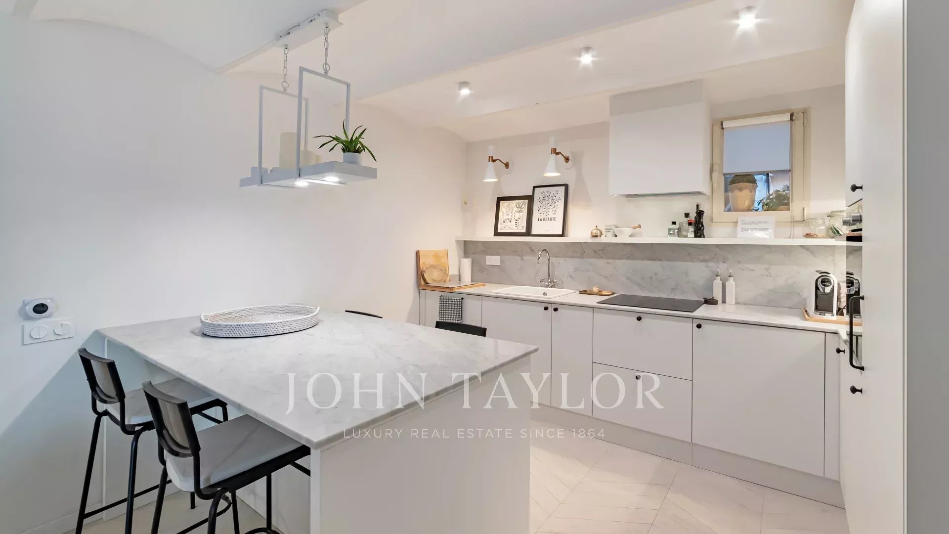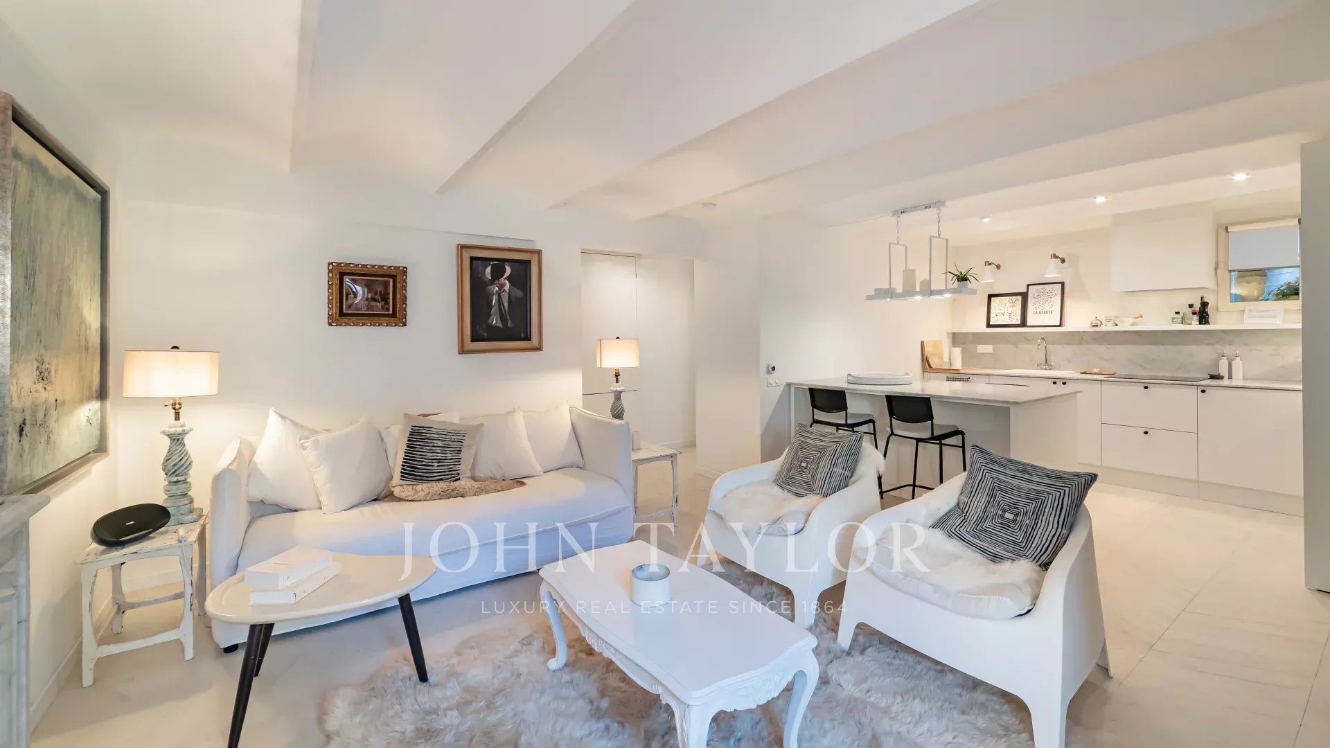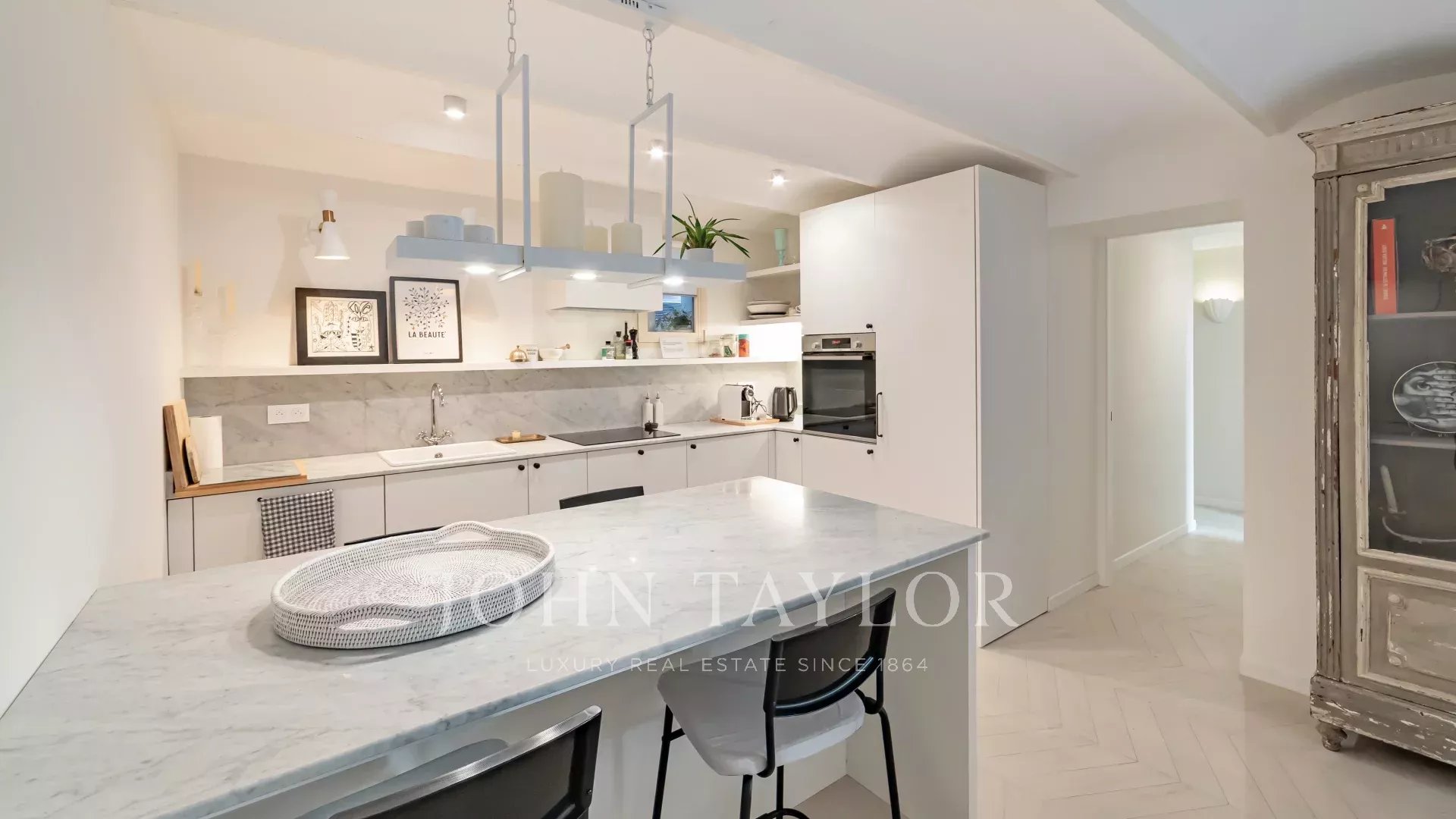 Magnifique appartement entièrement rénové avec goût comprenant un séjour lumineux avec cheminée et cuisine américaine équipée, trois chambres et trois salles de bains.