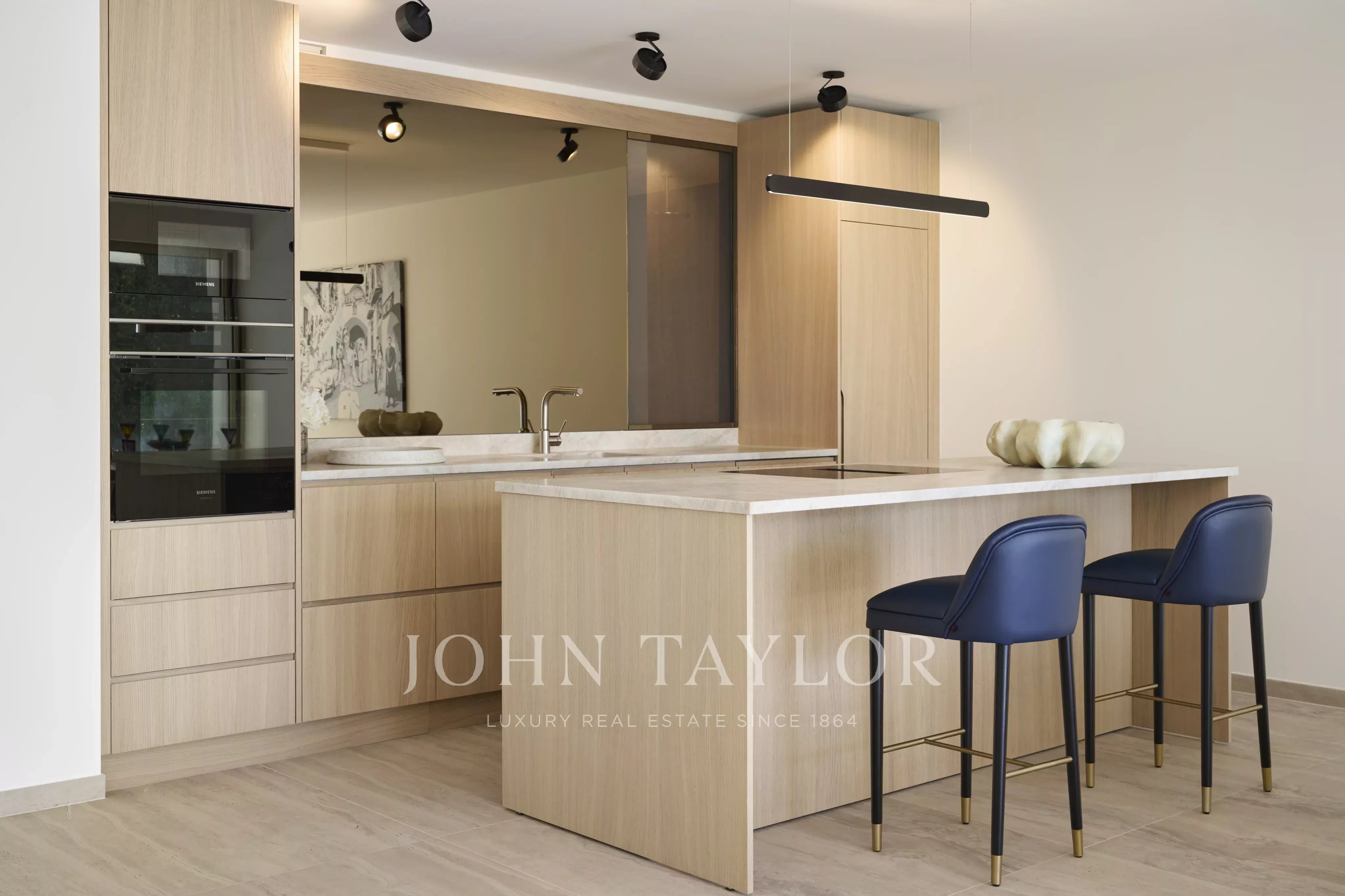 L'appartement a fait l'objet d'une rénovation complète avec des prestations haut de gamme et une décoration contemporaine raffinée. Il comprend un vaste séjour de 54 m² avec cuisine ouverte, deux chambres avec chacune leur salle d'eau et WC indépendants en suite, ainsi que de nombreux placards.