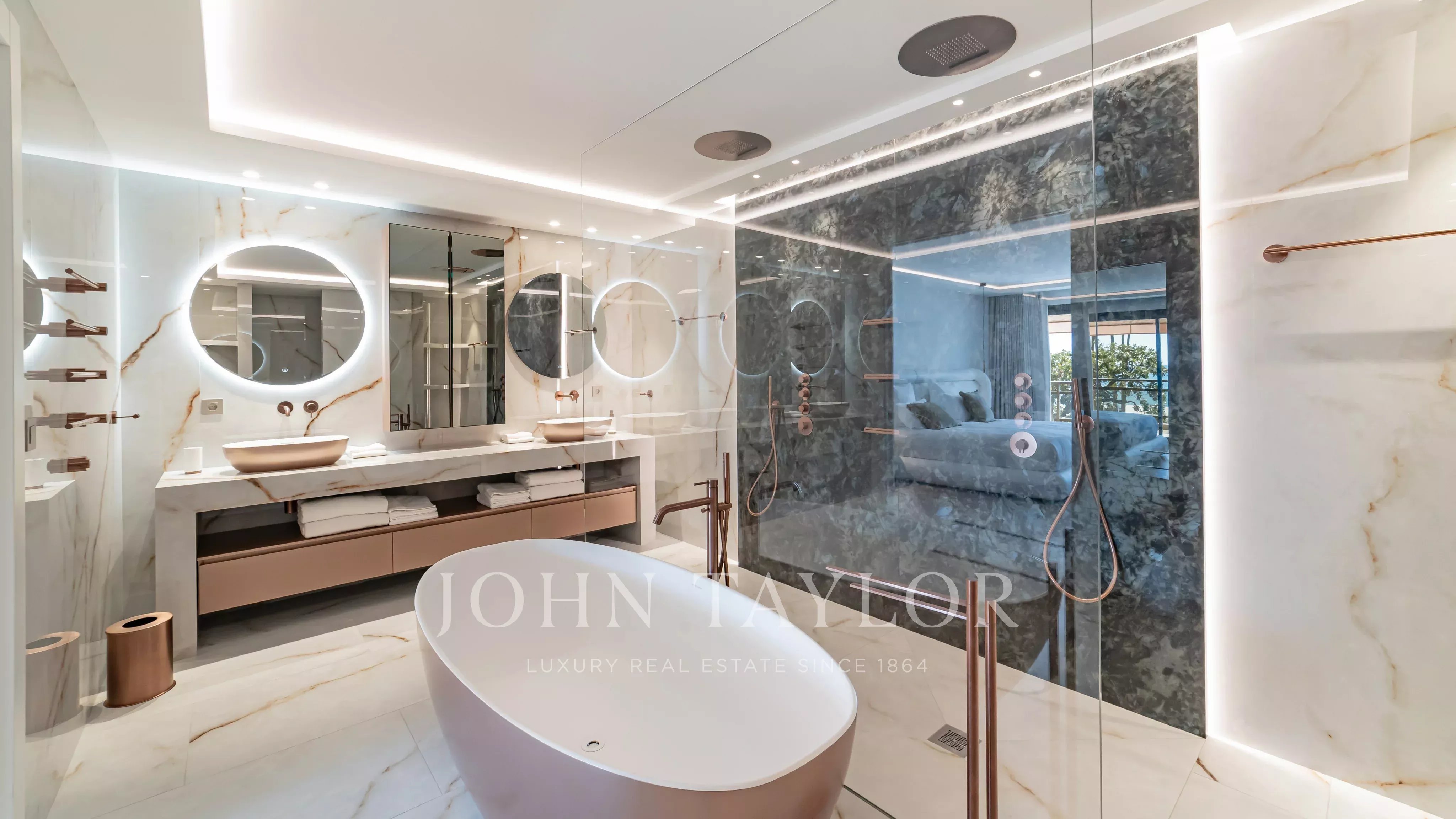 La partie nuit comprend trois superbes suites parentales, chacune avec sa salle de bains et un accès direct à la terrasse, ainsi qu’une quatrième chambre avec salle de bains également ouverte sur l’extérieur, et une cinquième chambre avec sa salle de bains.