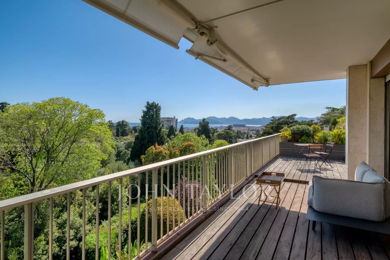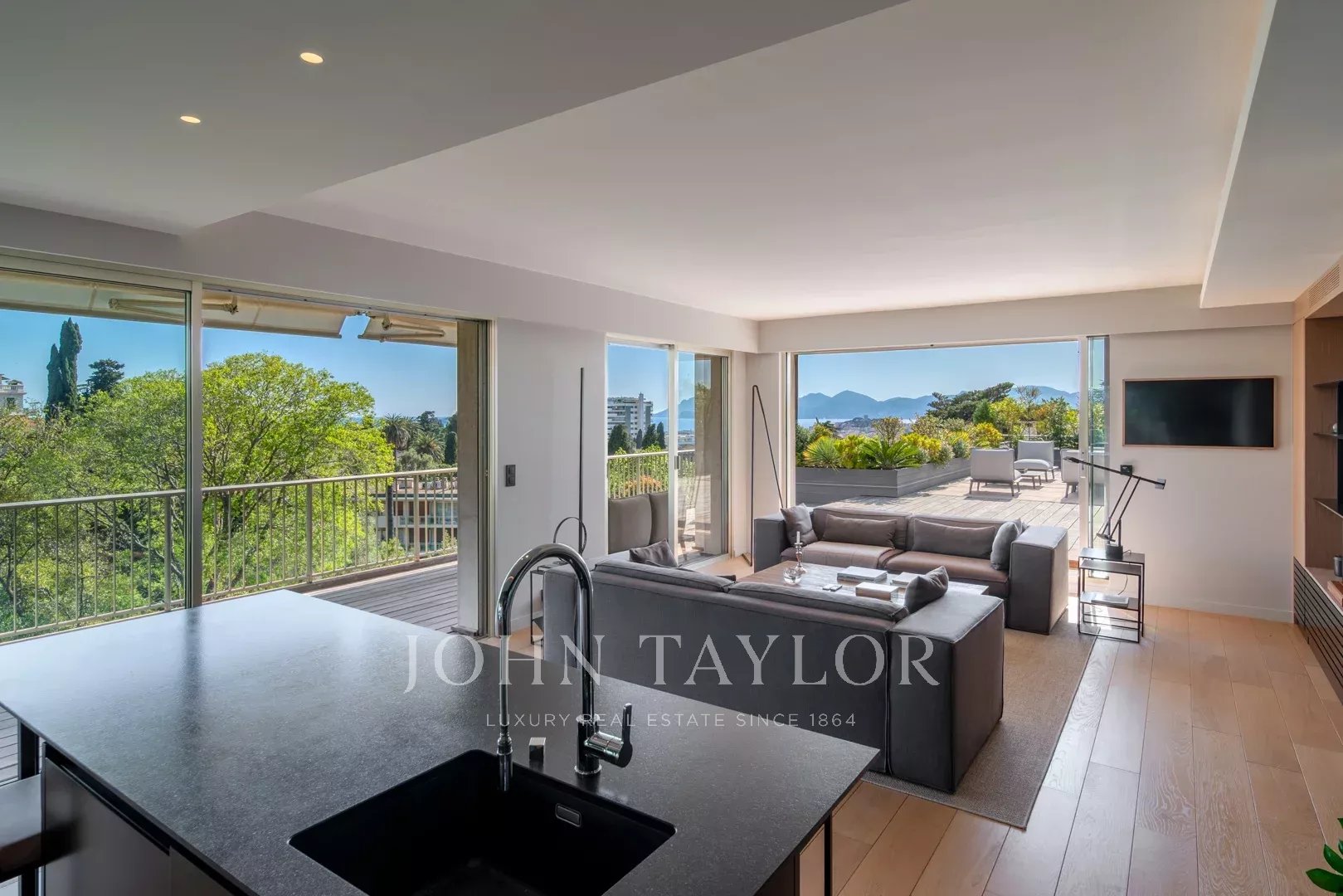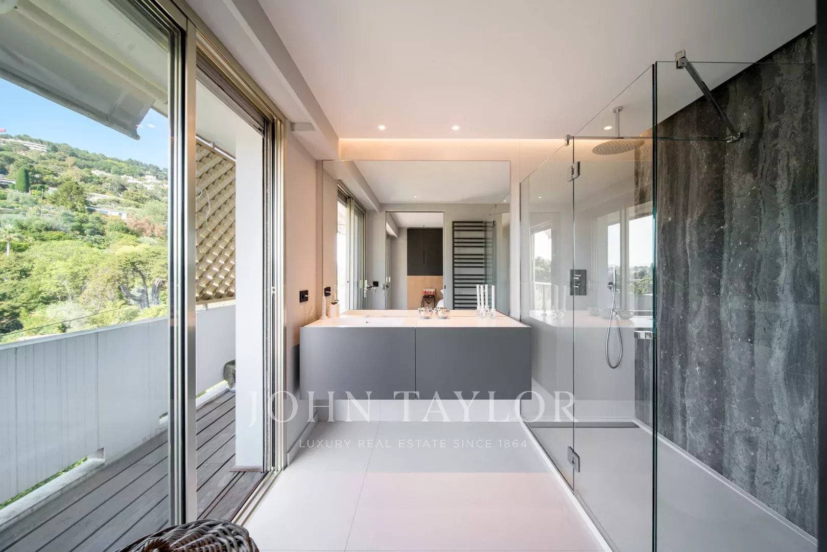 Sa spacieuse terrasse aménagée dévoile une vue panoramique exceptionnelle sur la Baie de Cannes, le Le Suquet ainsi que le Massif de l’Esterel.