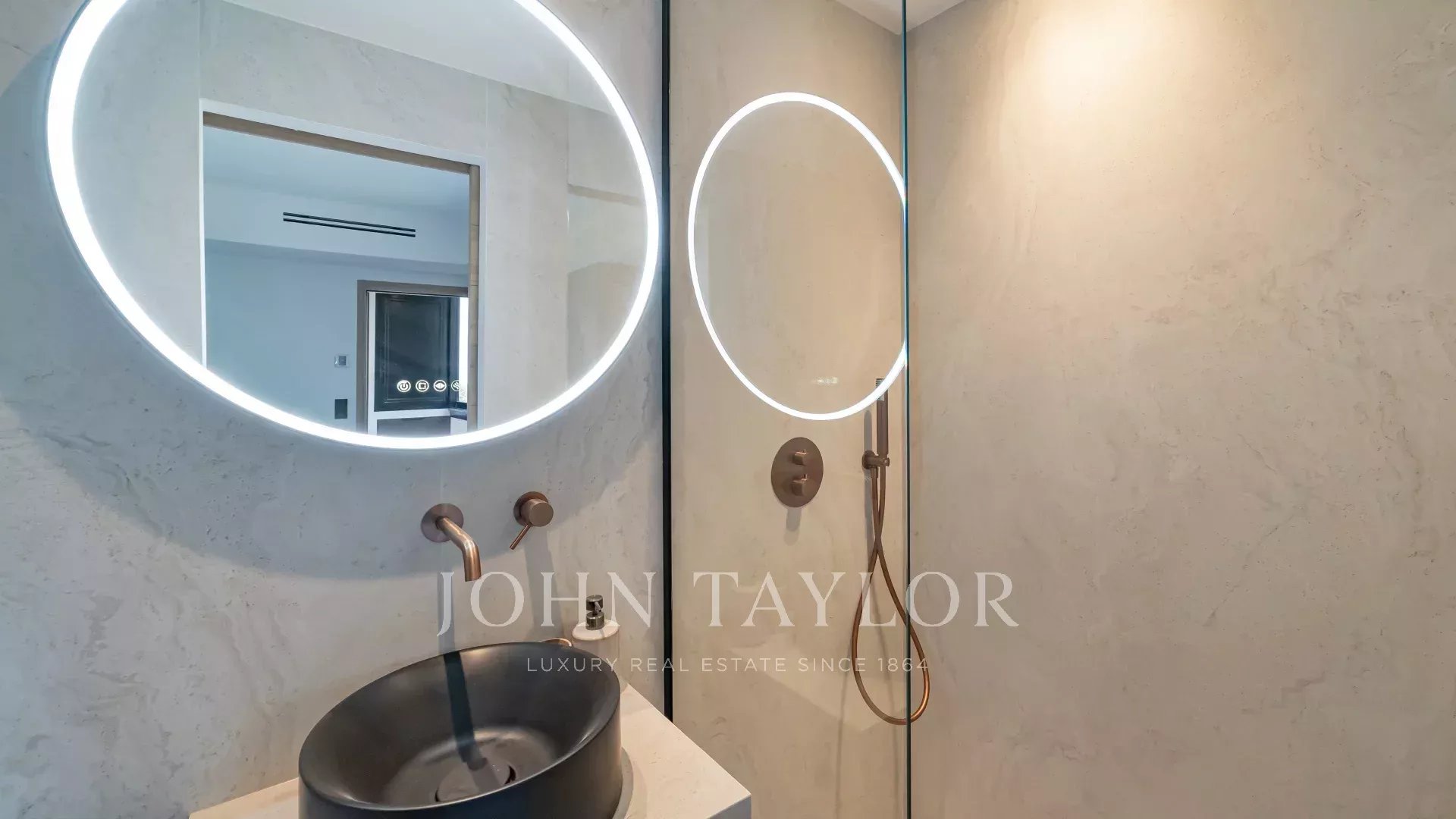 D'une surface habitable d'environ 115 m², il se compose d'une entrée, d'un séjour double, d'une cuisine américaine, de deux chambres, d'une salle de bains, d'une salle de douche, de toilettes invités et d'une terrasse de 19 m² avec balcons fermés.