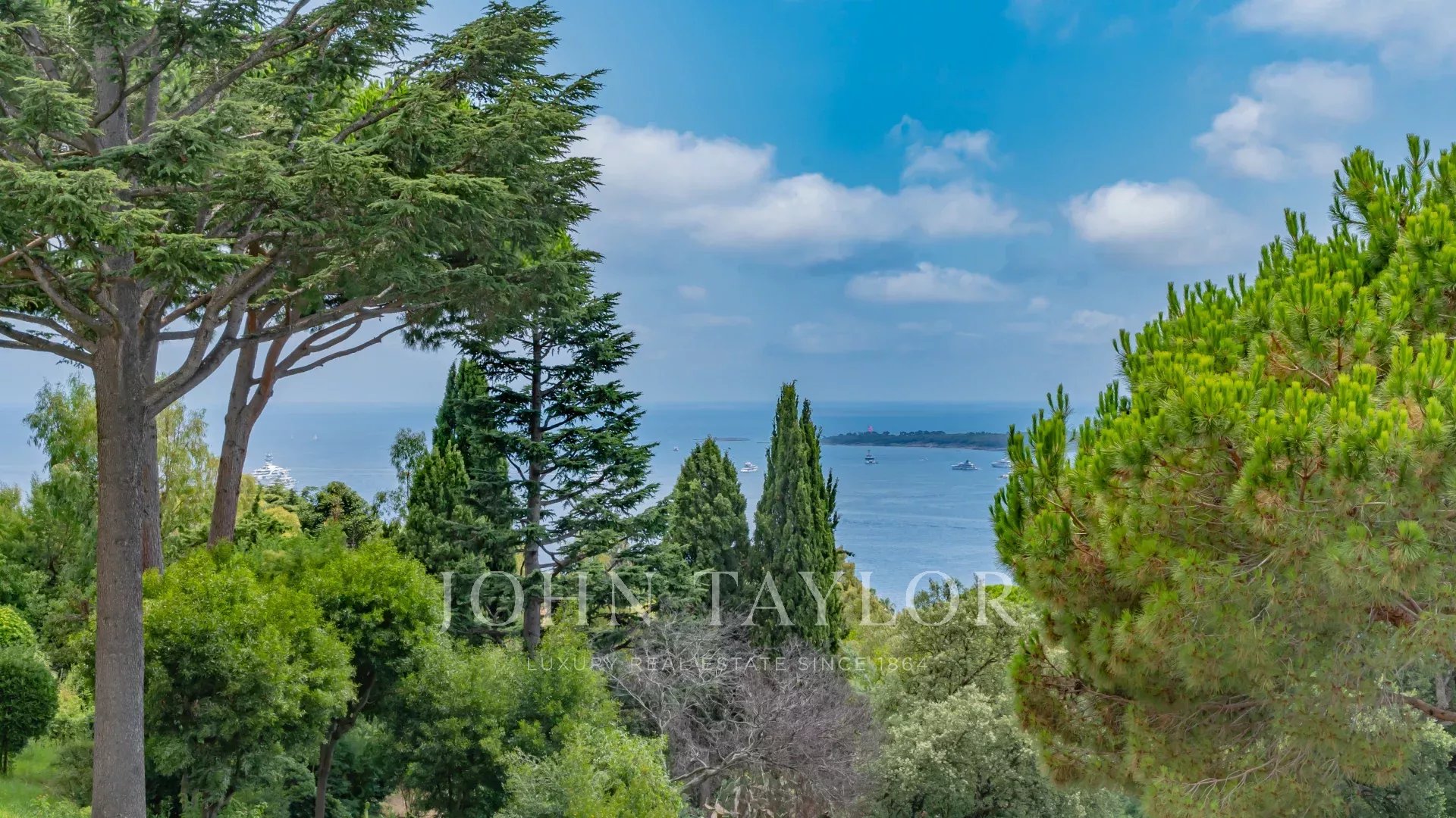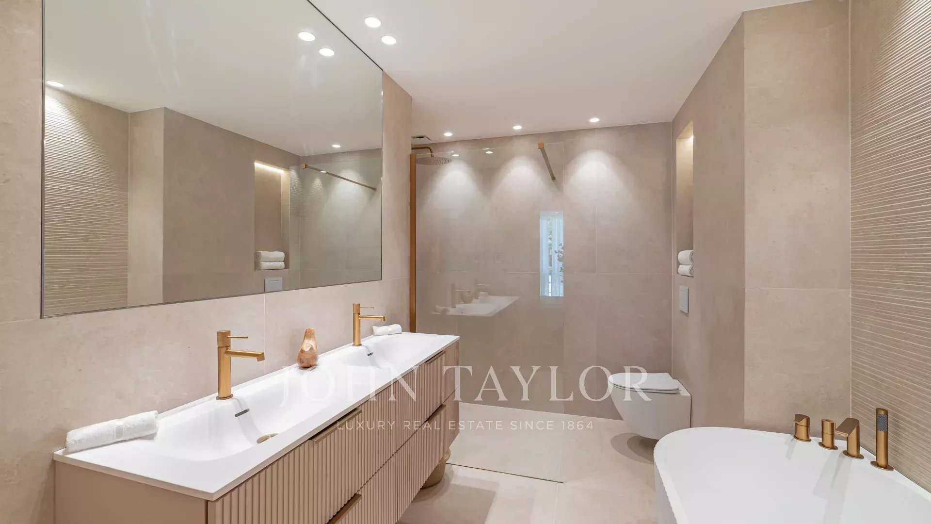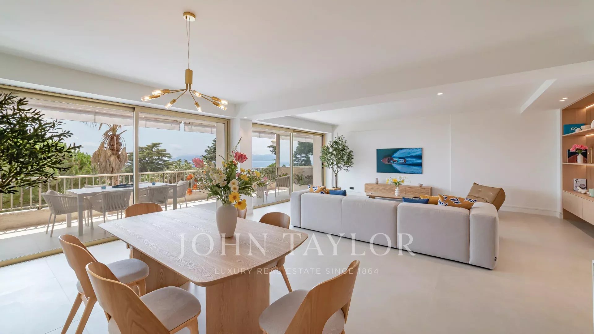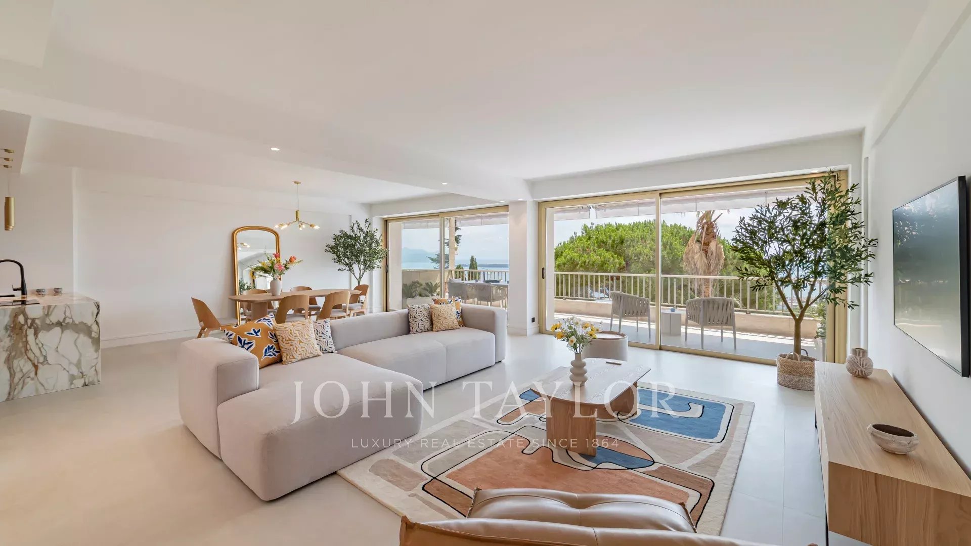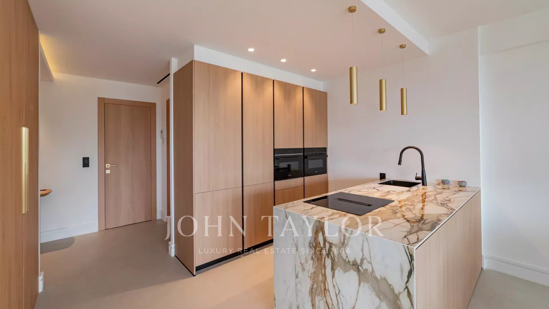 Grand séjour lumineux ouvrant sur une terrasse avec vue mer et parc, cuisine ouverte entièrement équipée, deux suites avec salle de bains en-suite. Design contemporain, finitions soignées.