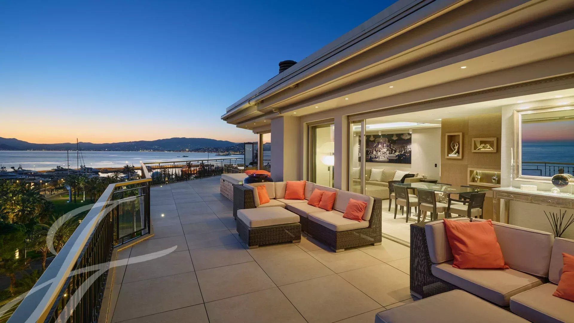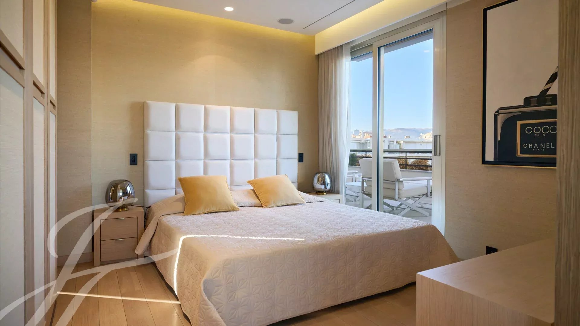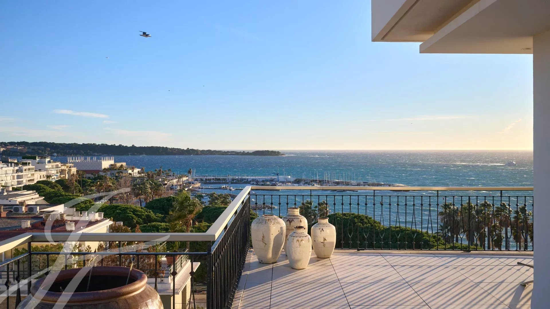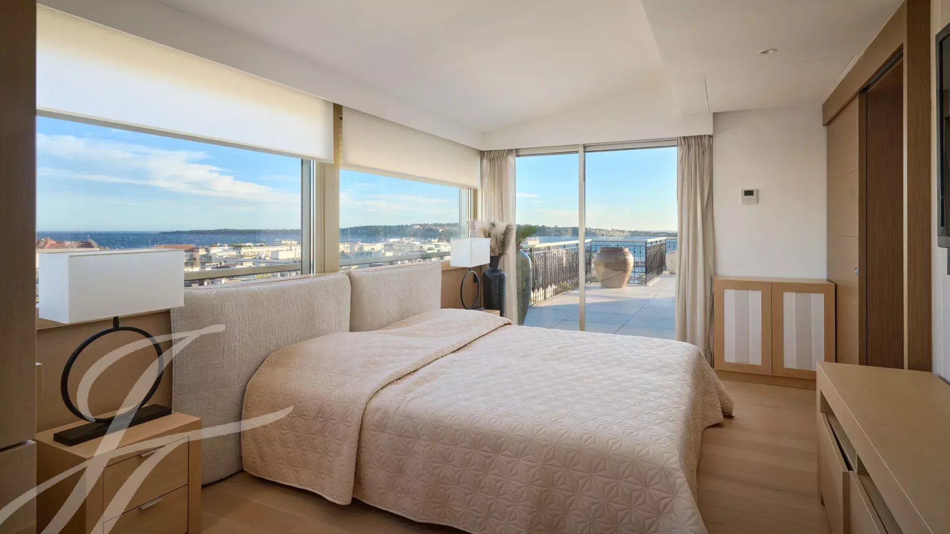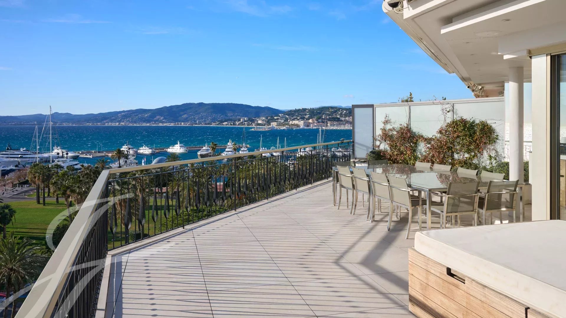 Il se compose d’un vaste séjour/salle à manger avec un espace bar et deux caves à vin, ouvrant sur une terrasse spectaculaire de 156 m², offrant une vue imprenable sur le port Canto, le Palm Beach, la baie de Cannes et les îles de Lérins. La cuisine fermée, entièrement aménagée, dispose d’un accès à une seconde terrasse. L’appartement comprend quatre chambres, dont une chambre de maître avec salle de bains et douche attenantes, ainsi qu’un accès à la terrasse avec vue mer. Une chambre supplémentaire avec salle de douche privative, et deux autres chambres partageant une salle de douche.