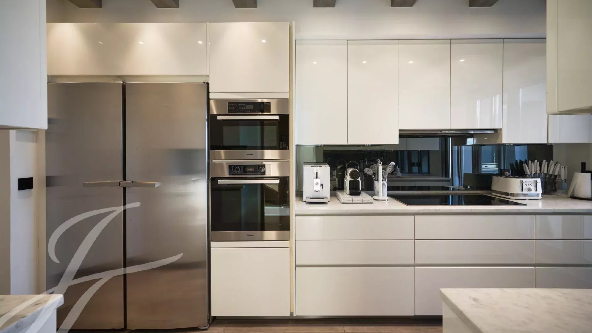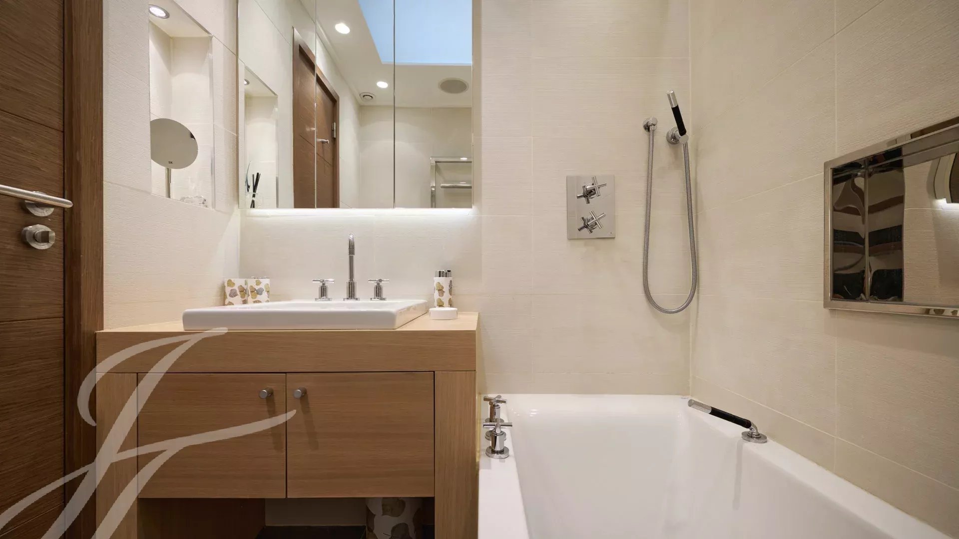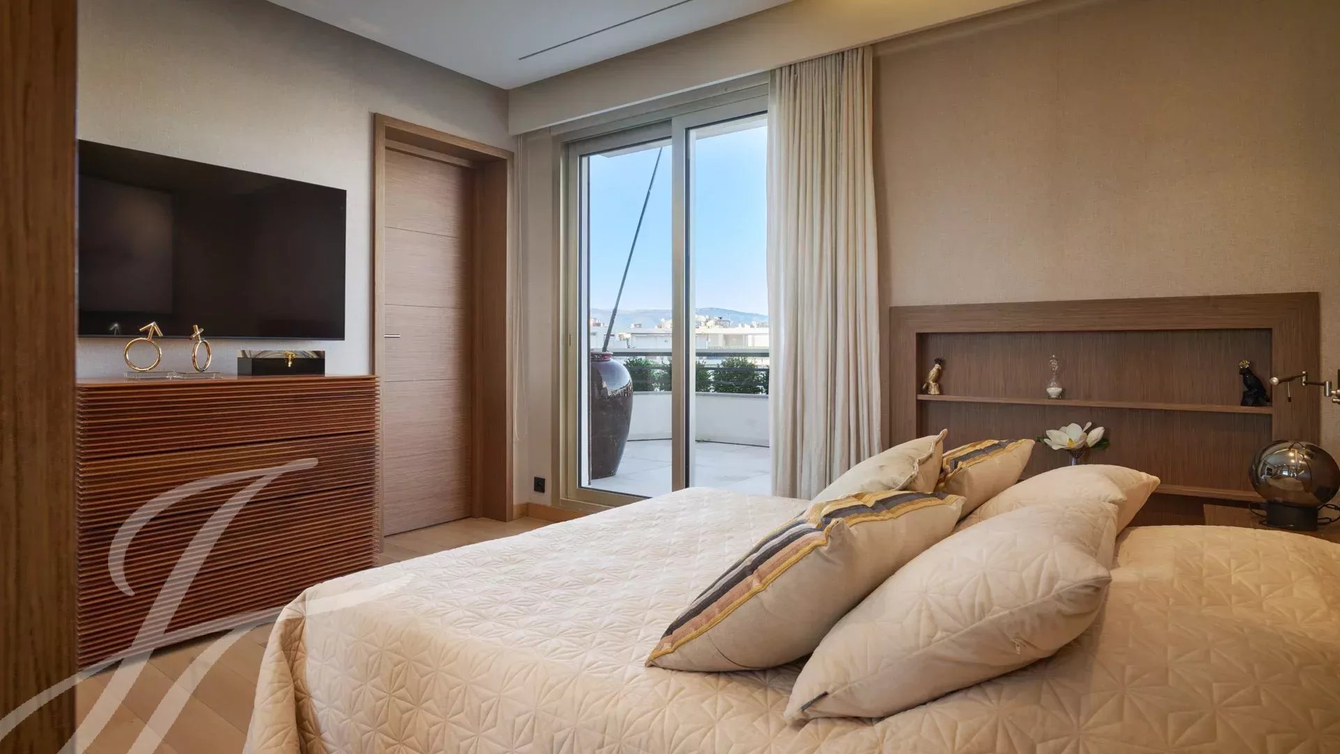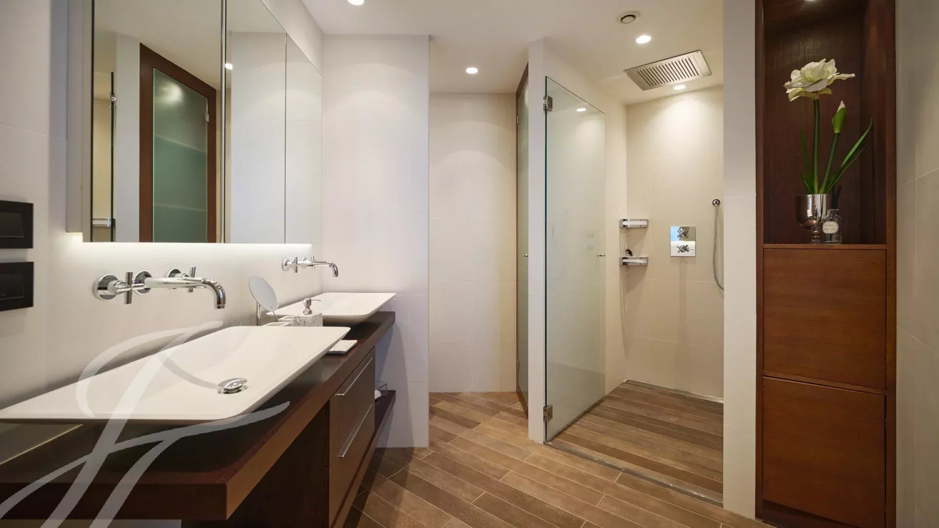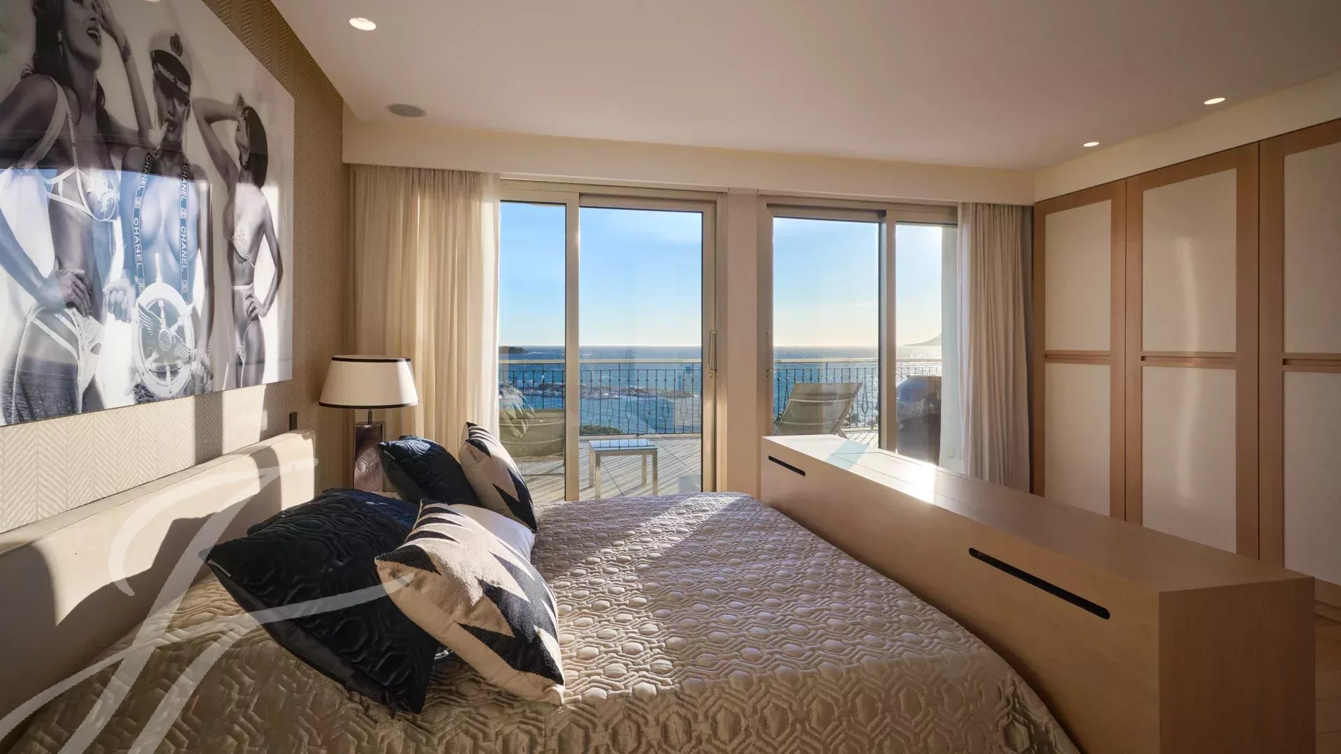 Il se compose d’un vaste séjour/salle à manger avec un espace bar et deux caves à vin, ouvrant sur une terrasse spectaculaire de 156 m², offrant une vue imprenable sur le port Canto, le Palm Beach, la baie de Cannes et les îles de Lérins. La cuisine fermée, entièrement aménagée, dispose d’un accès à une seconde terrasse. L’appartement comprend quatre chambres, dont une chambre de maître avec salle de bains et douche attenantes, ainsi qu’un accès à la terrasse avec vue mer. Une chambre supplémentaire avec salle de douche privative, et deux autres chambres partageant une salle de douche.