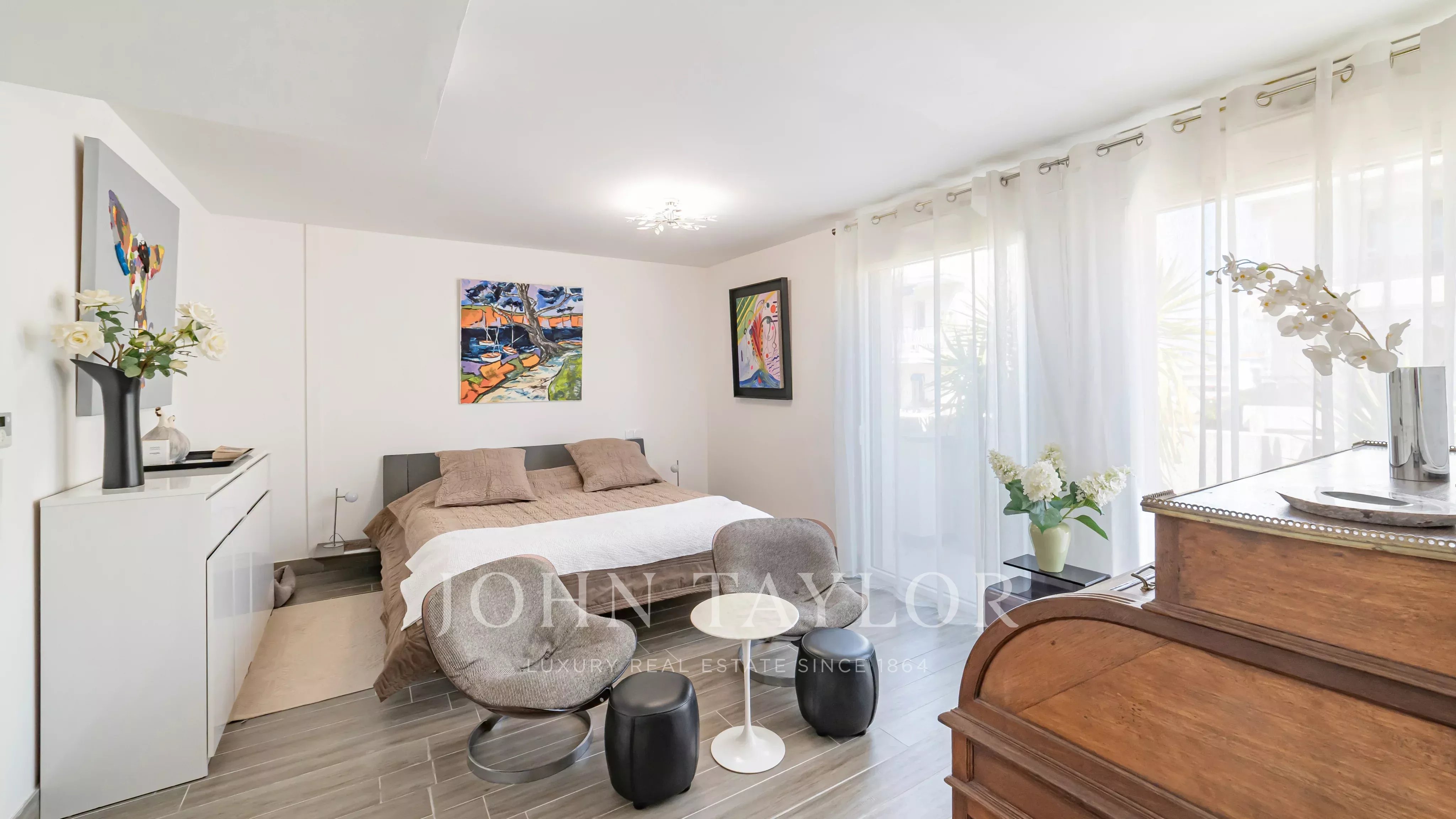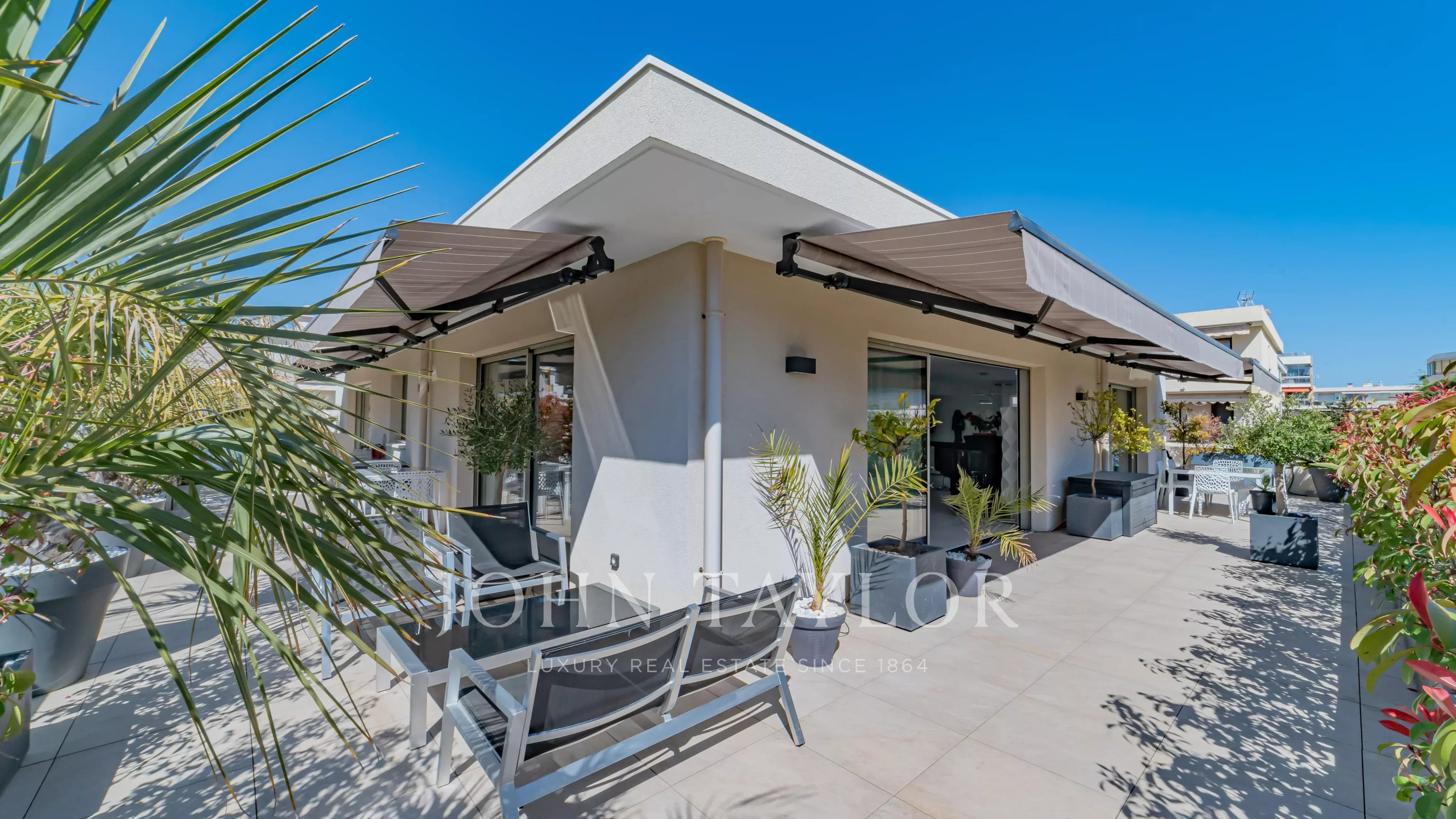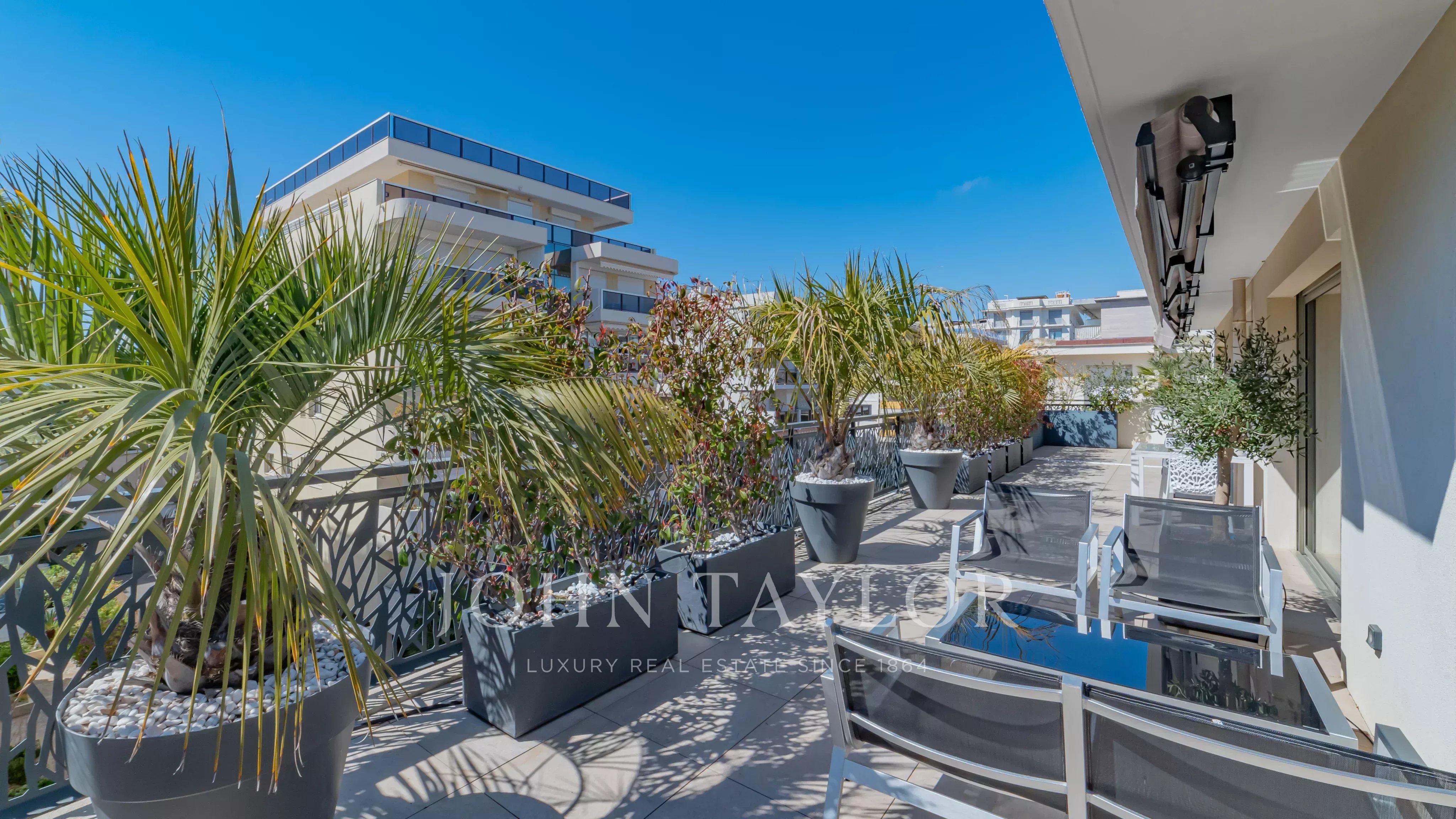 Situé en plein cœur du Palm Beach à Cannes, cette belle villa sur le toit offre de larges espaces terrasses.