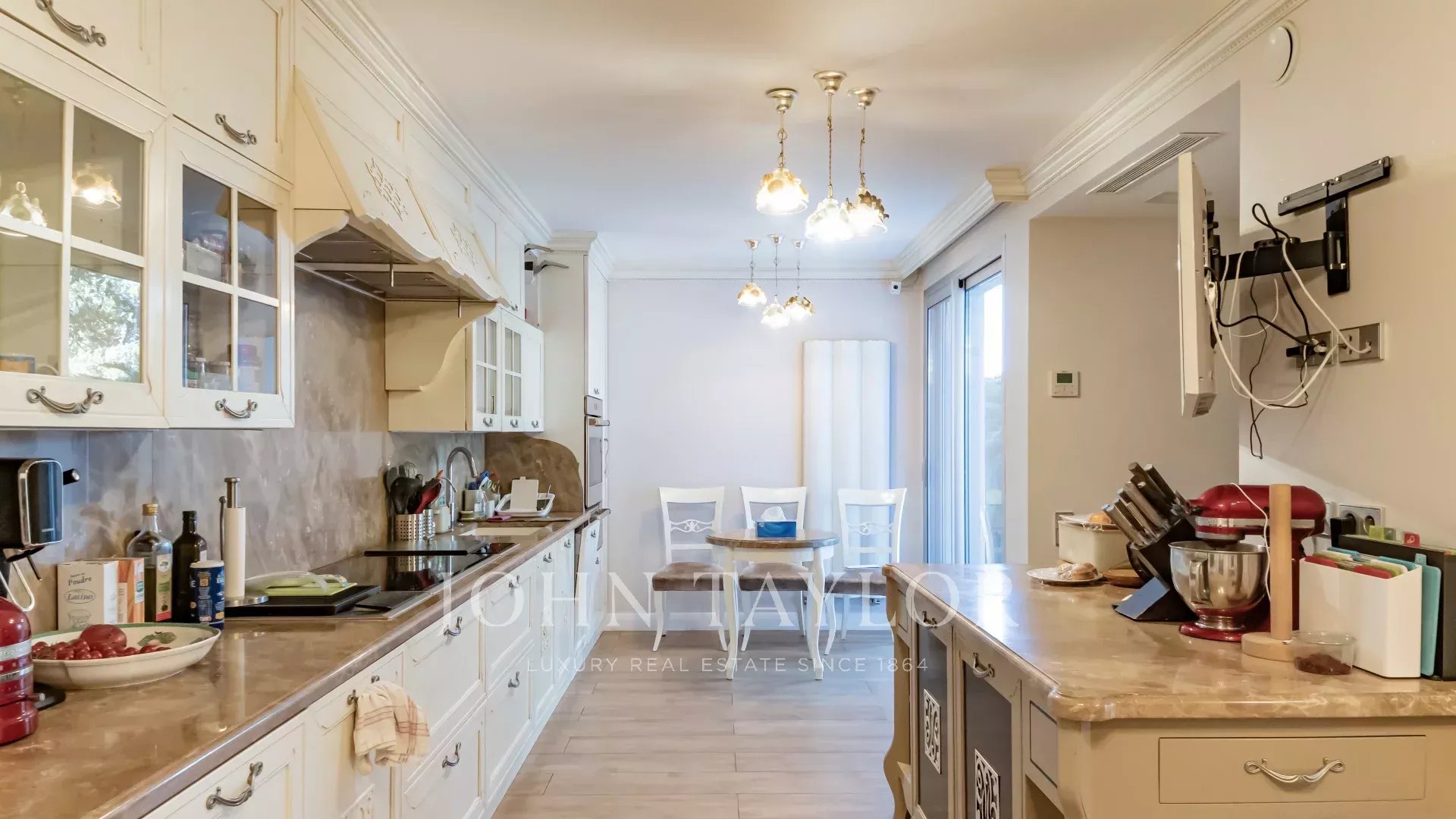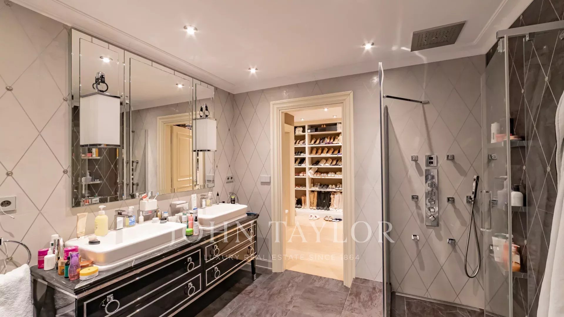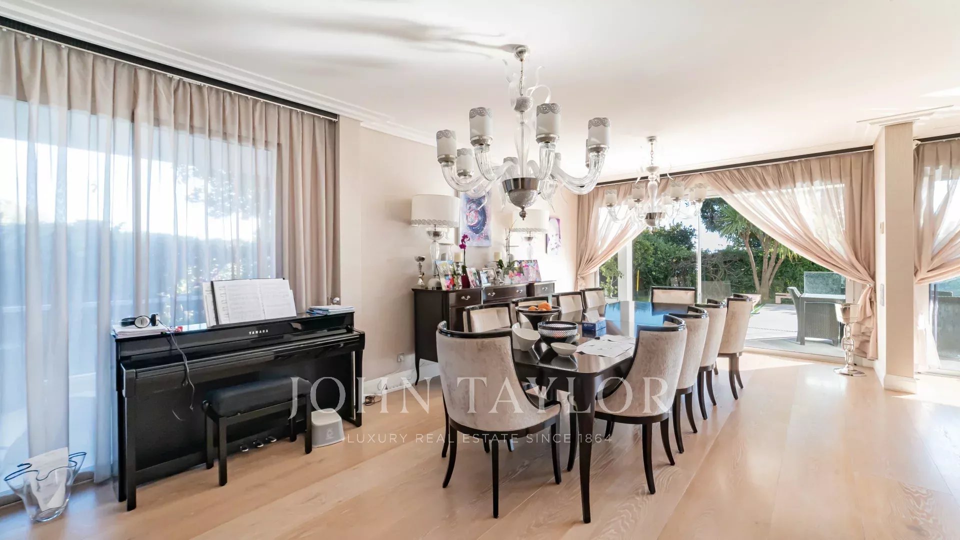 D'une superficie d'environ 425 m² répartis sur deux niveaux, il se compose, au rez-de-chaussée, d'une entrée, de deux chambres avec salles de bains attenantes, d'un séjour, d'une salle à manger, d'un salon, d'une cuisine équipée, de toilettes pour invités, d'une troisième chambre avec salle de douche, d'une quatrième chambre avec salle d'eau et d'un dressing en suite. À l'étage, on trouve un bureau, une buanderie, une chambre avec une salle de jeux et une salle d'eau, un dressing, ainsi qu'une sixième chambre avec dressing et salle d'eau.