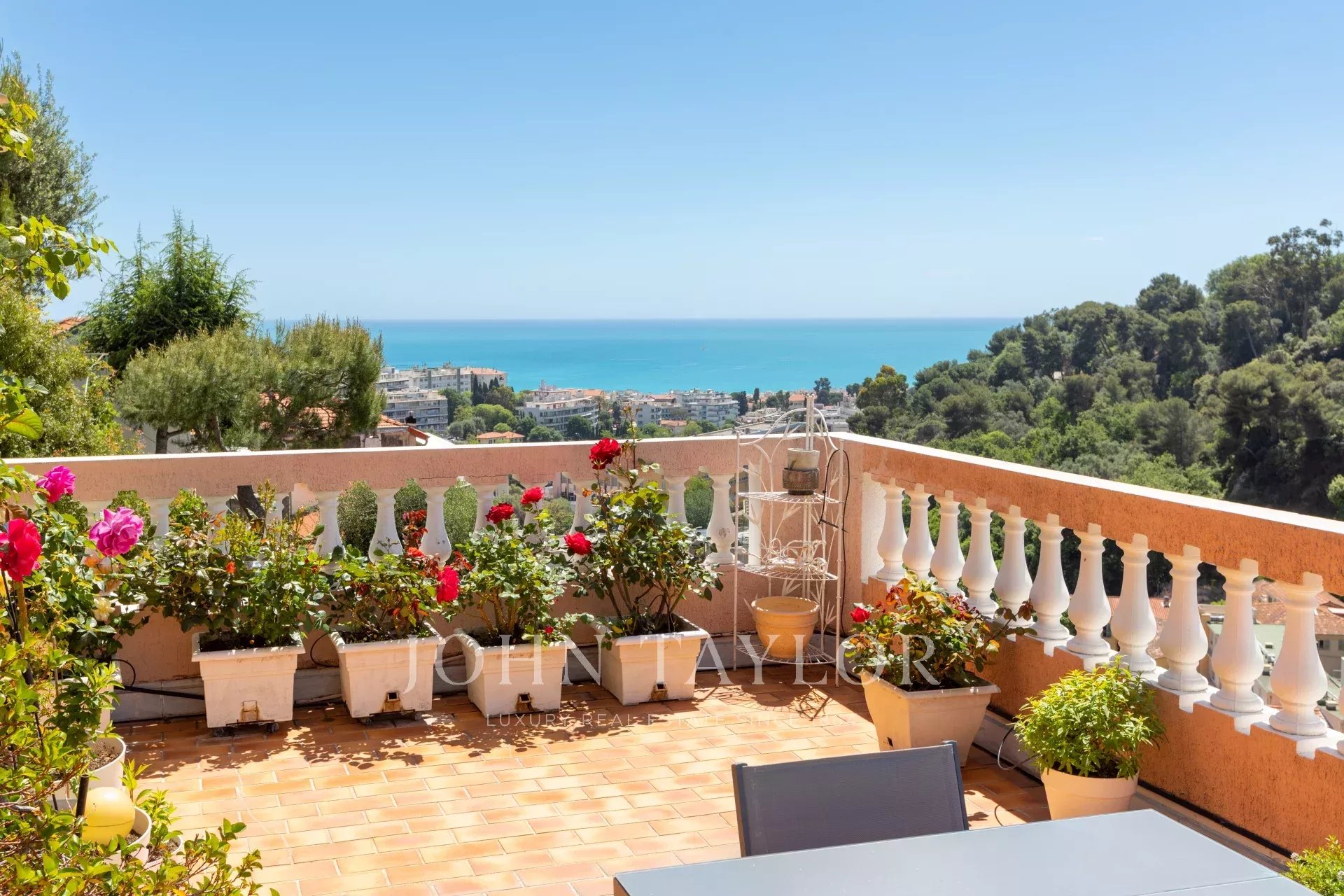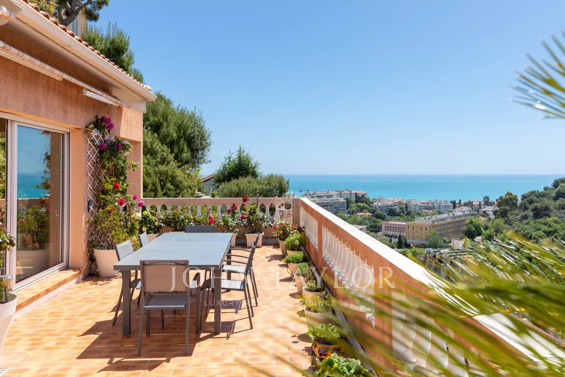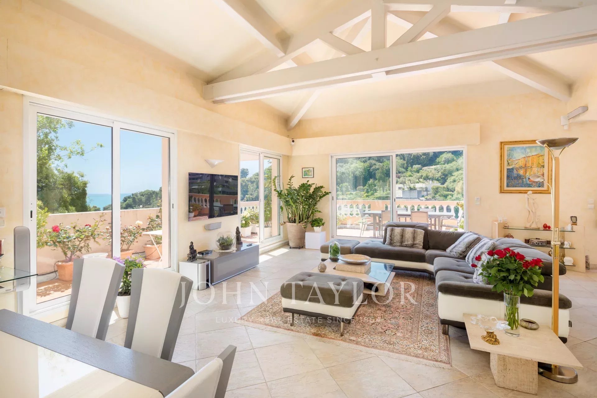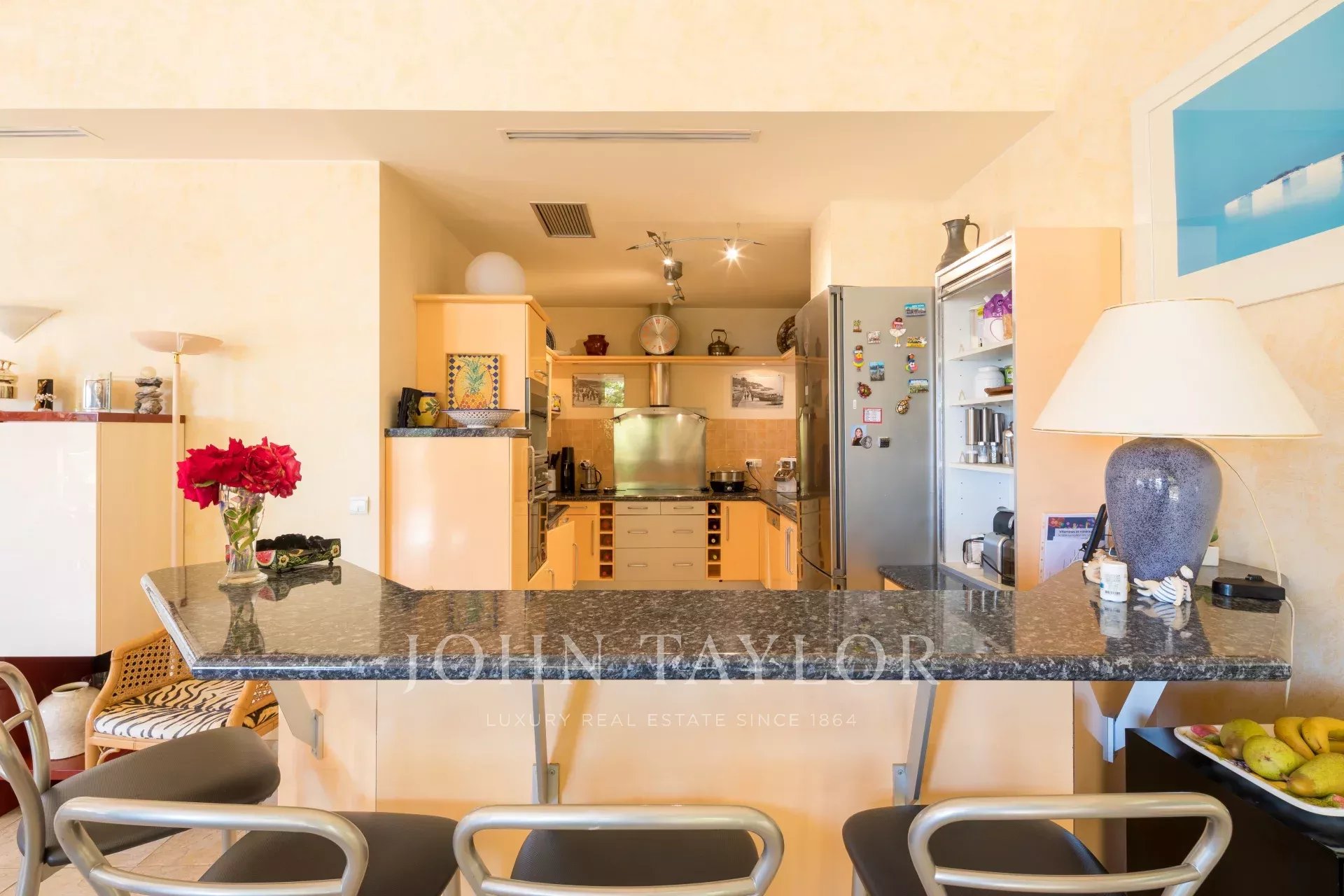 Occupant l'entier dernier étage d'une résidence à taille humaine parfaitement entretenue, exposé Sud/Ouest et entièrement climatisé, superbe appartement/villa sur le toit de 174,13 m2 Carrez, desservi directement par un ascenseur, offrant une vaste terrasse circulaire avec une très belle vue panoramique sur la mer, une partie de la ville et les collines.