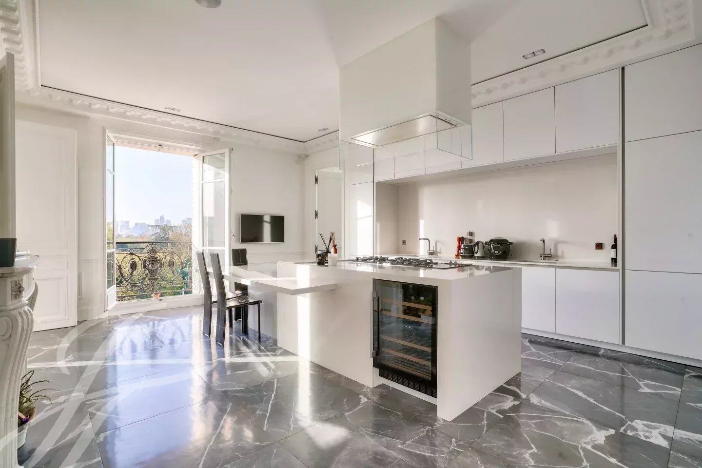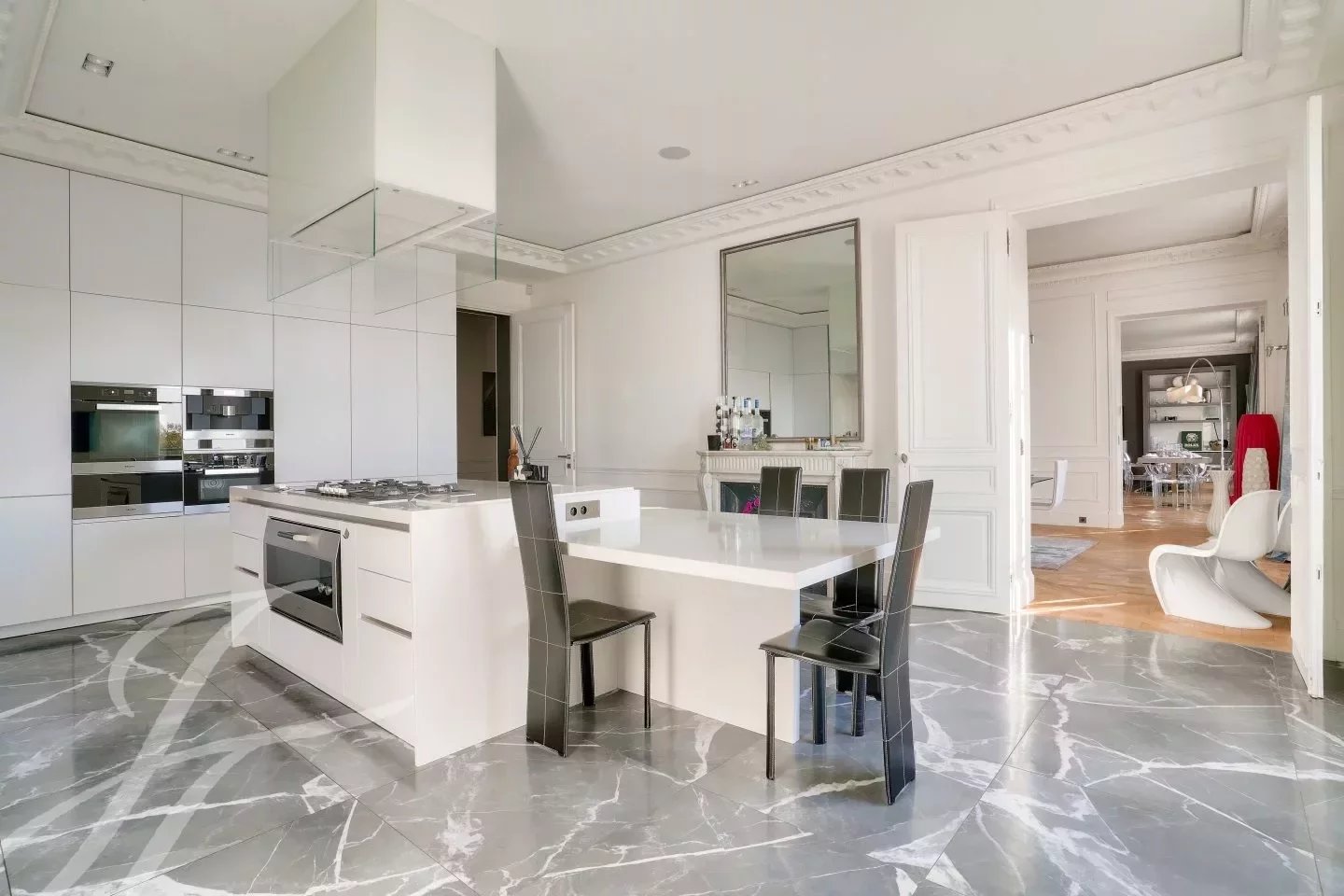 - Cuisine dînatoire aménagée et équipée haut de gamme avec cheminée en marbre