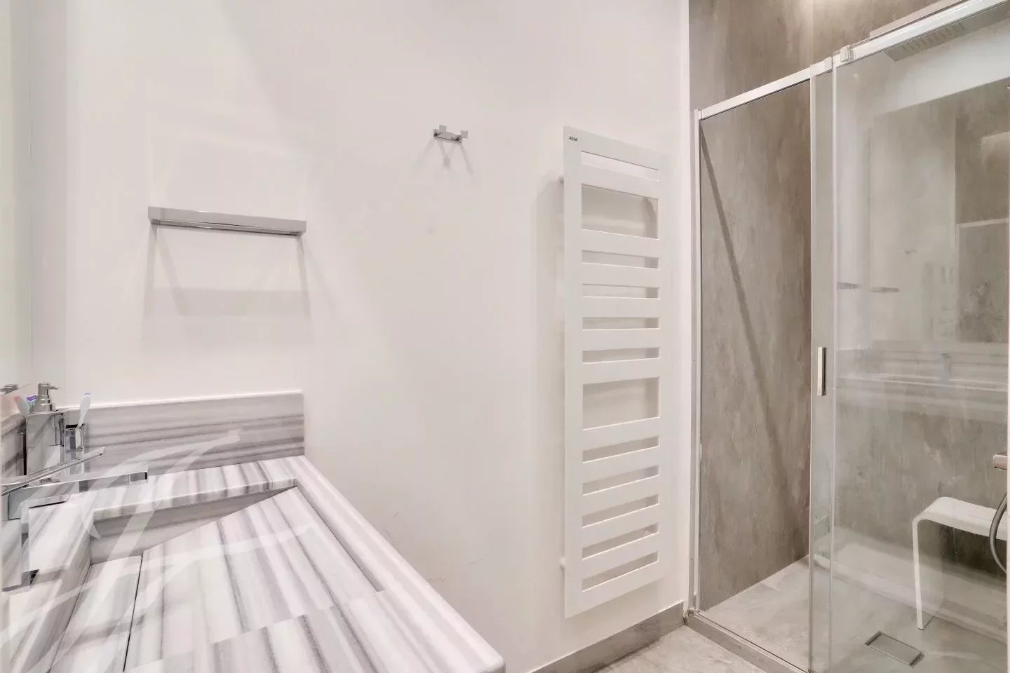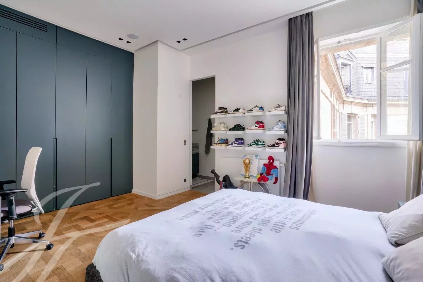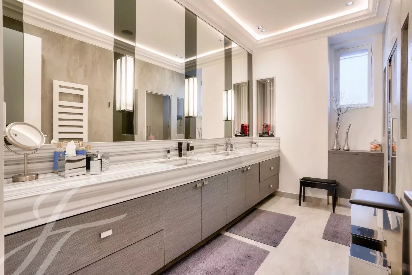 Entièrement rénové avec des matériaux haut de gamme dans un esprit contemporain tout en ayant conservé le cachet de l’ancien : parquet, moulures, cheminée.